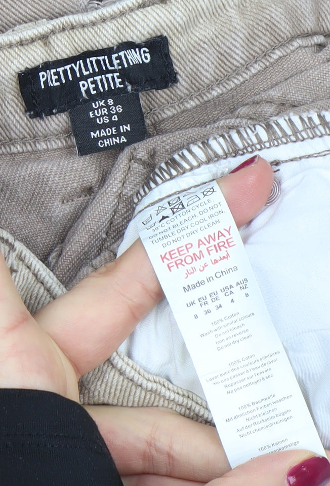 These PrettyLittleThing Petite beige distressed cargo wide-leg jeans are a bold mix of comfort and style, crafted to become your go-to piece for effortless casual outfits. Tailored for petite women, they feature a mid-rise fit that flatters the figure while offering a relaxed yet confident silhouette. The neutral beige tone delivers a versatile foundation, making them ideal for pairing with everything from graphic tees to crop tops and tailored blazers. Constructed from 100% cotton denim, these jeans are breathable and comfortable for all-day wear. The fabric has a light wash finish that adds a slightly vintage effect, while the prominent distressed rips and frayed detailing bring an edgy, lived-in vibe that aligns perfectly with modern casual trends. Practicality meets fashion with a five-pocket design and additional cargo-style pockets, offering both function and statement style. A classic button and zip fastening complete the look with a polished finish. Perfect for transitional seasons like spring, summer, and autumn, they allow plenty of ventilation and movement. These jeans are machine washable for easy care and maintenance. The relaxed, wide-leg cut creates a flattering drape and is easy to style with chunky trainers, heels, or sandals. Whether you're heading out for a weekend brunch, a relaxed festival look, or a daytime outing, these jeans offer exceptional comfort and effortless edge. In very good pre-owned condition, with only minor fading consistent with gentle use, they represent excellent value. Designed for the confident modern woman who values both comfort and statement design, these PrettyLittleThing distressed cargo jeans are a wardrobe essential that promises to elevate your off-duty style with ease and versatility.