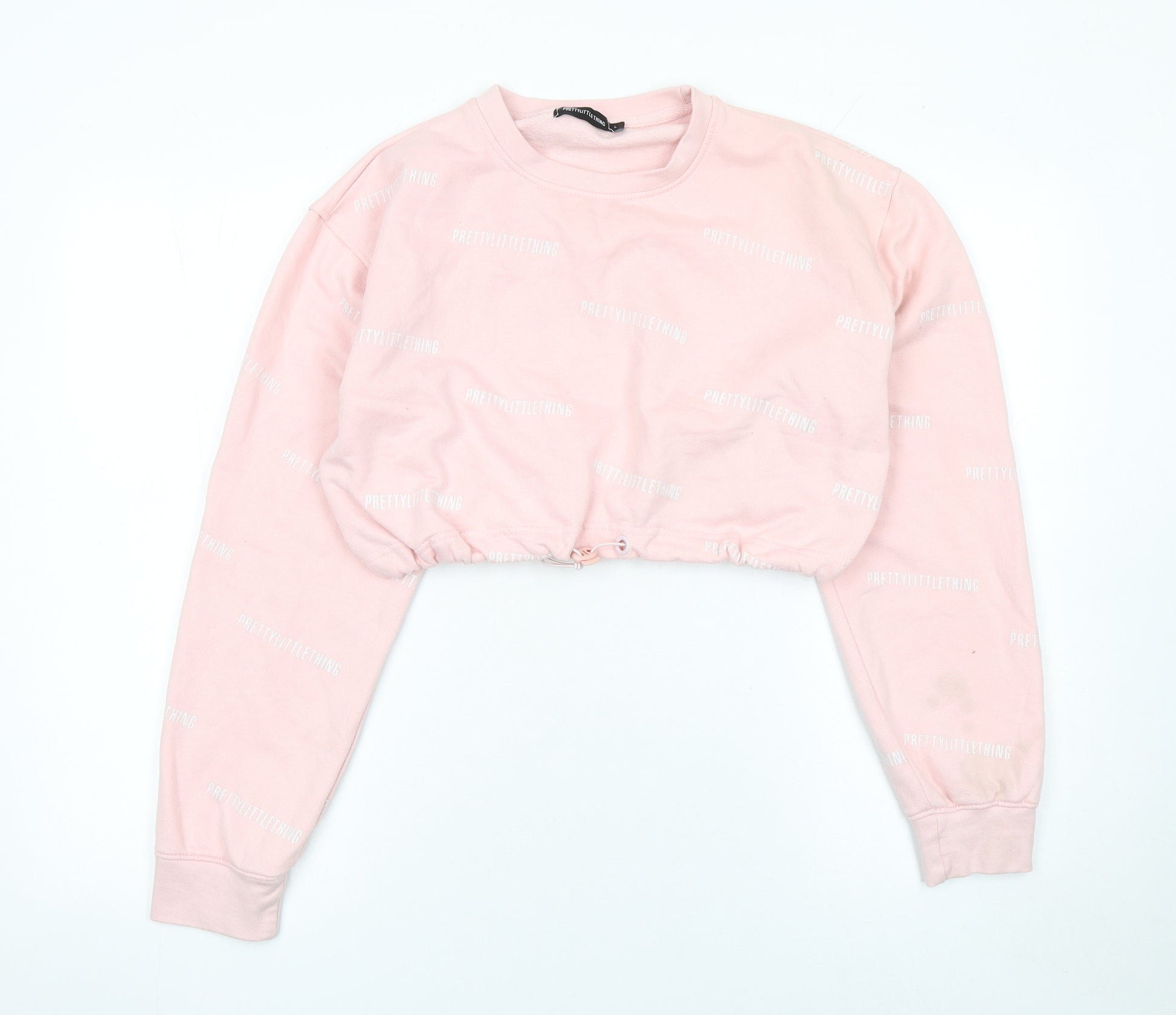 Step up your casual wardrobe with this chic PrettyLittleThing cropped sweatshirt in a soft pastel pink hue. Designed for modern women who appreciate comfort and style, this relaxed-fit pullover is crafted from a soft cotton-polyester jersey blend, providing the perfect balance of breathability, comfort, and durability. The sweatshirt showcases an all-over logo print pattern, adding a touch of signature branding that makes it unmistakably PrettyLittleThing.The piece features a drawstring-hem cropped waist, allowing for a slightly adjustable fit that accentuates your silhouette while maintaining a laid-back, streetwear-inspired look. The crew neck and long sleeves make it ideal for layering during the cooler spring and autumn seasons, while the lightweight feel makes it versatile enough for year-round wear. Ribbed cuffs help retain the shape and add extra comfort during wear.Whether you’re pairing it with high-waisted jeans, leggings, or joggers, this pullover sweatshirt easily transitions from lounging at home to casual outings. Its soft pastel shade complements a range of colours and styles, giving it timeless appeal. The relaxed fit and elastic hemline provide effortless comfort, perfect for running errands, meeting friends, or casual days on campus.Though gently pre-owned, it remains in good condition and ready to wear, with only a small mark on the sleeve noted. This small imperfection does not detract from its overall stylish appearance or wearability. Offering the same on-trend cropped silhouette found in new season high-street collections, this PrettyLittleThing sweatshirt is a great way to elevate your off-duty fashion game at a fraction of the retail price.With its signature branding and soft pink tone, this sweatshirt embodies PrettyLittleThing’s effortlessly cool aesthetic—perfect for those who love fashion with a feminine, sporty edge. Grab it now to add a contemporary, comfortable, and statement-making piece to your casual wardrobe.