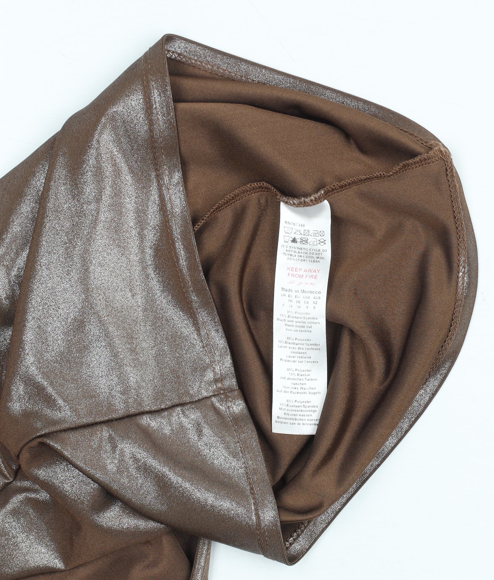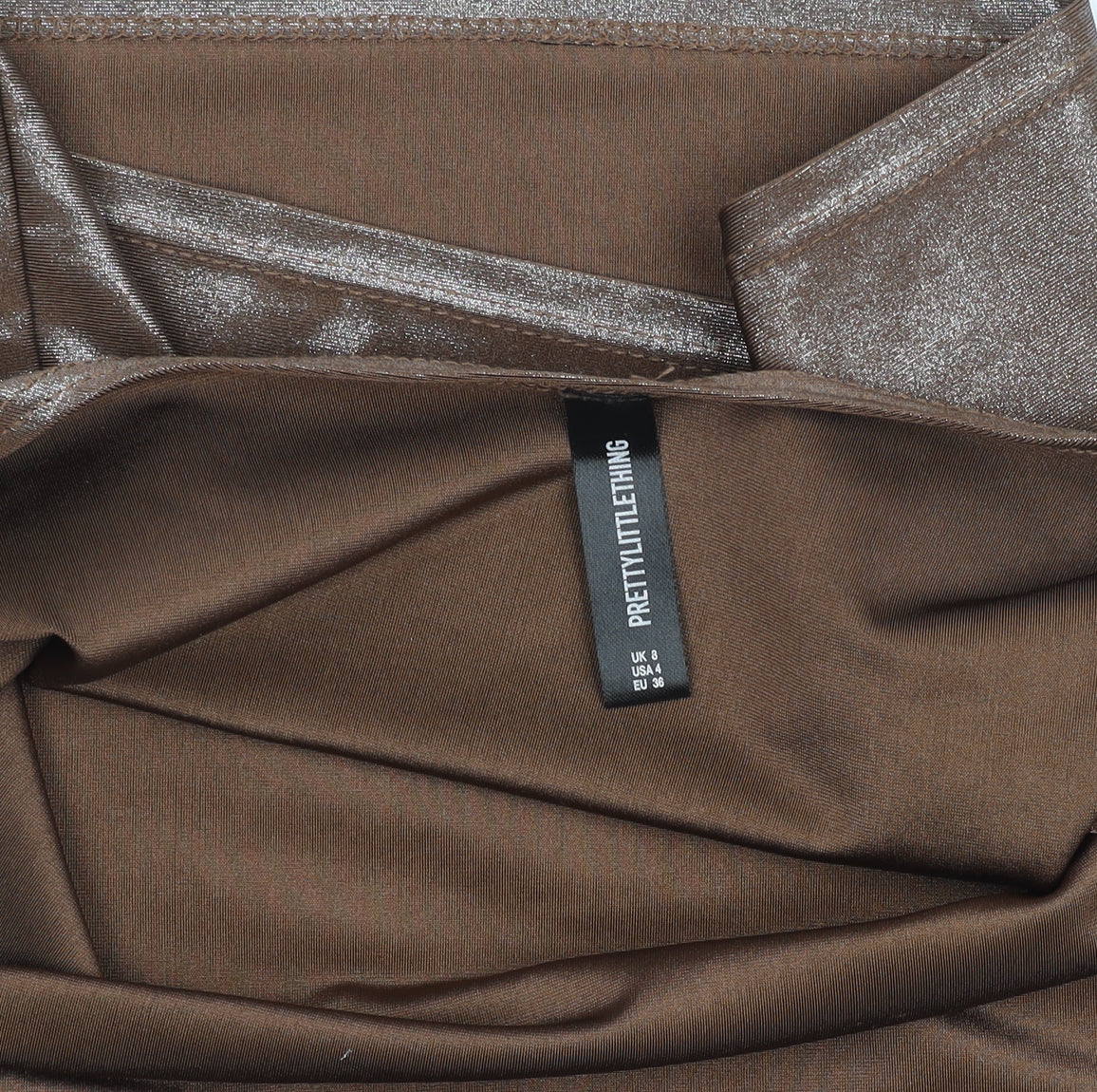 Elevate your going-out wardrobe with this chic PrettyLittleThing women’s brown sleeveless camisole top. Crafted from a soft, stretchy jersey blend of polyester and elastane, this slim-fit design flatters the silhouette while providing lightweight comfort perfect for summer evenings. The shimmering metallic brown fabric delivers a dazzling yet sophisticated finish, giving a subtle glow under the lights for your next party or night out.Designed with a wide boat neckline and sleek pullover style, this top is easy to wear and pair with your favourite high-waisted jeans, skirts, or tailored trousers. Its versatile design makes it an ideal choice for party and cocktail occasions, offering both comfort and an elegant edge. The smooth jersey fabric ensures a close fit that highlights your natural shape, while the metallic sheen adds a trendy statement touch—ideal for fashion-conscious women seeking to make an impression.This PrettyLittleThing piece embodies the brand’s modern, bold aesthetic. The sleeveless structure keeps it breezy and perfect for warmer weather. Despite being pre-loved, it remains in excellent condition with no visible flaws, showcasing minimal signs of wear. Machine washable for easy garment care, this top is as practical as it is stylish.Whether styled with heels for an evening out or dressed down with sneakers for a casual summer day, this brown metallic camisole from PrettyLittleThing adds a touch of luxury sparkle to any ensemble. Simple, stylish, and effortlessly eye-catching, it’s a must-have addition to any fashion-forward wardrobe seeking a versatile top that transitions seamlessly from day to night. Add this distinctive piece to your collection and enjoy its flattering fit, lightweight feel, and contemporary shine season after season.
