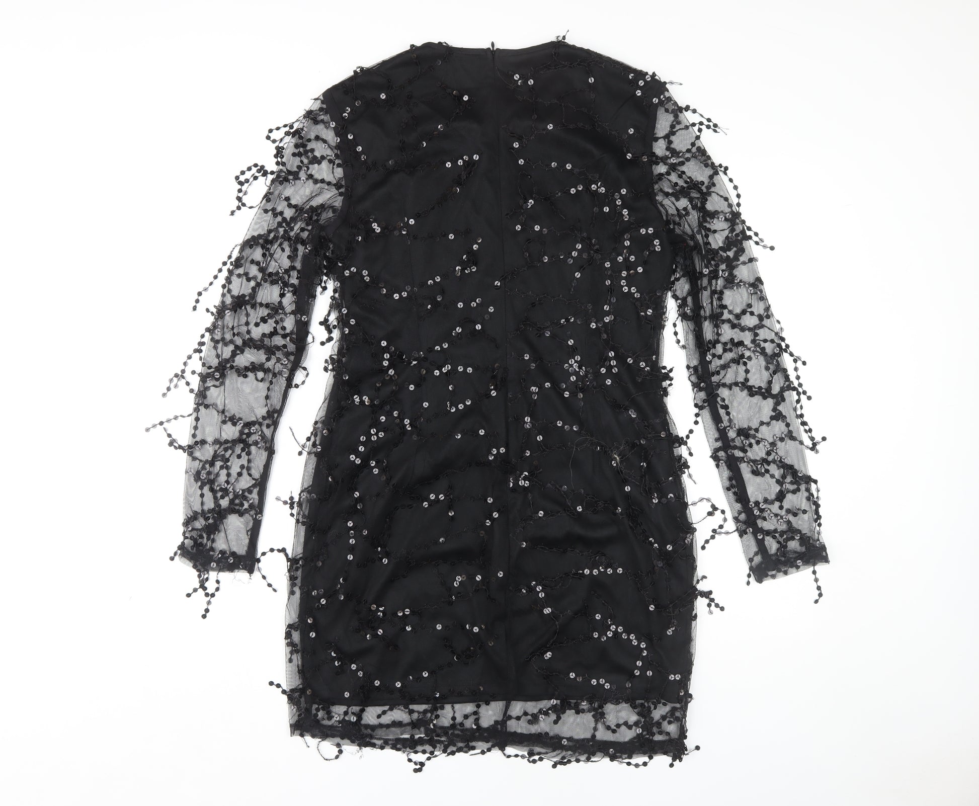 Make a stunning entrance with this PrettyLittleThing bodycon dress. Crafted in a chic black hue, it's adorned with striking sequins for that extra sparkle at parties and special events. This dress is designed in a short length, perfect for flaunting your style, with long sleeves to keep you warm during the cooler autumn and winter months. The round neckline is versatile and pairs well with your favourite accessories. With its 100% polyester construction, the fabric is both durable and comfortable, while the lining ensures a smooth fit. The zip closure at the back allows for easy dressing, saving you from any party preparation hassle. Whether you're heading to a sophisticated cocktail evening or a lively party, this dress is your go-to choice for making a fashionable impression. Perfectly suited for women who love to make a statement while ensuring comfort and style. Hand wash only to maintain the delicate sequin embellishments. A brand new condition with tags attached, this dress ensures you'll feel as wonderful as you look.