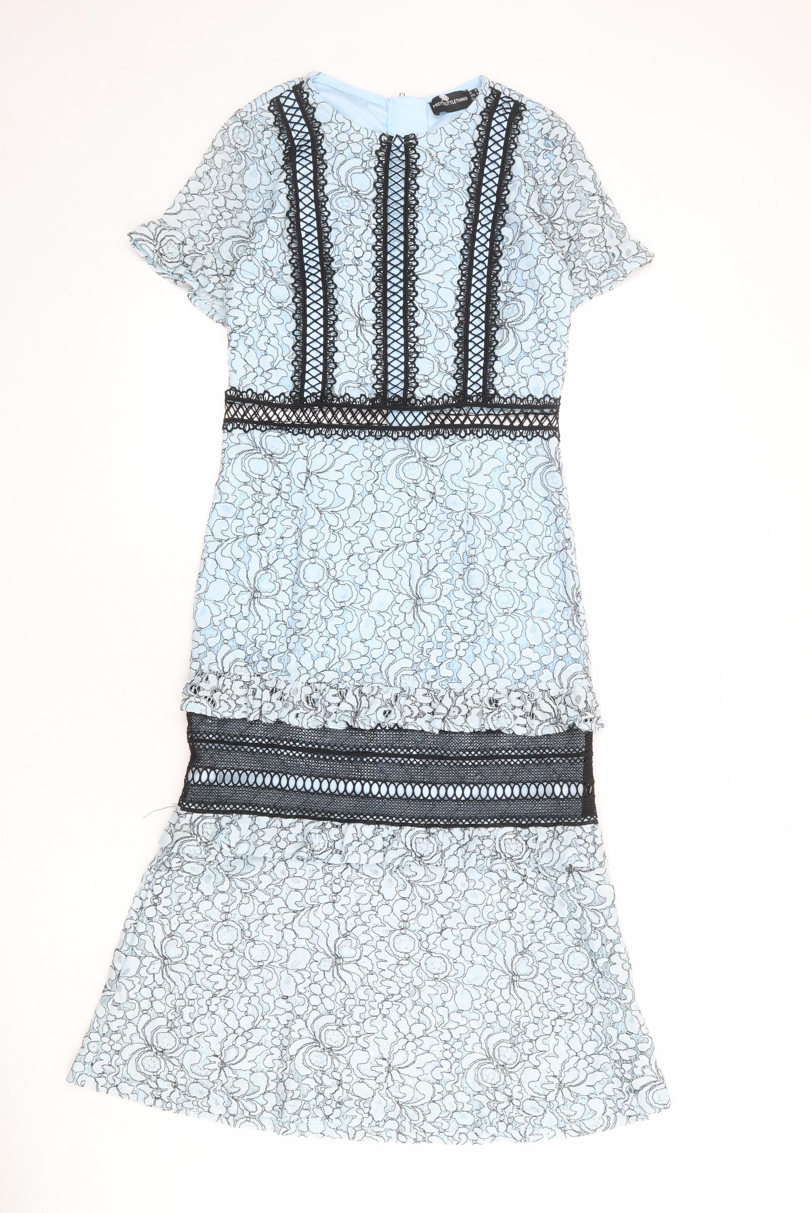 Womens Blue Floral Polyester A-Line Size 8 Round Neck Zip