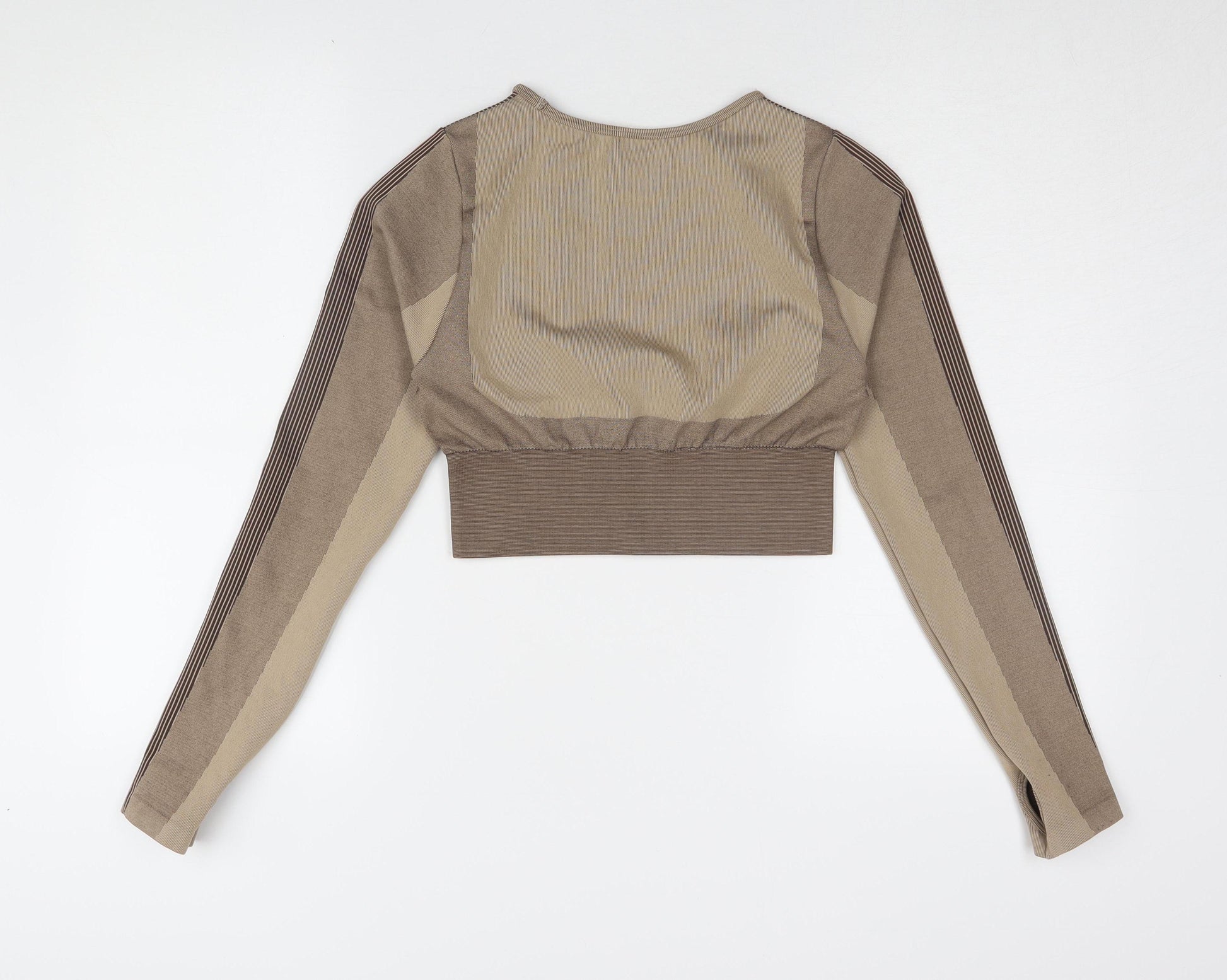 This PrettyLittleThing Women's Brown Cropped Pullover Top is perfect for adding a stylish touch to your activewear collection. Made from a comfortable blend of 92% Polyamide and 8% Elastane, it offers a flattering athletic fit. Ideal for gym sessions or casual outings, its versatile design features a classic crew neck, long sleeves, and a solid pattern. Though lightly worn and without original tags, it's in excellent condition. Perfect for pairing with leggings or jeans, this machine-washable top is ready to become a staple in your wardrobe.