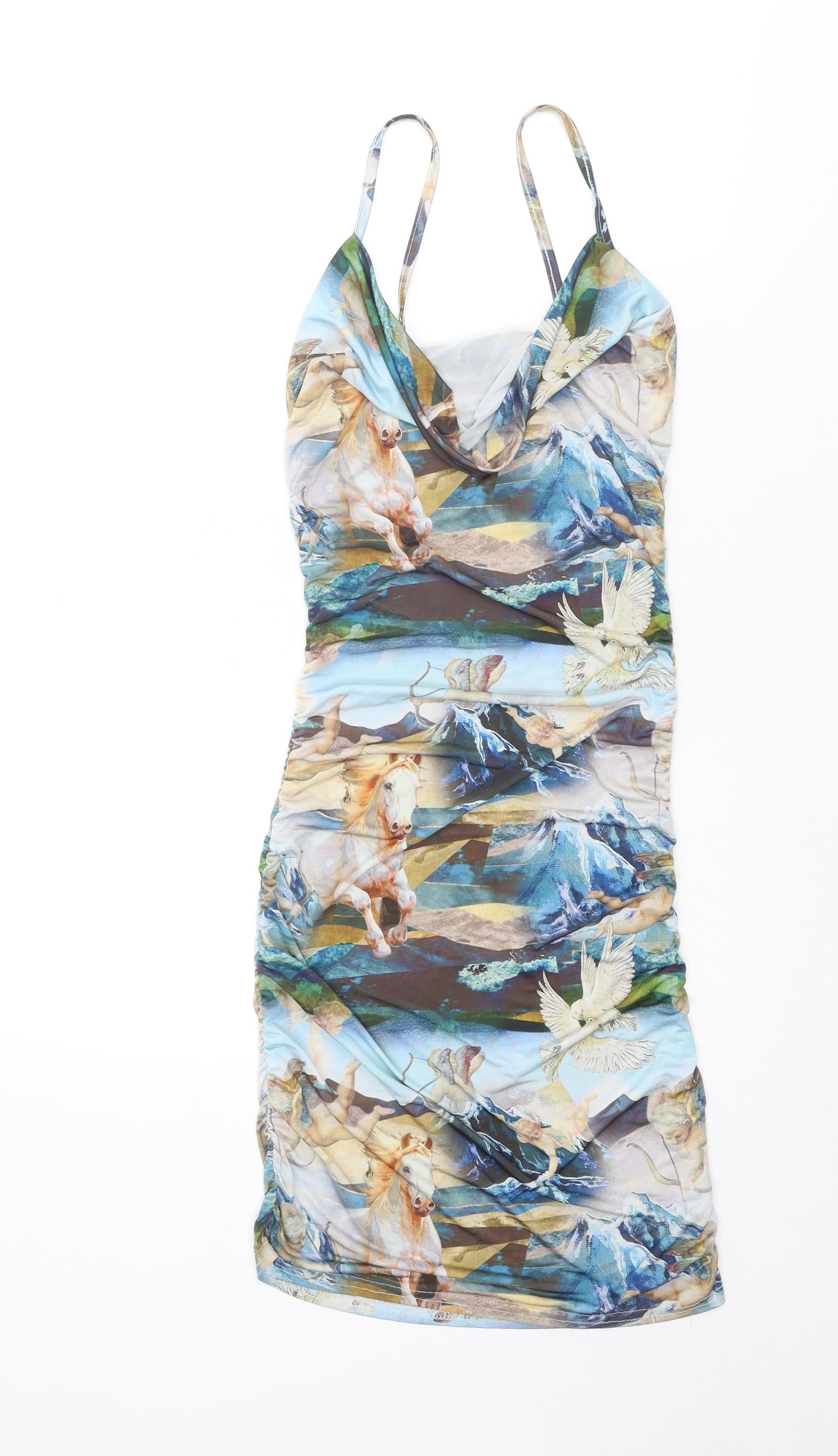 PRETTYLITTLETHING Womens Multicoloured Geometric Viscose Tank Dress Size 6 Halter Tie - Scoop Back