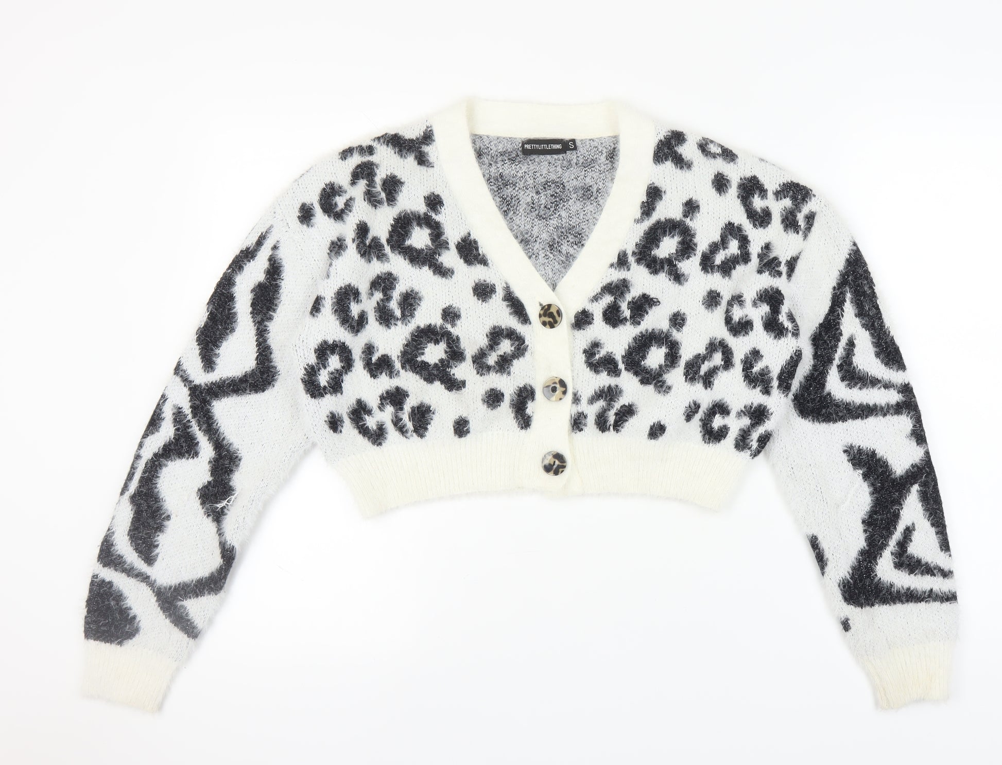 Step into style with this PrettyLittleThing Women's White Animal Print Cardigan. Perfect for casual outings or cosy days at home, this cardigan boasts a trendy animal print that adds a touch of wild sophistication to your outfit. The V-neckline and button accents contribute to its chic and modern design, making it an ideal addition to your autumn and winter wardrobe.Crafted from soft acrylic fabric, it promises both comfort and warmth during the cooler months. Its long sleeves and lightweight nature ensure it can be paired effortlessly with various tops, tailored to your personal style preferences.Available in size S, this cardigan features a regular fit that complements most body types. Its stylish and versatile appeal makes it a standout choice for fashion-forward ensembles. Embrace the fashion-forward animal print that aligns with seasonal trends ensuring you're always stepping out in style.Ideal for casual occasions, this cardigan is perfect for a day out shopping, coffee with friends, or simply lounging in style. This piece demonstrates PrettyLittleThing's commitment to combining fashion with comfort, providing a versatile option for your clothing collection.Let the distinctive style of this cardigan elevate your wardrobe, becoming a go-to option for adding flair to any outfit. Whether layered over a dress or paired with jeans, this cardigan is set to become a staple in your closet.
