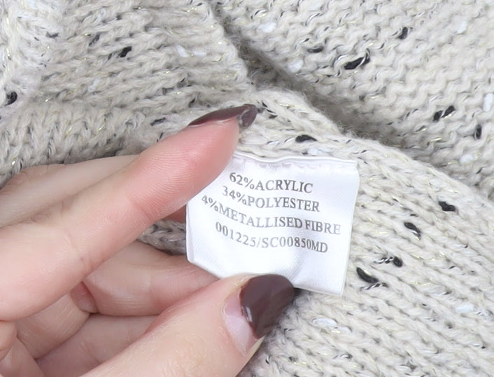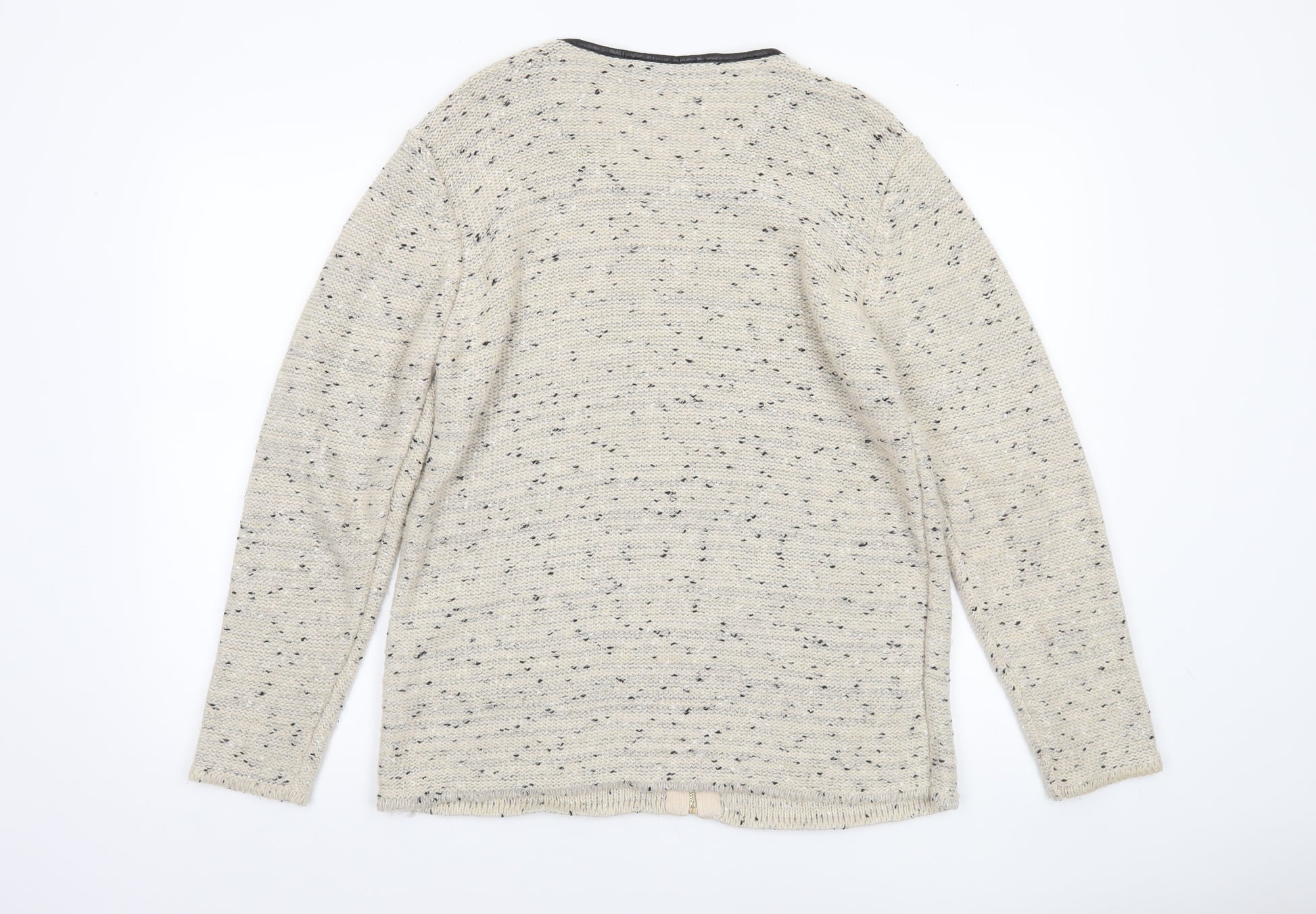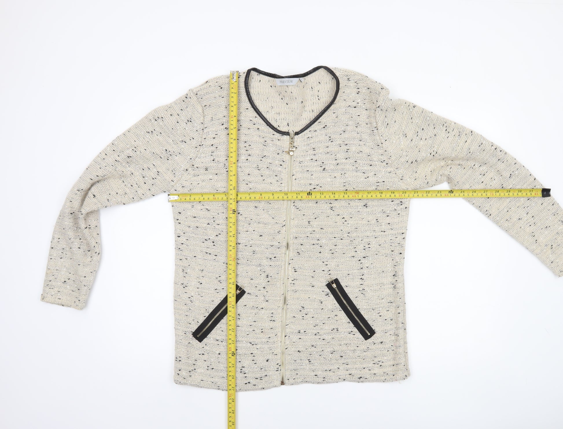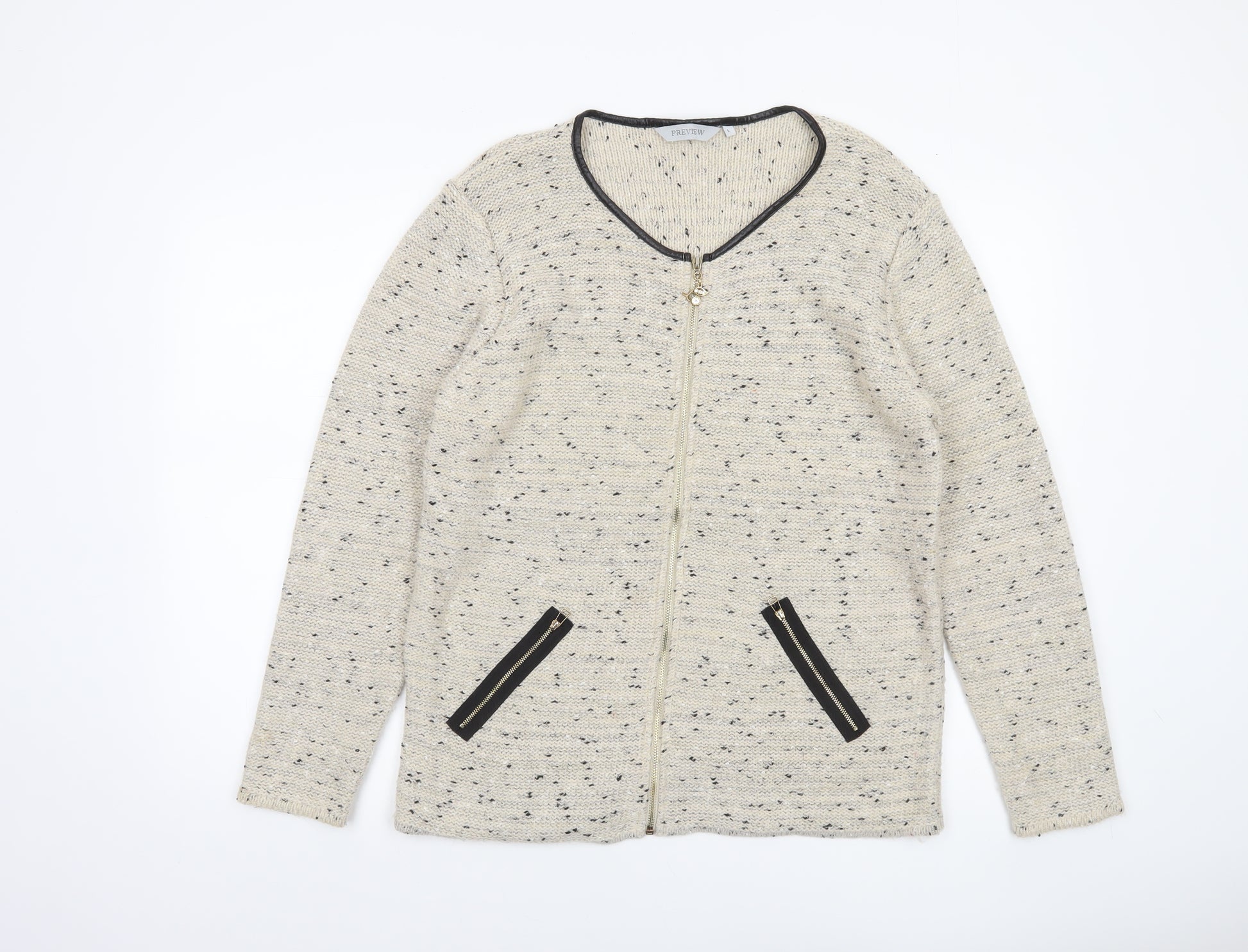 Elevate your knitwear collection with this elegant women’s cardigan by Preview. Crafted in a beautifully textured beige knit with subtle speckled details, this piece combines comfort and understated sophistication in one. Designed with a flattering round neckline trimmed in contrasting black faux leather and featuring sleek, angled zip pockets, it brings a touch of modern refinement to your Autumn and Winter wardrobe. The full front zip closure makes it easy to layer over blouses or tops, seamlessly transitioning from casual days out to cosy evenings indoors. Made from a soft and lightweight blend of acrylic and polyester, with a hint of metallised fibre for a delicate shimmer, this cardigan feels both warm and breathable. Its long sleeves and regular fit offer flattering coverage and a comfortable shape that complements most silhouettes. Whether paired with jeans for an effortless casual look or layered over a dress for a dressed-up ensemble, it ensures lasting wearability and style versatility.In excellent pre-loved condition, this cardigan shows minimal signs of wear with no visible flaws, snagging or pulls. It maintains its structure and quality, ready to offer plenty of life to its next owner. Ideal for women who value classic style with a contemporary twist, this Preview cardigan is a wardrobe essential for the transitional seasons. Add this chic piece to your collection today for a refined yet relaxed touch to your everyday attire.
