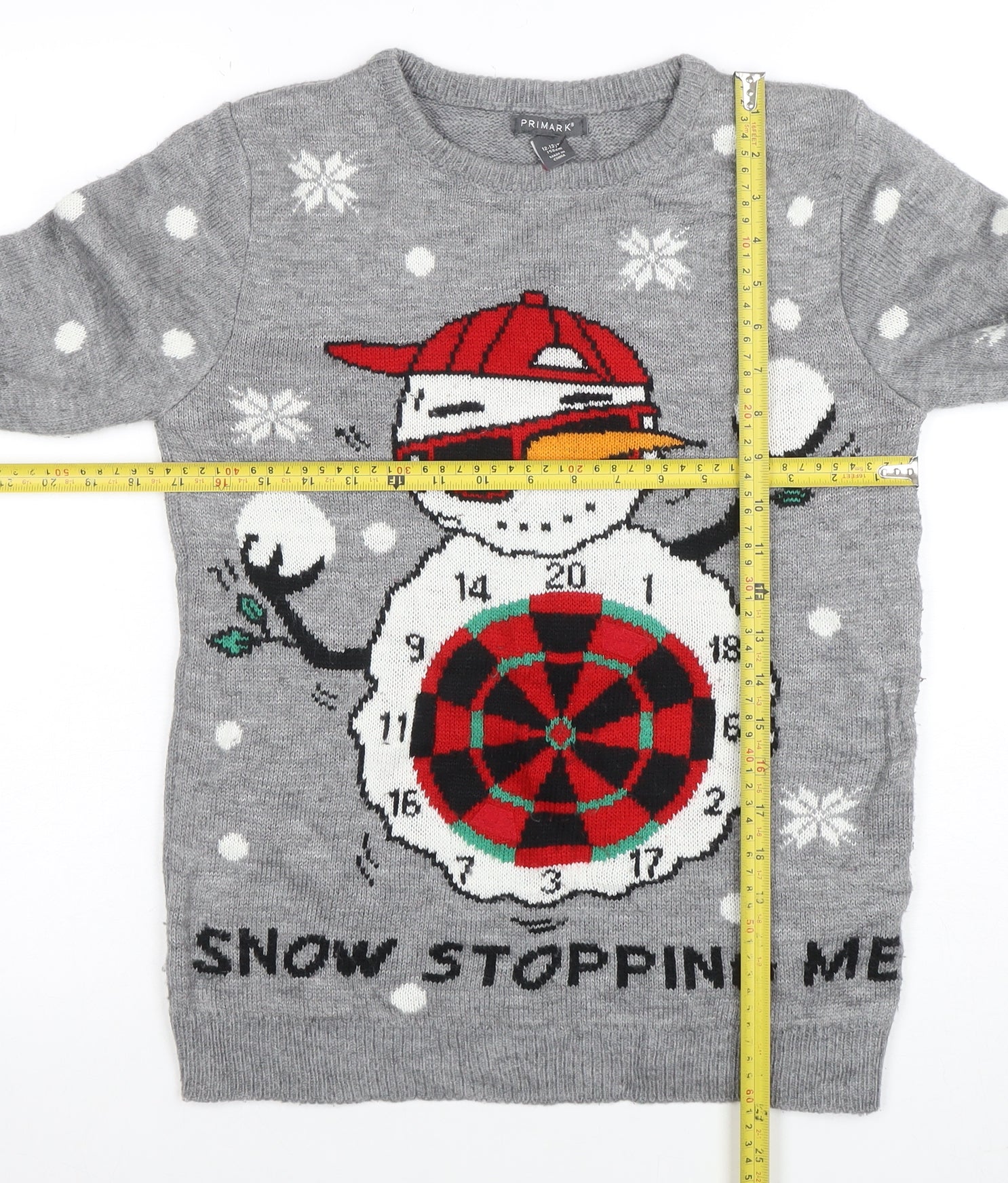 Get ready for festive fun with this Primark Boys Grey Christmas Jumper, perfect for spreading holiday cheer. In a versatile grey colourway, this jumper features a cheerful snowman design wearing a cool red cap and shades, complete with a dartboard belly and the playful slogan 'Snow Stopping Me' underneath. The fun, novelty motif makes it the ideal choice for school Christmas jumper days, family gatherings, or any winter celebration where you want to bring a smile. Crafted from a cosy knit of 85% acrylic and 15% polyester, it offers excellent warmth without being heavy, making it comfortable for all-day wear. The soft knitted texture ensures warmth on cold days while remaining flexible and easy to move in. Designed with a classic crew neckline, ribbed cuffs, and hem, it holds its shape beautifully even after repeated washes. Its long sleeves are detailed with white snowflake and polka-dot patterns, adding to the seasonal charm. Sized for boys aged 12–13 years (158 cm), it gives a regular fit that pairs perfectly with jeans, chinos, or joggers for a relaxed, winter-ready look. Whether for Christmas jumper day or casual wear during the holidays, this piece brings effortless festive style to your child’s wardrobe. Machine washable for easy care, this fun and eye-catching jumper remains soft and vibrant wear after wear. An excellent-quality, gently used item without original sales tags, this jumper is in great condition and ready for plenty more Christmas seasons of comfort and joy.