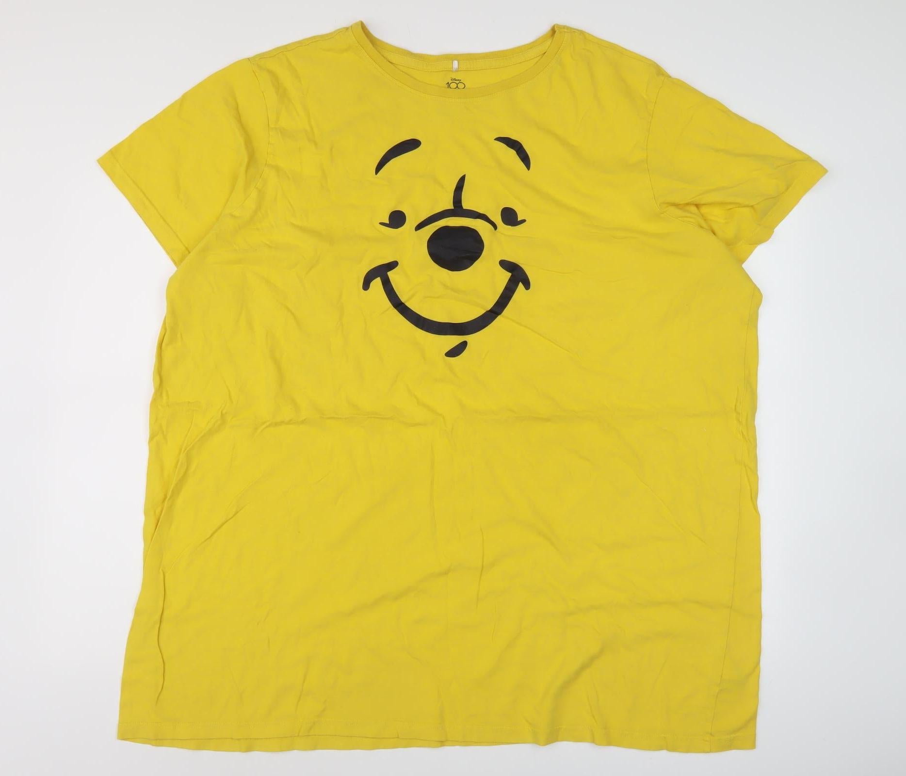 Celebrate your love for Disney with this vibrant yellow Winnie the Pooh T-shirt from Primark. Designed for unisex adults in size 2XL, this shirt features a cheerful graphic print of the beloved character that's guaranteed to bring a smile to your face. The shirt boasts a comfortable crew neckline and short sleeves, perfect for keeping cool during the sunny days of summer. Made from 100% cotton jersey, it offers a soft touch against the skin ensuring all-day comfort. Although slightly wrinkled, it remains in excellent condition, reflecting minimal wear without any noticeable damage. Embrace the whimsical charm of Winnie the Pooh in a style that pairs effortlessly with jeans or shorts for a laid-back yet fun look. Ideal for casual outings, Disney fans, or cartoon enthusiasts, this T-shirt is machine washable for easy care. Add a touch of nostalgia with the Disney theme, making it a delightful addition to your wardrobe. Brighten your collection with this sunny piece that captures the essence of classic comfort with a playful twist.