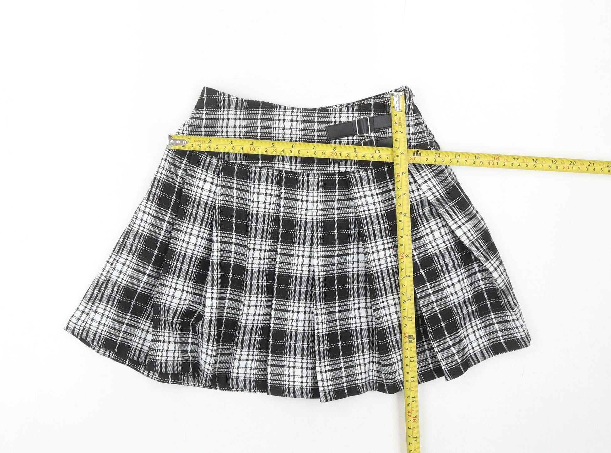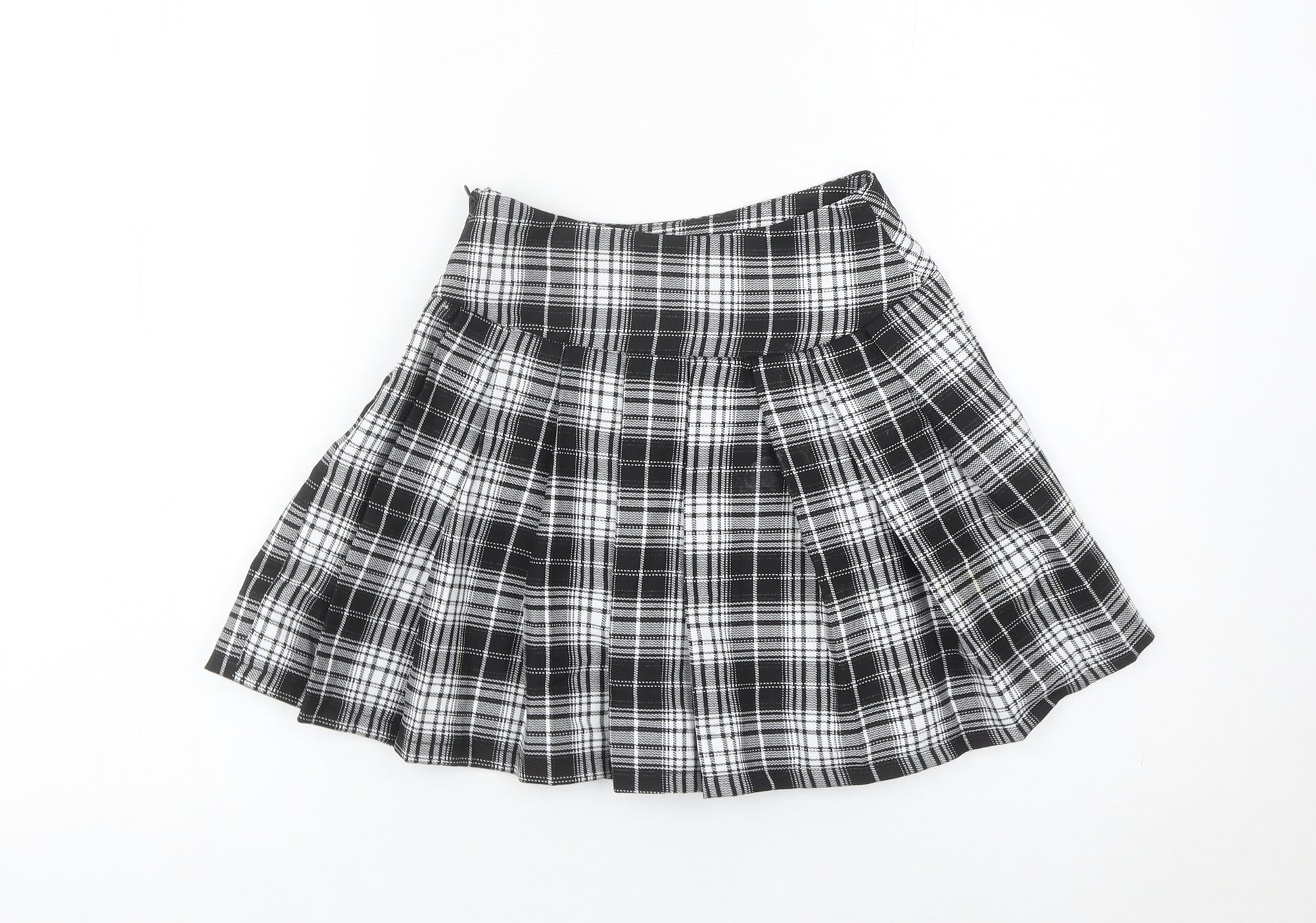 This Primark girls' black plaid pleated skirt is the perfect addition to your child’s wardrobe, combining comfort, practicality, and timeless style. Designed for ages 8-9 years (134 cm height), this smart skirt has a classic short length, making it versatile for both everyday wear and school use. Crafted entirely from 100% polyester, it is both lightweight and durable, ensuring your little one has a reliable piece that withstands frequent use while retaining its smart shape. The high-quality woven fabric features a traditional plaid pattern in black and white, a design that is always in fashion and ideal for school or casual wear alike.The skirt is detailed with twin buckle accents at the waist, adding a stylish and functional touch. Its pleated construction not only enhances movement and comfort but also gives an elegant finish that complements different occasions. For convenience, it has a side zip fastening and an elasticated waistband for added adjustability, ensuring a comfortable and secure fit. With its easy-care polyester material, this skirt is machine washable, making it highly practical for busy weekdays.Condition-wise, the skirt remains in excellent used condition with no staining, fraying, or flaws visible, though it is without the original retail tags. Given its durability and appeal, it offers fantastic value. Suitable for all seasons, this piece can be layered with tights in colder months or worn with light tops during the summer, meaning it stays a wardrobe favourite year-round.Whether styled for school, casual outings, or smart occasions, this Primark girls’ skirt delivers a chic, versatile, and reliable option for everyday dressing. A must-have item for those seeking comfort and timeless school style at an affordable price.