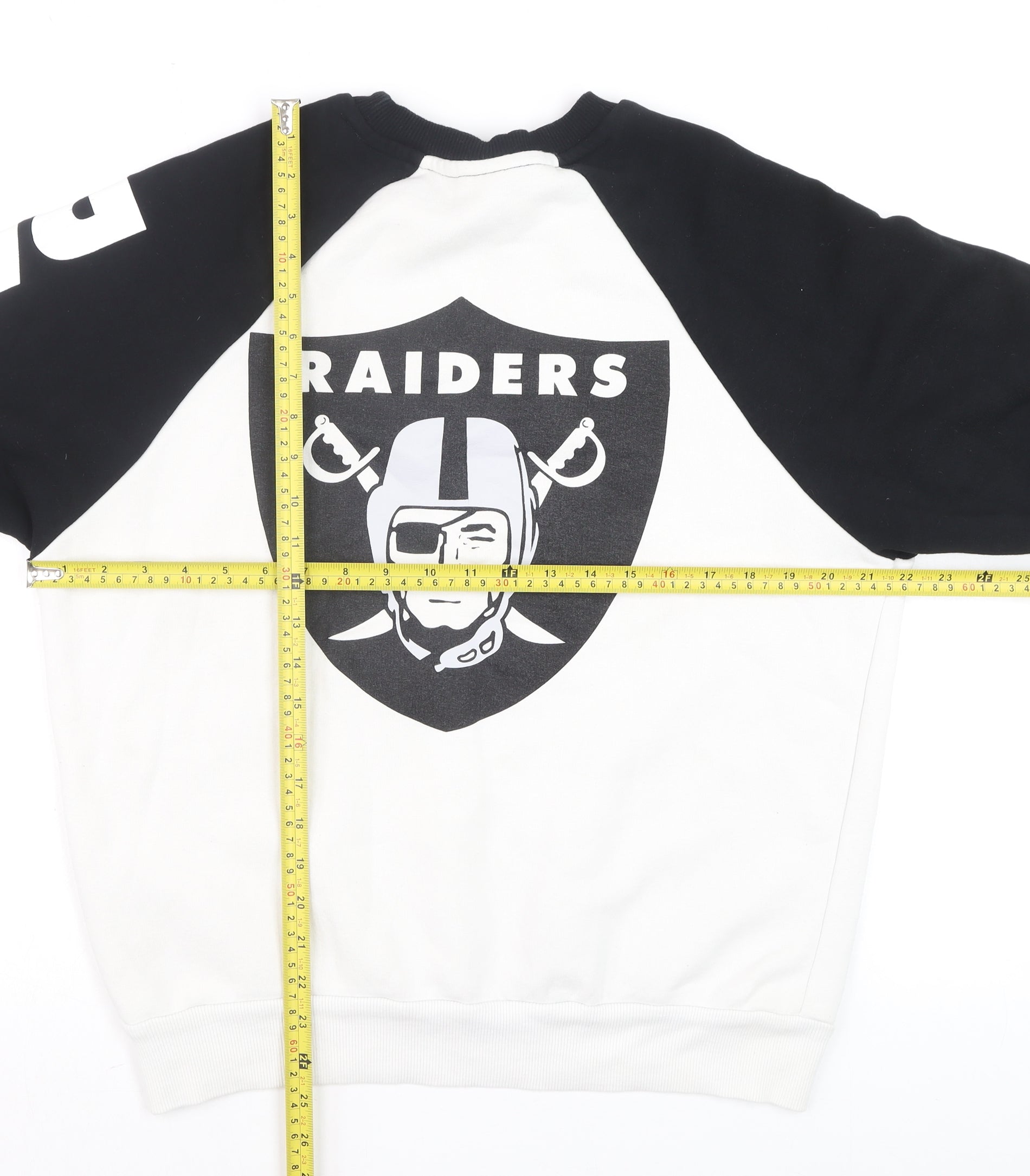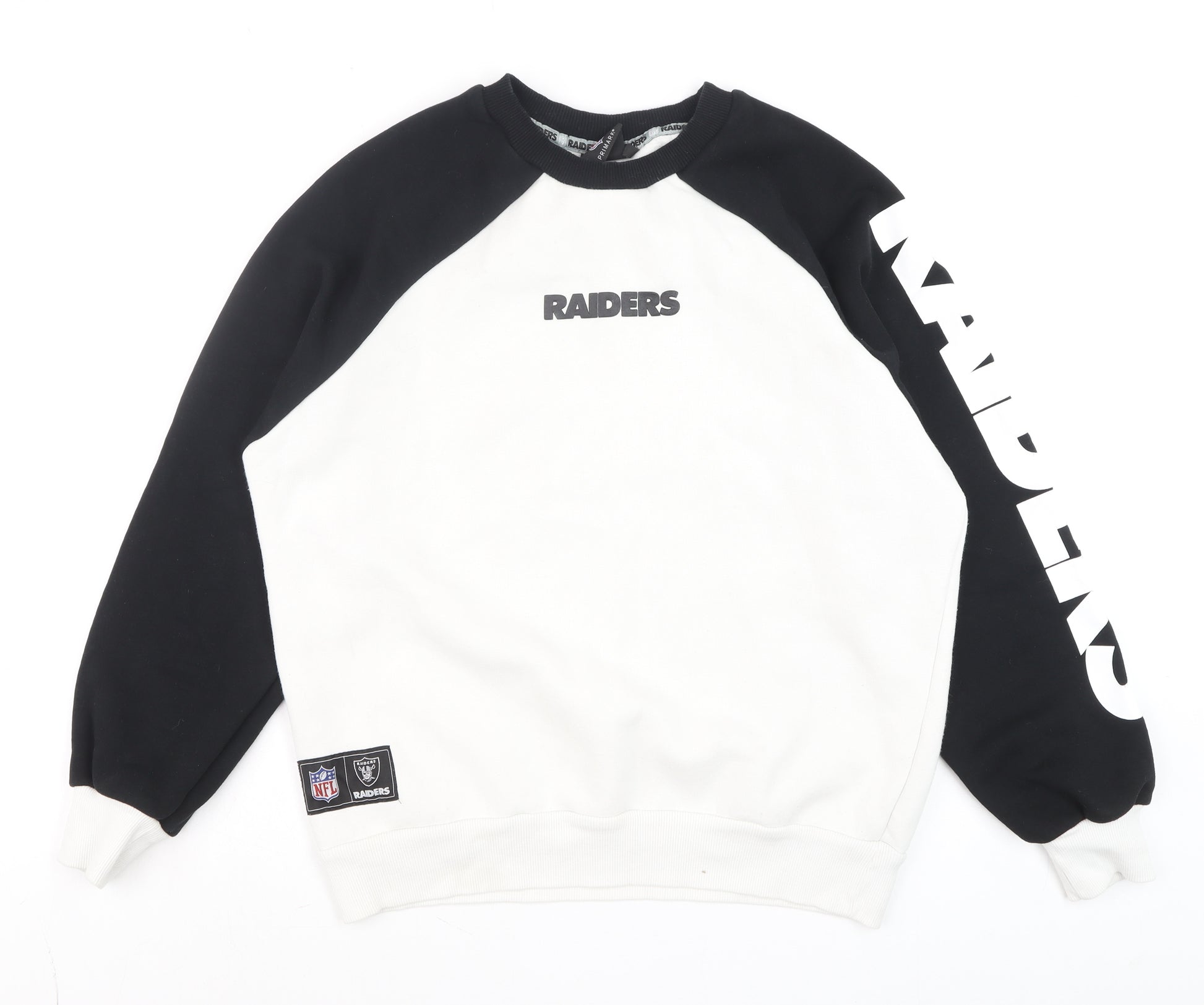 Show your support for the legendary Raiders with this officially licensed NFL sweatshirt by Primark. Designed for men who value both comfort and sporty style, this pullover features a bold black and white colour block design with the iconic Raiders logo printed proudly across the front and down the sleeve, making it the perfect choice for any dedicated fan or streetwear enthusiast. Crafted from a soft fleece fabric blend of cotton and polyester, it delivers a cosy, lightweight feel that’s ideal for layering during cooler months or wearing on its own in milder weather. The crew neck and long sleeves add classic appeal, while ribbed cuffs and hem provide a comfortable, secure fit. Built for everyday wear, this sweatshirt can easily pair with jeans, joggers, or shorts for a laid-back casual look that stands out with true team pride. Suitable for all seasons, it’s perfect for watching the game, heading to the gym, or simply relaxing in comfort at home. The versatile design ensures it fits seamlessly into your wardrobe while promoting your favourite NFL team in style. Conditioned in excellent pre-owned shape, this sweatshirt shows minimal signs of previous wear with clean and well-preserved fabric. A must-have collectible for any American football fan, it’s a stylish way to pay tribute to the Raiders while enjoying warmth and softness throughout the year. Get ready to upgrade your casualwear with this fan-favourite sweatshirt that reflects both sporty spirit and timeless appeal. Priced affordably at just £14.25, this quality piece offers premium comfort and design that looks great on and off the field.