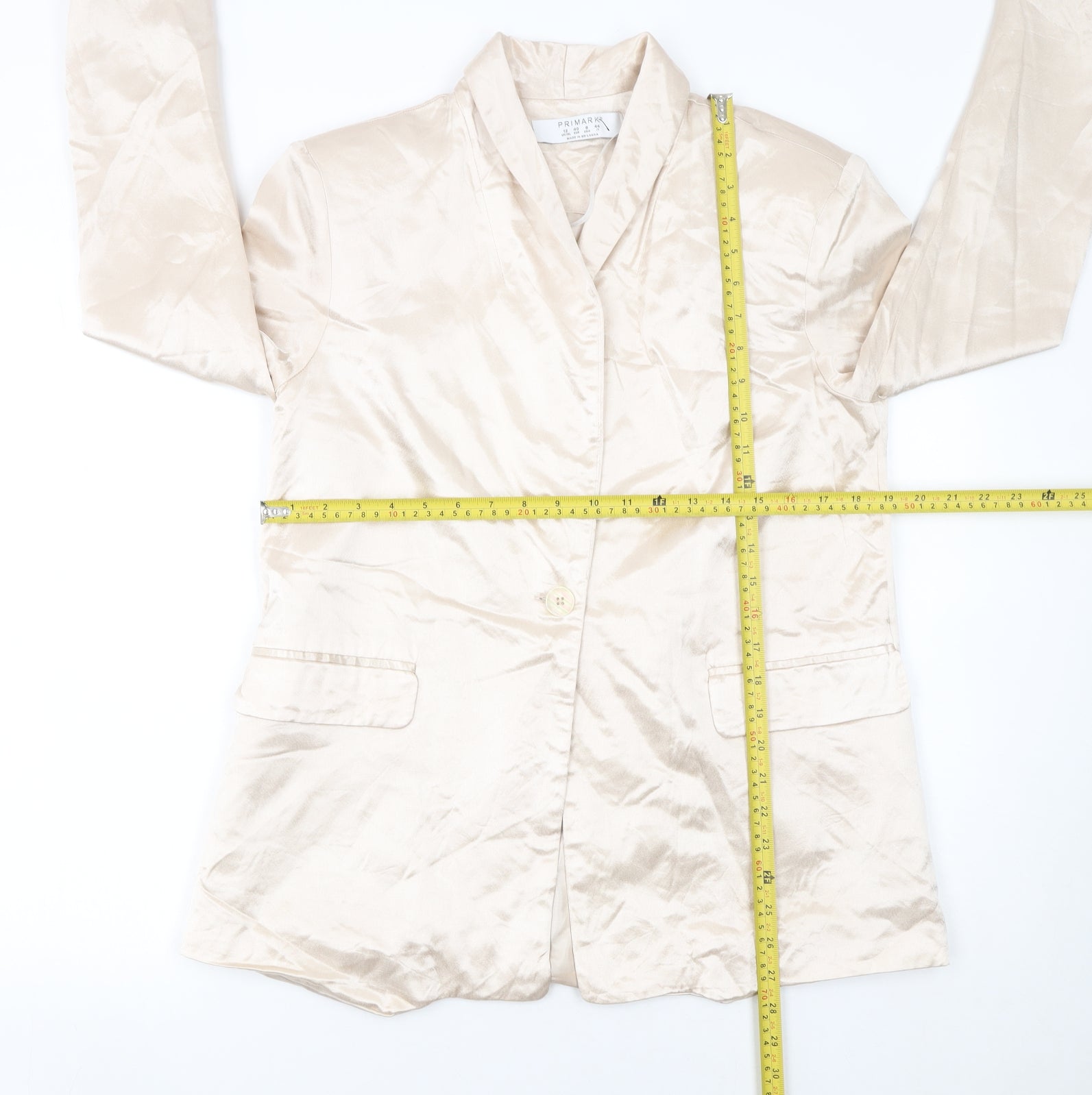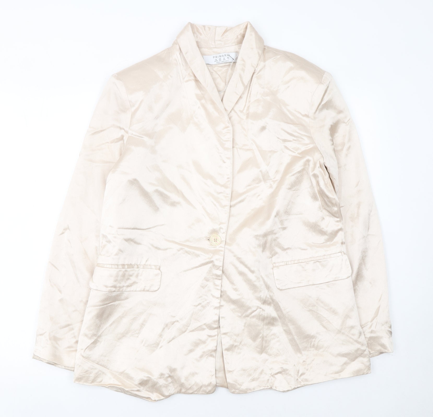 Add refined elegance to your wardrobe with this Primark women’s blazer in a soft beige tone. Designed in a flattering regular fit, it showcases a chic shawl lapel and a single-button closure that defines a polished silhouette suitable for both business and casual occasions. Crafted from 100% viscose, this woven fabric blazer offers a subtle sheen and lightweight feel, perfect for year-round styling. Its fully lined interior in soft polyester ensures comfortable wear and a neat finish. Practicality meets sophistication with two front flap pockets complementing its minimalist design, giving you function without sacrificing form. This versatile piece transitions smoothly from day to evening wear and can be easily styled with tailored trousers or jeans for a contemporary smart-casual look. Whether layered over a crisp blouse for the office or paired with statement accessories for a social gathering, this Primark blazer remains effortlessly stylish. The neutral beige colour pairs beautifully with a variety of tones—from classic black and navy to soft pastels—offering endless outfit possibilities. This particular blazer is pre-loved and remains in very good condition with only a light mark on the back hem area, which does not detract from its overall polished appearance. It’s ideal for those looking for high-quality, affordable fashion with a clean, modern edge. A timeless addition to your outerwear collection, this Primark blazer delivers understated sophistication and comfort in one classic piece—designed for the confident woman who values simplicity, versatility and style without compromise.