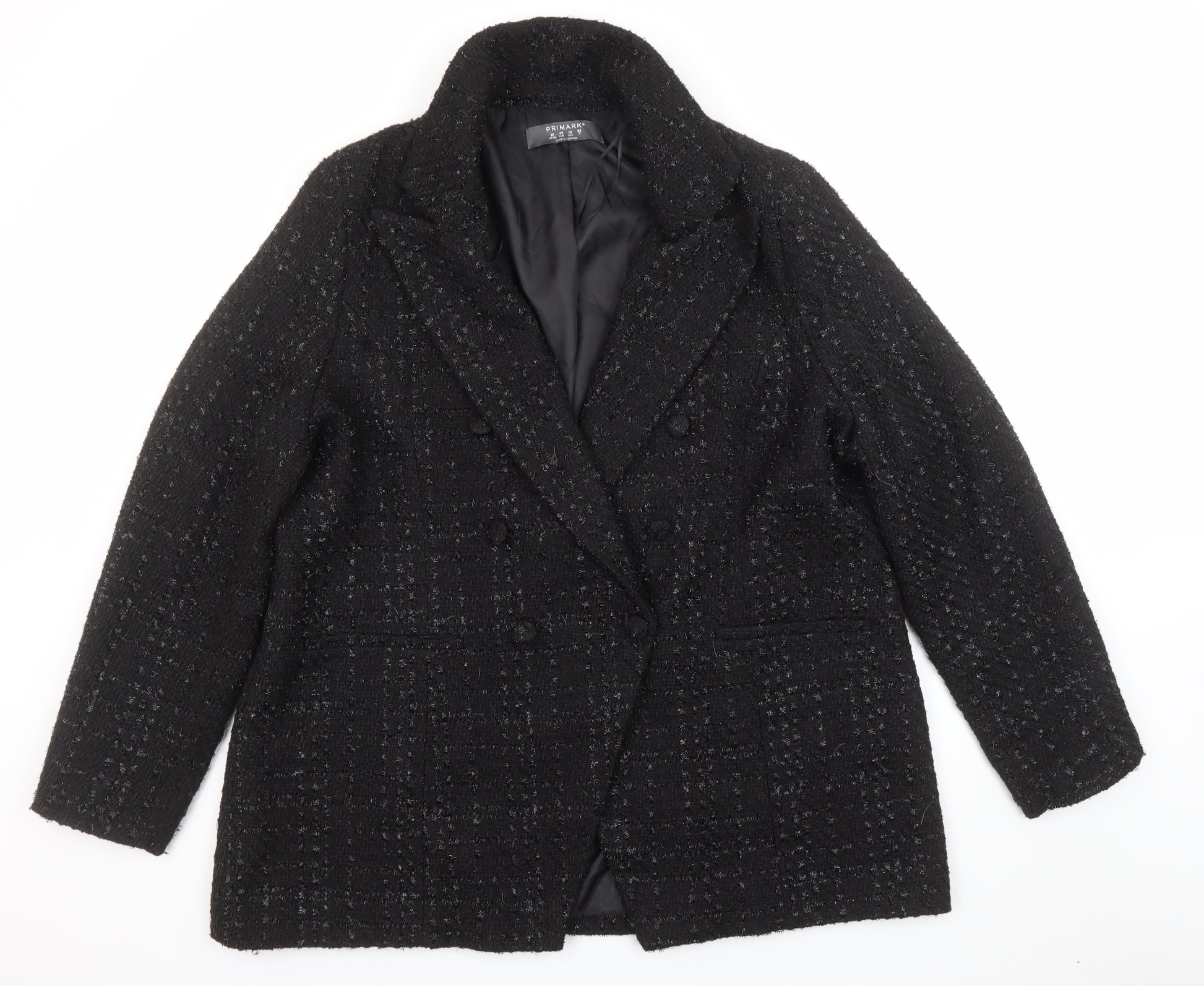 Elevate your wardrobe with this chic women’s bouclé blazer from Primark, designed in a timeless black colour that offers both versatility and sophistication. Crafted from 100% polyester, this beautifully textured jacket delivers a refined finish reminiscent of high-end tailoring while ensuring comfort and durability. Its double-breasted cut with smartly styled buttons gives a polished, structured silhouette suitable for formal, business, or evening occasions. The jacket features a soft full lining for comfort and a smooth drape, making it ideal for layering over blouses, dresses, or tops. Designed in a regular mid-length fit, it complements the body shape while providing a modern professional appeal. The notched lapel and subtle textured check pattern add visual depth, ensuring it stands out while maintaining understated elegance. Perfect for styling with tailored trousers, skirts, or jeans, this jacket seamlessly transitions from office wear to special events. Whether worn open for a casual-loft look or buttoned for a sleek tailored finish, it embodies a combination of practicality and fashionable design. The polyester fabric ensures low maintenance and resilience while keeping the tailored shape intact. With an overall excellent preloved condition showing minimal signs of previous wear, this blazer offers quality and style at outstanding value. A staple piece for the fashion-conscious woman who appreciates classic tailoring with a contemporary twist. Pair it with heels and a statement handbag for an effortlessly sophisticated look.
