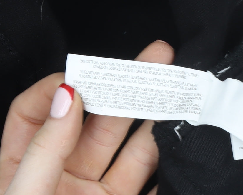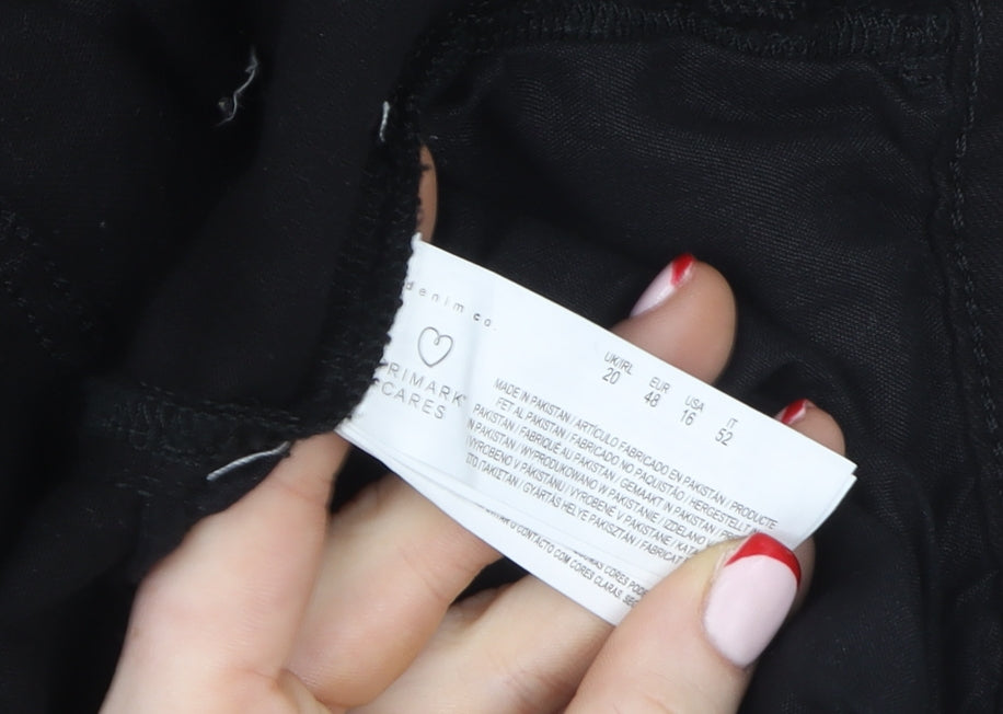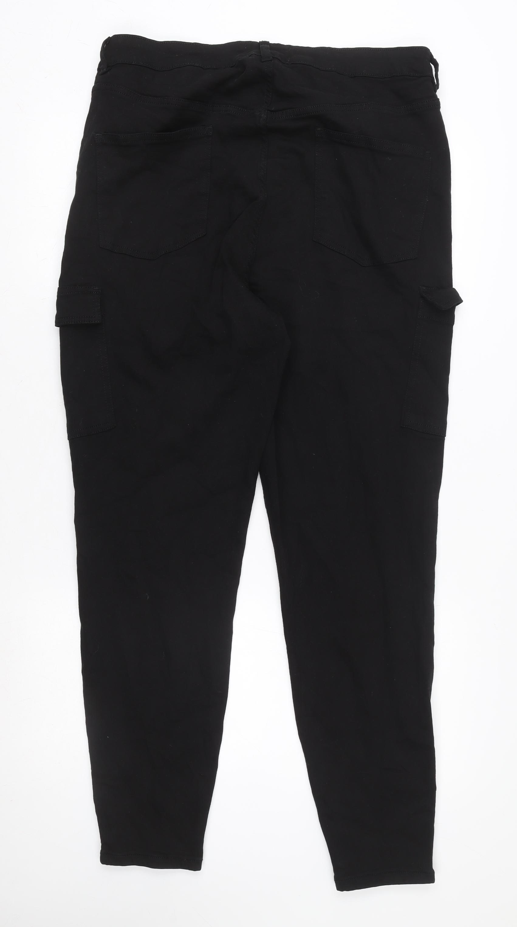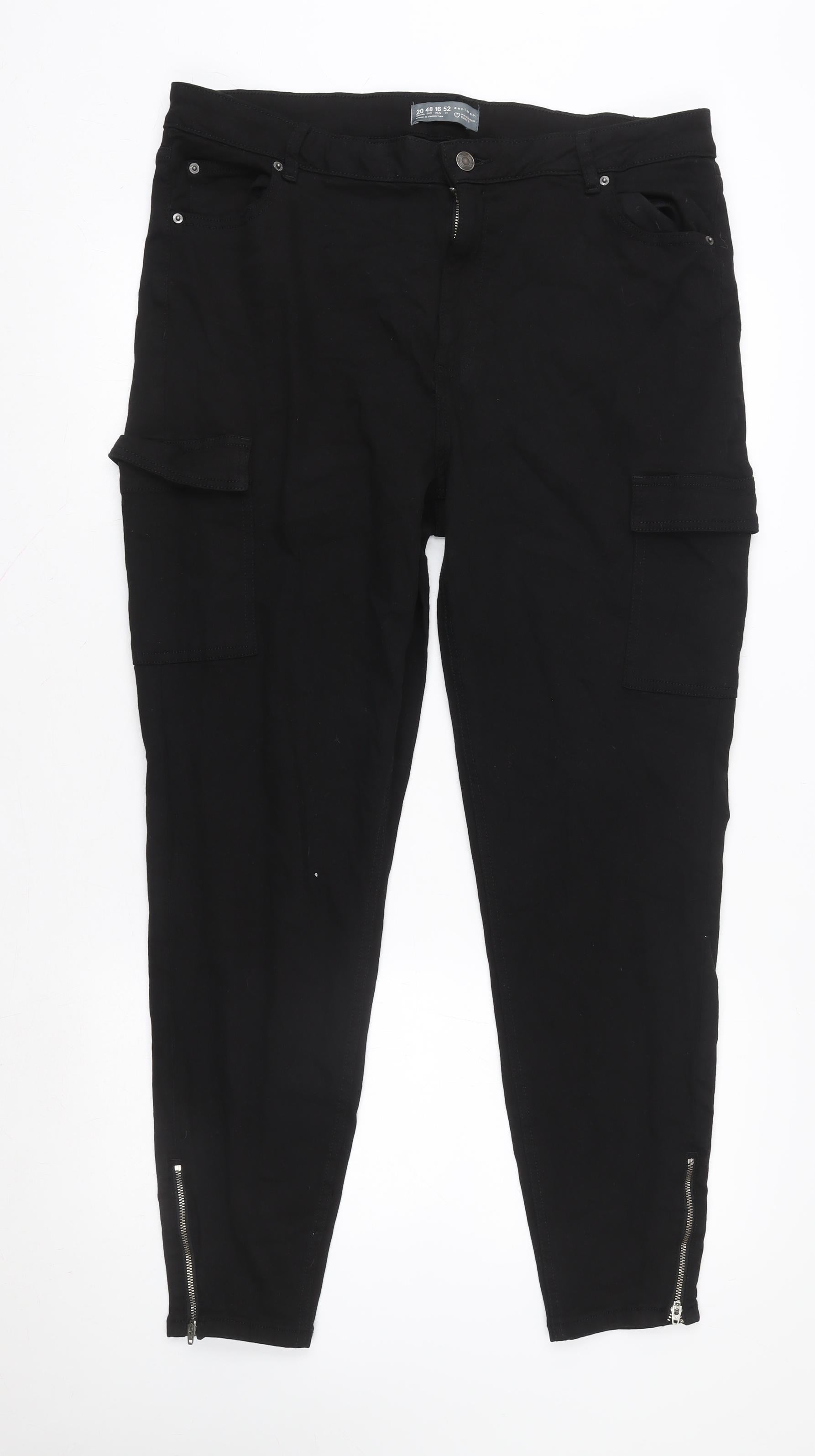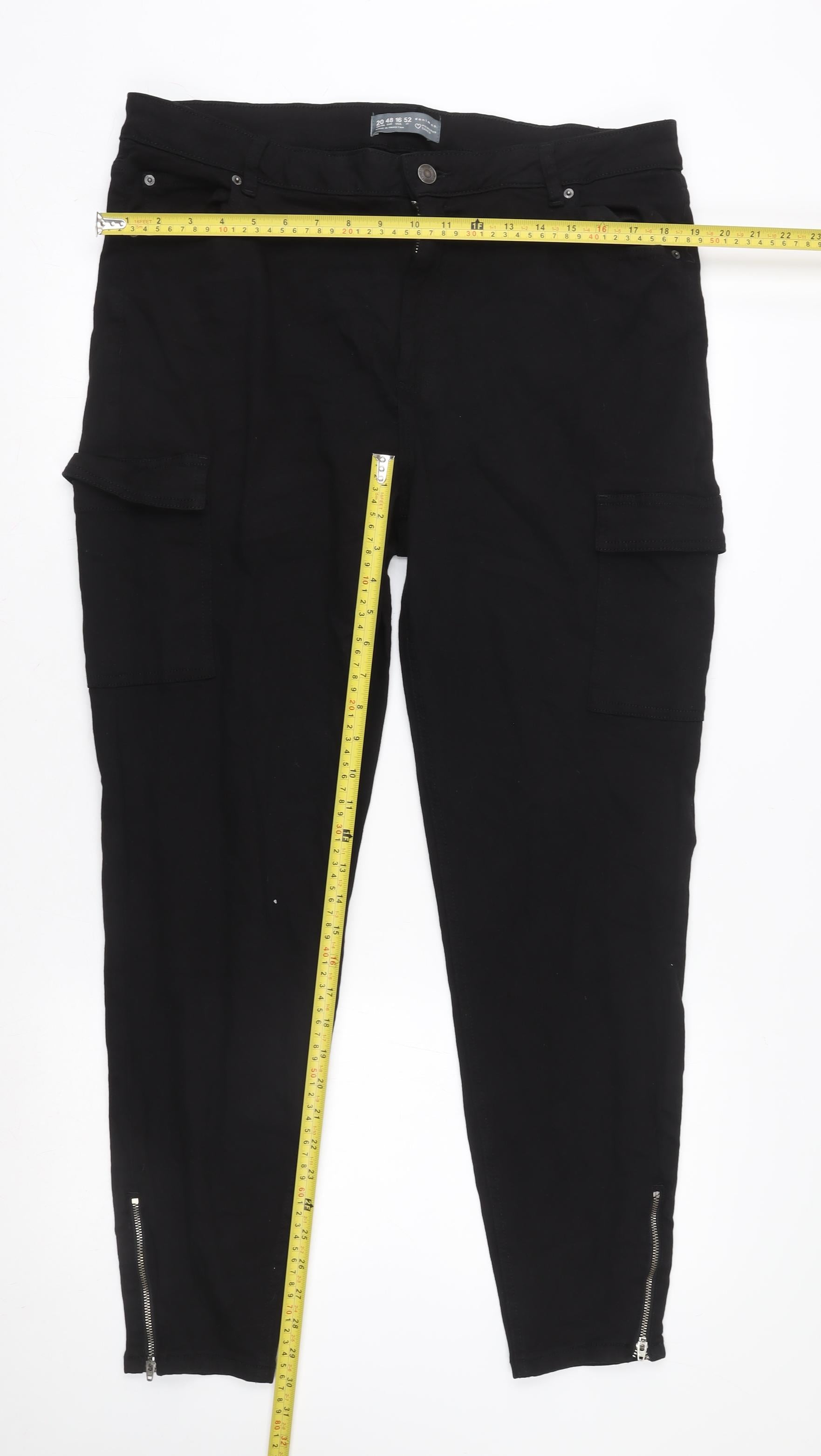 Step into effortless style and comfort with these Primark Women’s Black Tapered Jeans in size 20. Designed with a flattering modern silhouette, these jeans taper down the leg to create a sleek, structured look that pairs beautifully with almost any outfit. The deep black hue offers a timeless aesthetic, perfect for both casual outings and smart-casual ensembles. Made from a high-quality cotton-rich fabric blend (99% Cotton, 1% Elastane), these jeans deliver a soft, breathable feel with just the right amount of stretch for comfortable all-day wear.The ankle zip detailing adds a subtle yet stylish edge, while the inclusion of multiple pockets—including classic front and back pockets as well as handy cargo pockets—enhances both function and design. The sturdy button and zip fastening ensures a secure and sleek fit. A regular rise and structured waistband contribute to a comfortable yet refined shape that suits a wide range of body types.Perfect for autumn and winter months, their dark wash brings a sophisticated touch that can easily transition from day to evening wear. You can dress them up with heels and a smart blouse for an evening out or keep it casual with trainers and a cosy jumper. The durability of the denim fabric ensures longevity while the slight stretch keeps them flexible and easy to move in.In excellent pre-owned condition with only very light signs of wear, these Primark jeans retain their structure and colour beautifully. As part of the Primark Cares initiative, they also represent a conscious choice for sustainable fashion. A fantastic wardrobe essential that combines practicality with modern appeal, these jeans offer reliable comfort and effortless style at exceptional value.