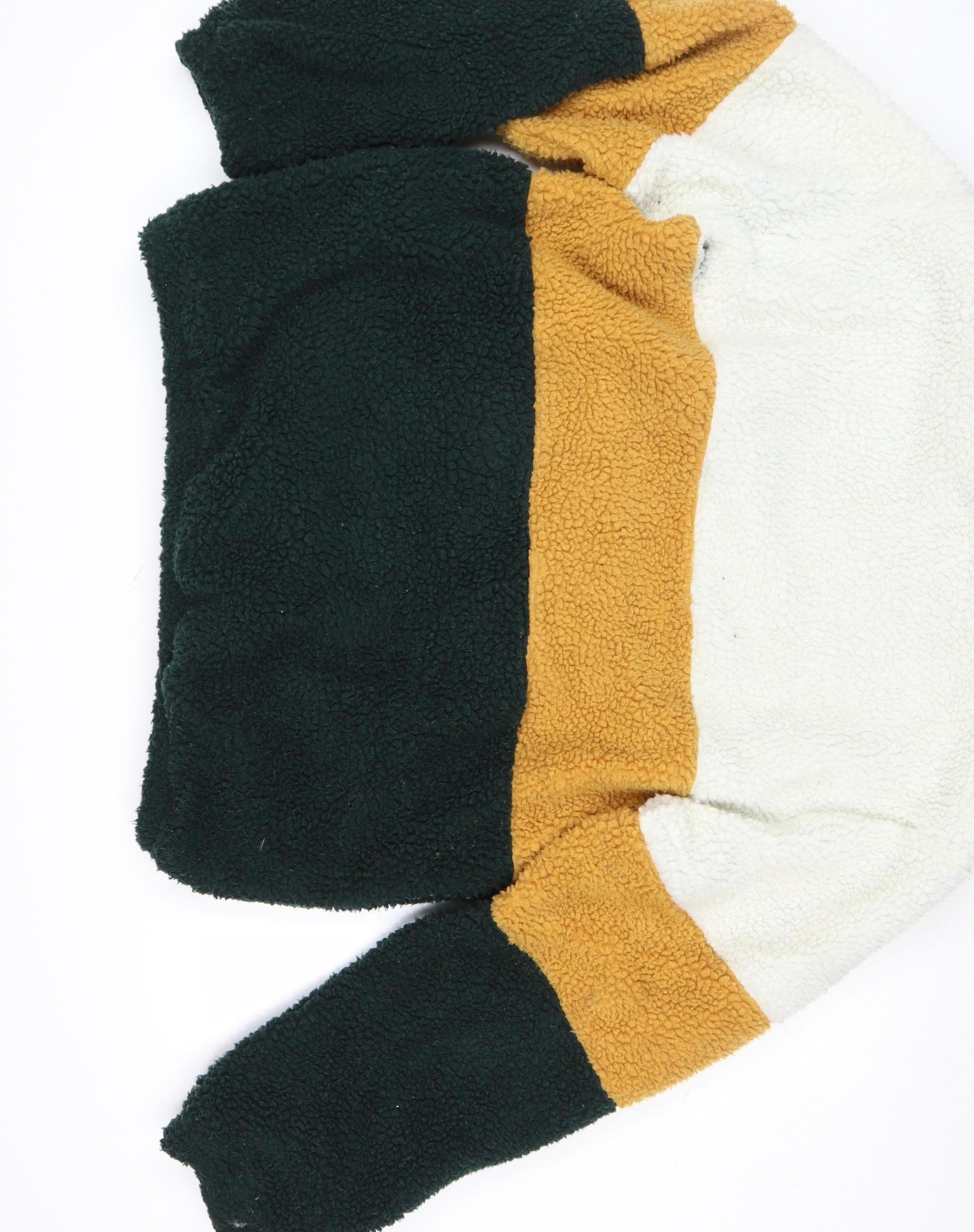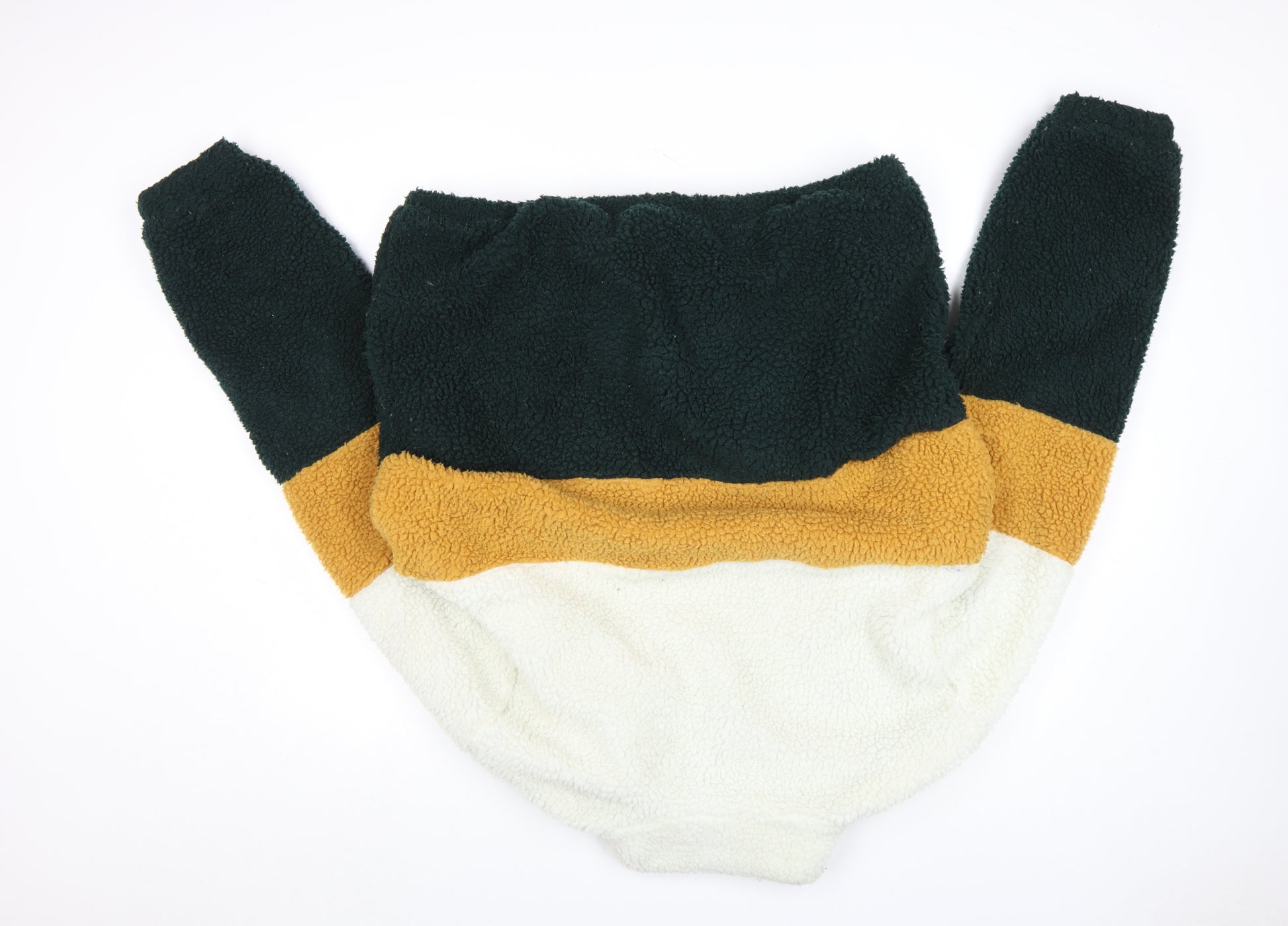 Stay warm and stylish in this Primark women’s 2XL sherpa pullover sweatshirt, featuring a cosy multicoloured fleece design in dark green, mustard, and cream. The soft, fluffy texture and relaxed fit make this pullover perfect for layering during cooler seasons. Designed with a comfortable high neck and functional 1/4 zip detail, it provides both warmth and breathability for casual wear and outdoor activities like walking or running errands. The colourblock pattern lends a retro-inspired touch, while the elasticated cuffs and hem help keep the warmth in. Made from quality polyester fleece, it offers easy care and durability through regular machine washing. This piece comes with a practical front kangaroo pocket, ideal for keeping your hands warm or storing essentials. Whether you’re lounging at home, heading out for a stroll, or looking for a comfortable everyday sweatshirt, this Primark pullover delivers both comfort and casual style. The sherpa outer provides a cosy texture reminiscent of teddy fleece, while the inner lining adds extra softness against the skin. Pair it with jeans or leggings for an effortlessly relaxed look that’s both functional and fashionable. Versatile enough for autumn through to spring, it is great for layering under jackets or wearing on its own for a comfortable yet smart-casual feel. Though pre-owned and showing a small hole near the hem, it remains in good wearable condition and retains its warmth and comfort. A practical and affordable choice for anyone seeking a cosy addition to their casual wardrobe. Ideal for everyday wear or relaxed weekend outings, this piece showcases the comfort and practicality Primark is known for, making it an excellent option for those who value both warmth and effortless style.