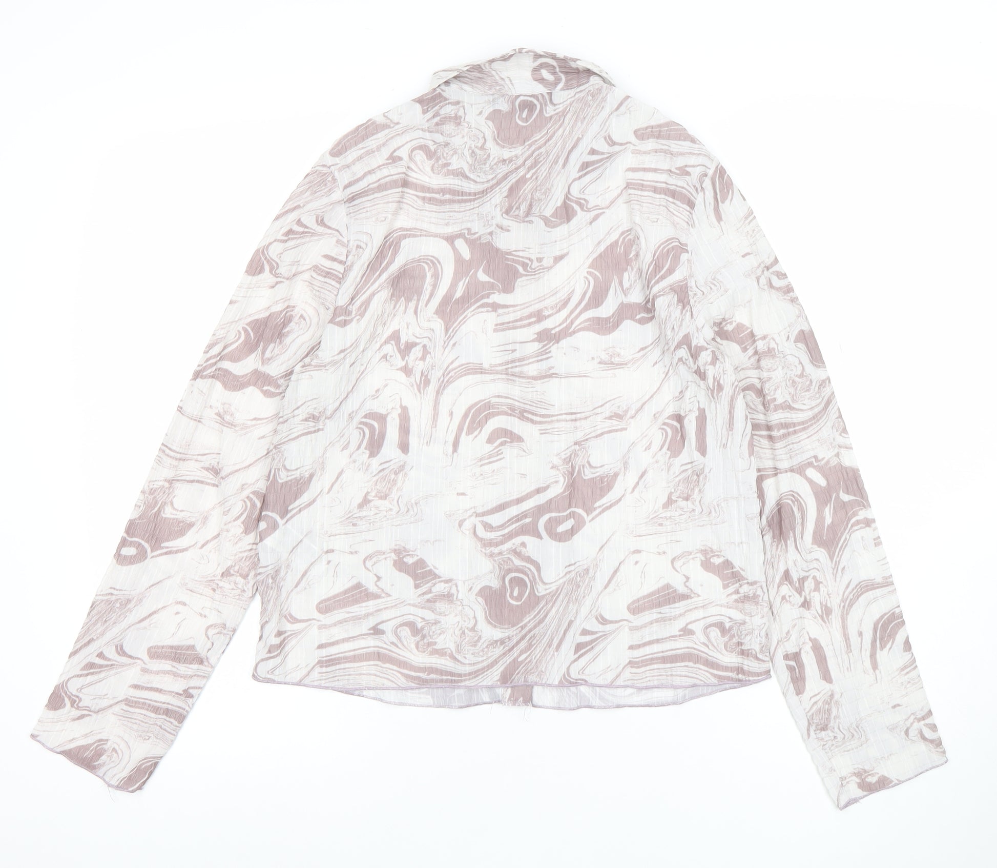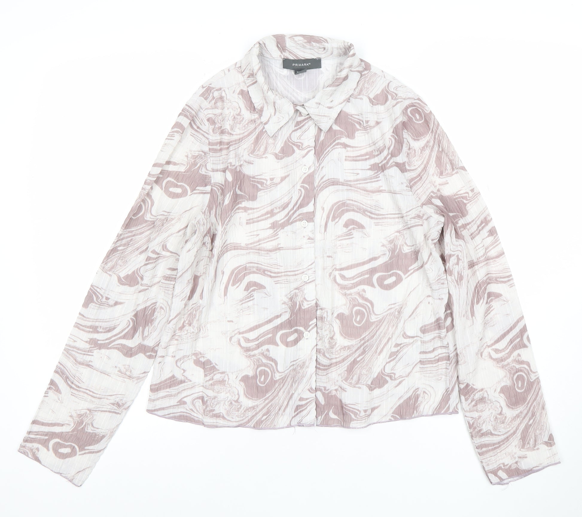 Elevate your wardrobe with this stylish Primark Women’s Button-Up Shirt in a fluid marbled pattern of cream and soft taupe tones. Designed in a flattering regular fit, this lightweight woven shirt is crafted from polyester with a touch of elastane, offering a comfortable drape and subtle stretch that enhances daily wear. The long sleeves and classic collared neckline provide a timeless silhouette, while the button fastening down the front adds a touch of smart casual sophistication suitable for both work and leisure occasions. Perfect for the modern woman who values simple elegance with a twist, this Primark shirt features a unique geometric marbled design that stands out yet remains versatile—ideal for pairing with tailored trousers, jeans, or a skirt. The breathable fabric makes it suitable for year-round wear, especially during spring, summer, and early autumn. Subtle button accents bring a neat finishing touch, blending functionality with fashionable detail. The shirt shows minimal signs of wear and has been maintained in excellent condition, free from stains, tears, or visible flaws. Its lightweight and easy-care composition make it practical for everyday use, neatly balancing comfort with contemporary chic styling. Whether you're dressing for a relaxed day at the office, a weekend lunch, or layering up for cooler evenings, this piece offers endless versatility. A great addition to any wardrobe, this regular-fit, machine-washable shirt perfectly demonstrates Primark’s ability to deliver on-trend yet affordable fashion. Combining casual ease with refined texture and pattern, it’s a go-to piece for effortless styling that transitions seamlessly from day to night. Treat yourself to this quality find and update your staples with understated artistic flair.
