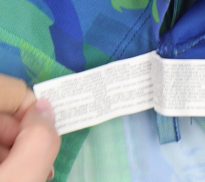 Bring a burst of artistic energy to your wardrobe with this striking women’s multicoloured mesh cropped blouse from Primark. Crafted from a lightweight blend of polyester and elastane, the top offers a comfortable stretch fit that hugs your shape while maintaining breathability. The semi-sheer mesh fabric showcases a vivid collage of blue and green tones with artistic face prints, perfect for adding a retro-inspired pop of colour to your look. Designed with long fitted sleeves and a flattering V-neckline, it features a ruched front and tie-up detail that elevates its feminine style and ensures a customisable fit. The cropped cut pairs effortlessly with high-waisted jeans, skirts or tailored trousers, making it versatile for both casual daywear and stylish evening occasions. Ideal for spring and summer, its sheer and lightweight composition keep you cool and fashion-forward during warmer months. Whether worn on its own for a bold statement or layered over a bralette for added detail, this blouse transitions seamlessly from daytime adventures to nights out. The soft stretch mesh moves with you, combining comfort and contemporary flair, while its flattering silhouette highlights your figure with ease. This Primark cropped blouse is perfect for fashion lovers who enjoy dynamic prints, modern cuts and creative expression in their everyday wear. Condition is excellent, with no signs of wear or damage. A fantastic choice for refreshing your wardrobe chicly and affordably, ideal for party, casual or cocktail settings. Elevate your outfit with confidence and make an impact wherever you go with this standout Primark mesh crop top — a fusion of playful retro energy and modern design aesthetic.