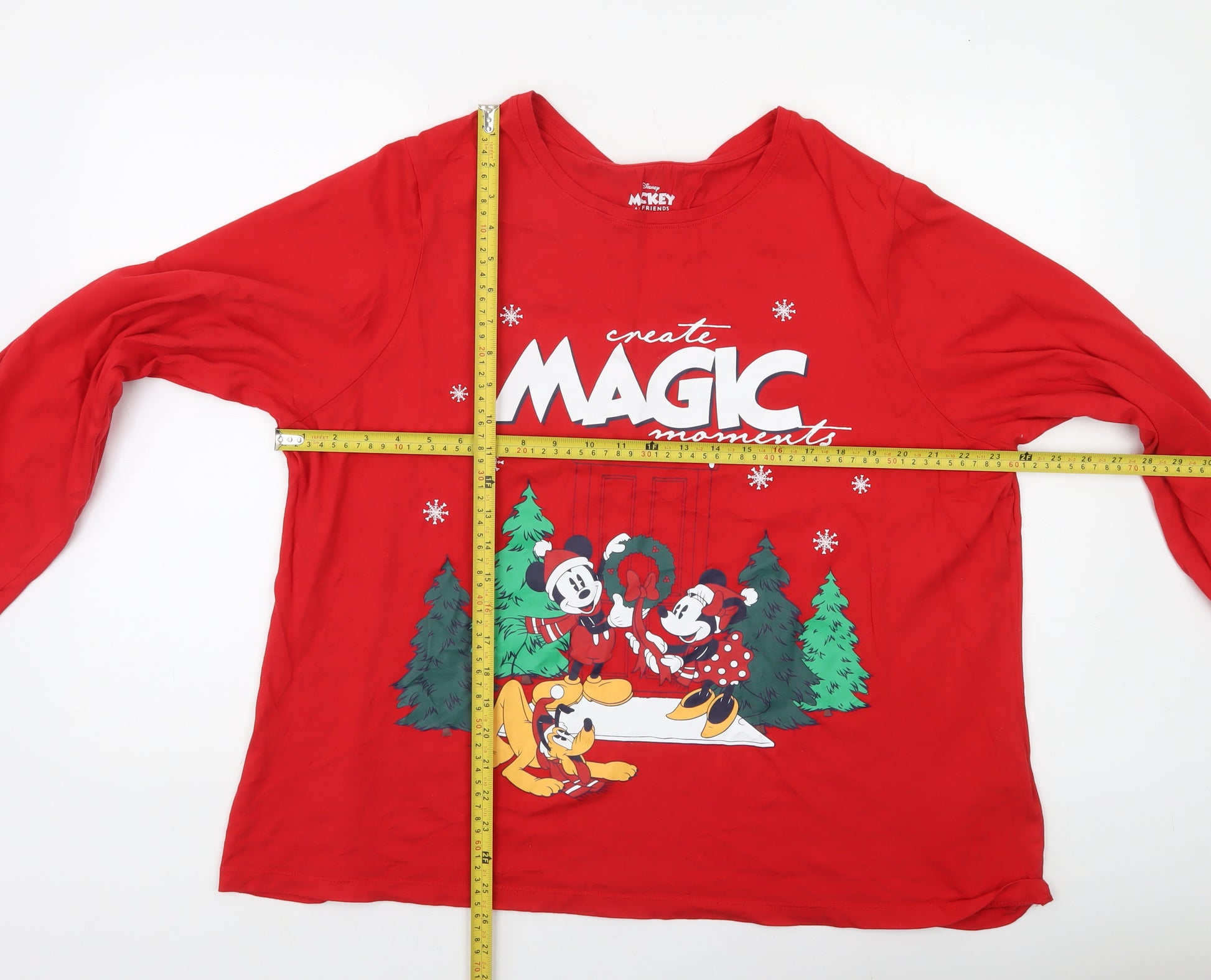 Celebrate cosy nights in with this festive Primark Women’s Red Mickey & Friends Christmas Pyjama Top in size 2XL. Designed in a relaxed T-shirt style, this top captures the cheerful Disney spirit with a bright red colourway and a charming holiday-themed print featuring Mickey Mouse, Minnie Mouse, and Pluto surrounded by Christmas trees and snowflakes. Perfect for lounging or sleeping, this lightweight top exudes warmth and fun that instantly puts you in the holiday mood.Crafted from soft 100% cotton jersey fabric, it offers breathable comfort that’s ideal for relaxed evenings or lazy weekend mornings. The long sleeves provide a bit of extra warmth for cooler months, making it an excellent choice for winter nights. With a classic crew neckline and a loose-fitting cut, it balances comfort and style, ensuring freedom of movement while maintaining that cosy, snug feel expected from nightwear.Adorned with a bold and colourful festive graphic, this Disney pyjama top makes bedtime brighter. It’s easy to care for — simply machine washable — and designed for lasting wear while keeping its soft texture. Part of the Mickey & Friends collection, it’s perfect for any Disney fan or anyone who loves a bit of joyful holiday flair in their sleepwear.Though pre-owned, it remains in excellent condition with no visible signs of damage beyond light creasing from storage. Pair it with your favourite pyjama bottoms for a complete holiday look that delivers comfort and charm. Whether you’re lounging with family, watching Christmas films, or getting ready for bed, this top helps create those magic winter moments. A fun, festive, and comfortable choice for Disney lovers and cosy nights alike.