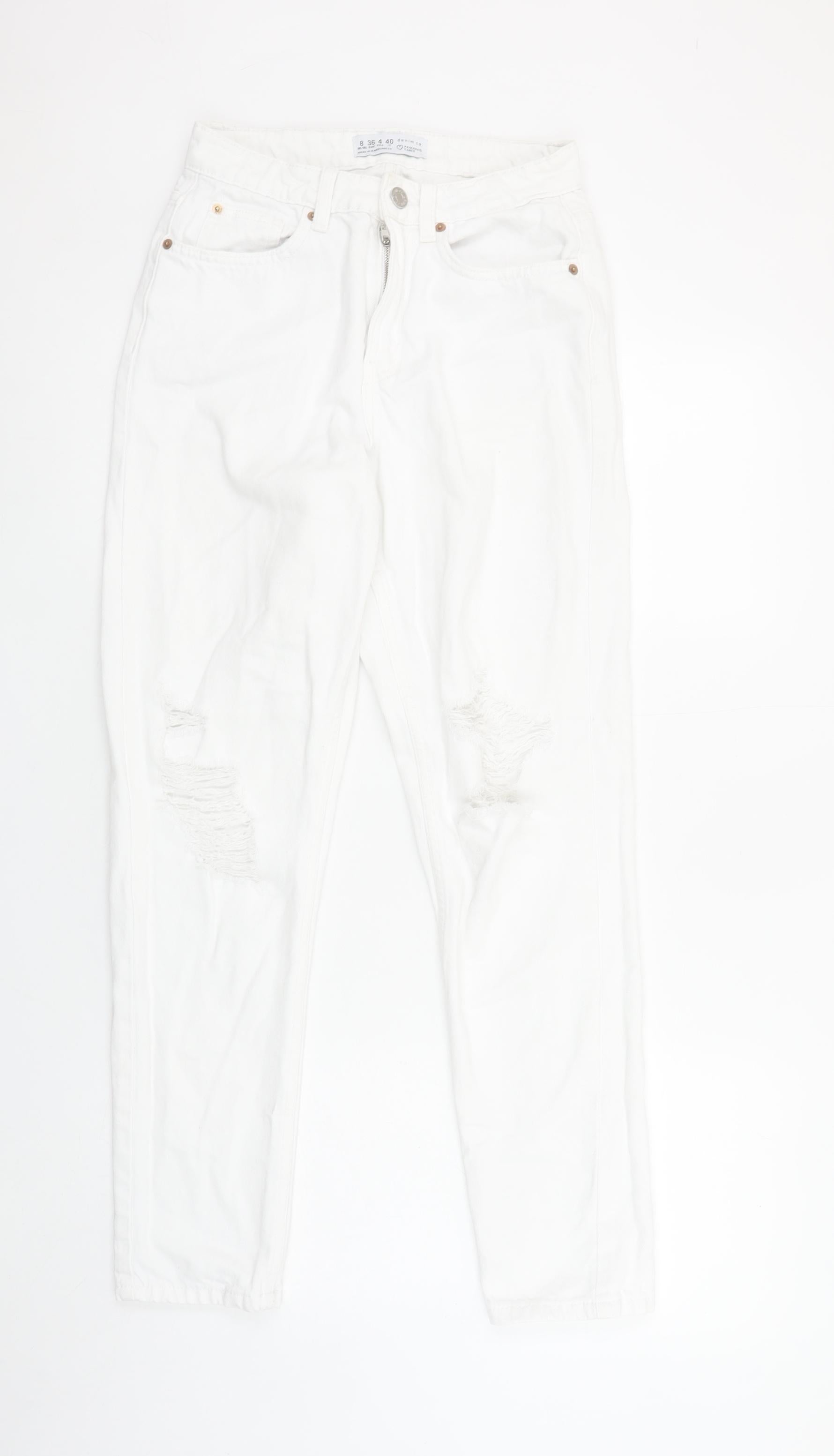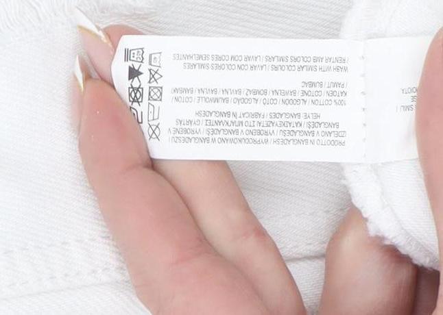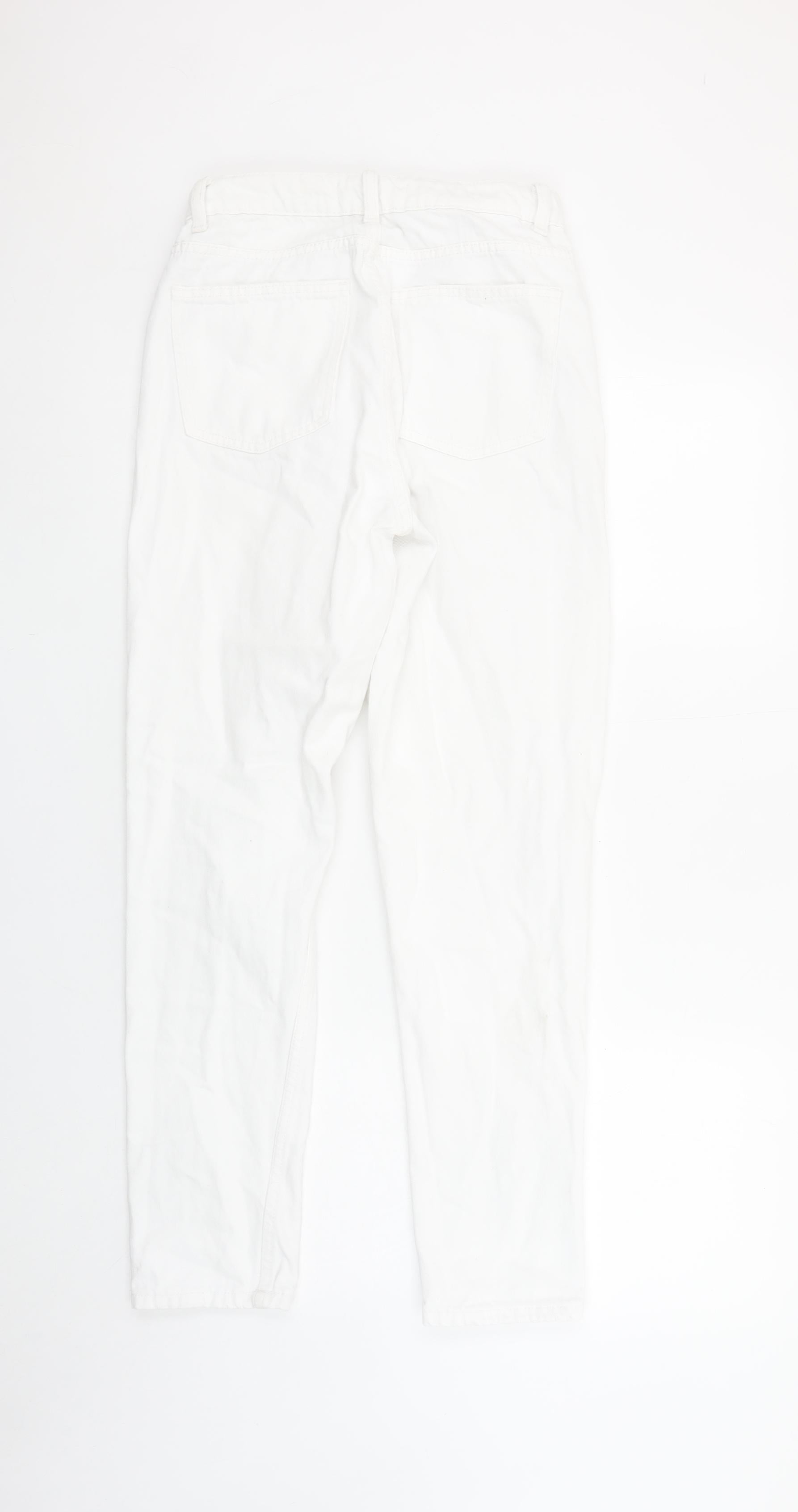Step into effortless style with these Primark Women’s White Mom Jeans, a versatile piece perfect for any season. Crafted from premium 100% cotton denim, these jeans blend durability with everyday comfort, making them a wardrobe essential for relaxed yet chic looks. The high-rise fit flatters the waistline while providing a comfortable, secure fit that pairs wonderfully with cropped tops, tucked-in shirts, or cosy jumpers for cooler days.Their crisp white colour gives a fresh, modern appeal, while the trendy distressed detailing on the front adds a touch of contemporary, lived-in charm. Designed in a relaxed mom style, these jeans offer a subtly loose silhouette through the legs with a tapered finish, ideal for casual outings, brunch gatherings, or laid-back days in the city. Functional elements such as a classic five-pocket design, button and zip closure, and sturdy belt loops keep them versatile and practical for everyday wear.These jeans are machine washable, ensuring easy care and maintenance, and are part of the environmentally conscious Primark Cares collection. Their lightweight denim makes them perfect for spring and summer but adaptable enough to pair with boots and layers in autumn. In excellent pre-owned condition, they show only minimal signs of wear with no visible flaws, offering great style at an affordable price.Pair them with trainers for a relaxed daytime look or elevate the outfit with heels and a statement blouse for an effortless smart-casual ensemble. Whether you’re after something breathable for warmer weather or a classic white jean to dress up or down, these Primark jeans tick all the boxes for comfort, style, and versatility. A timeless addition to your collection that goes beyond seasons, these high-rise distressed mom jeans deliver casual confidence with a fashion-forward edge.
