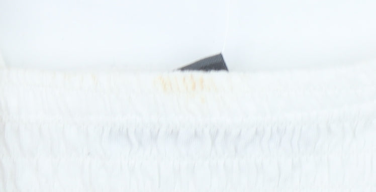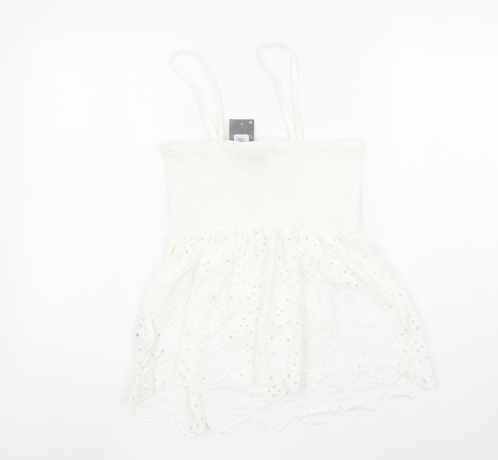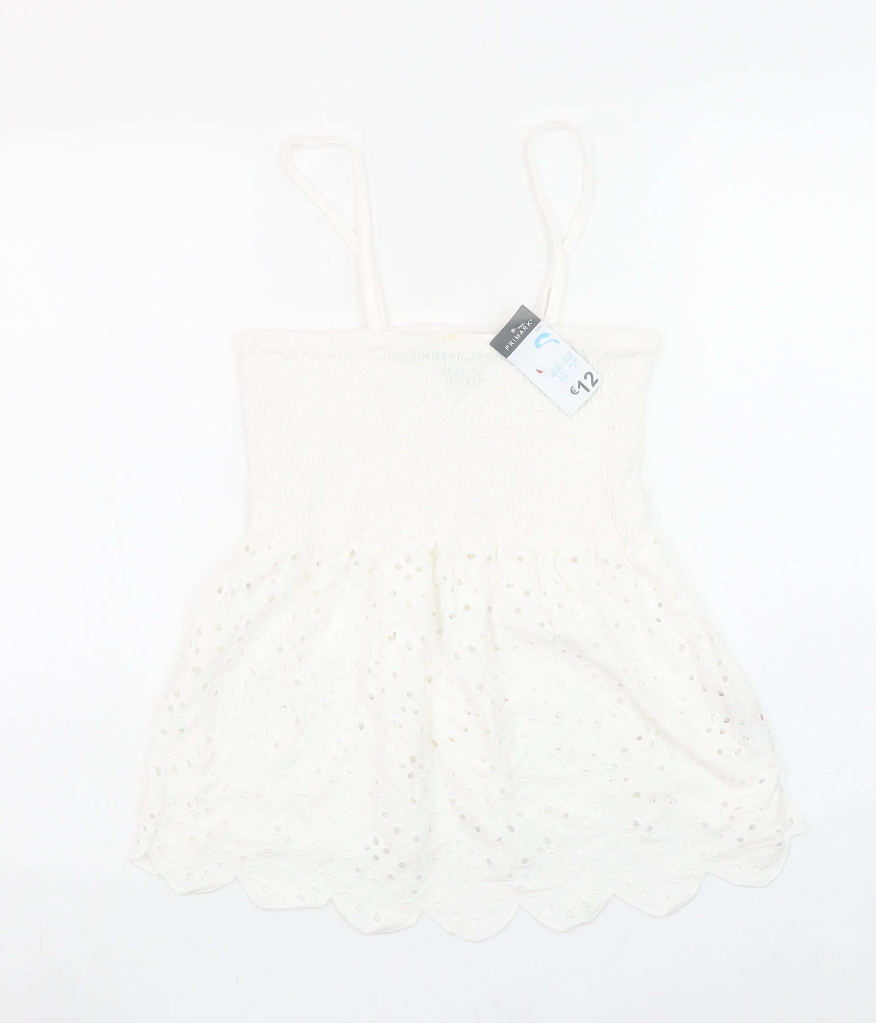Add a touch of effortless summer charm to your wardrobe with this stunning white cotton camisole top from Primark. Designed for women, this beautifully feminine tank top combines easy wearability with delicate detail. Crafted from 100% breathable cotton, the lightweight fabric makes it perfect for warm-weather days, holidays, and relaxed outings. Featuring a smocked elasticated bodice that gently hugs the upper body for a flattering fit, the top falls into a soft, embroidered eyelet lace hem with a scalloped edge for a romantic boho finish. The delicate spaghetti straps and square neckline enhance its simple elegance, making it easy to pair with jeans, shorts, or skirts for a casual yet chic look. Ideal for beach days, festivals, or laid-back weekends, this charming camisole effortlessly blends comfort and style. The lightweight and breathable cotton ensure all-day freshness, while its pull-on design keeps dressing simple. Although this item has a small mark near the neckline, it remains in good wearable condition and has been carefully assessed for quality. Its classic white colour is easy to match, and the versatile design means it can transition from daywear to evening layering with ease. Whether worn on its own under the sun or paired with a kimono or light jacket, this top is a reliable go-to for a breezy summer aesthetic. A lovely addition to any wardrobe for those who love feminine, comfortable fashion pieces. Size Small (UK 10–12), Primark’s airy cotton craftsmanship ensures timeless appeal and easy maintenance. Machine washable and ready for more wear. A perfect choice for casual, bohemian, or holiday outfits that bring effortless style wherever you go.