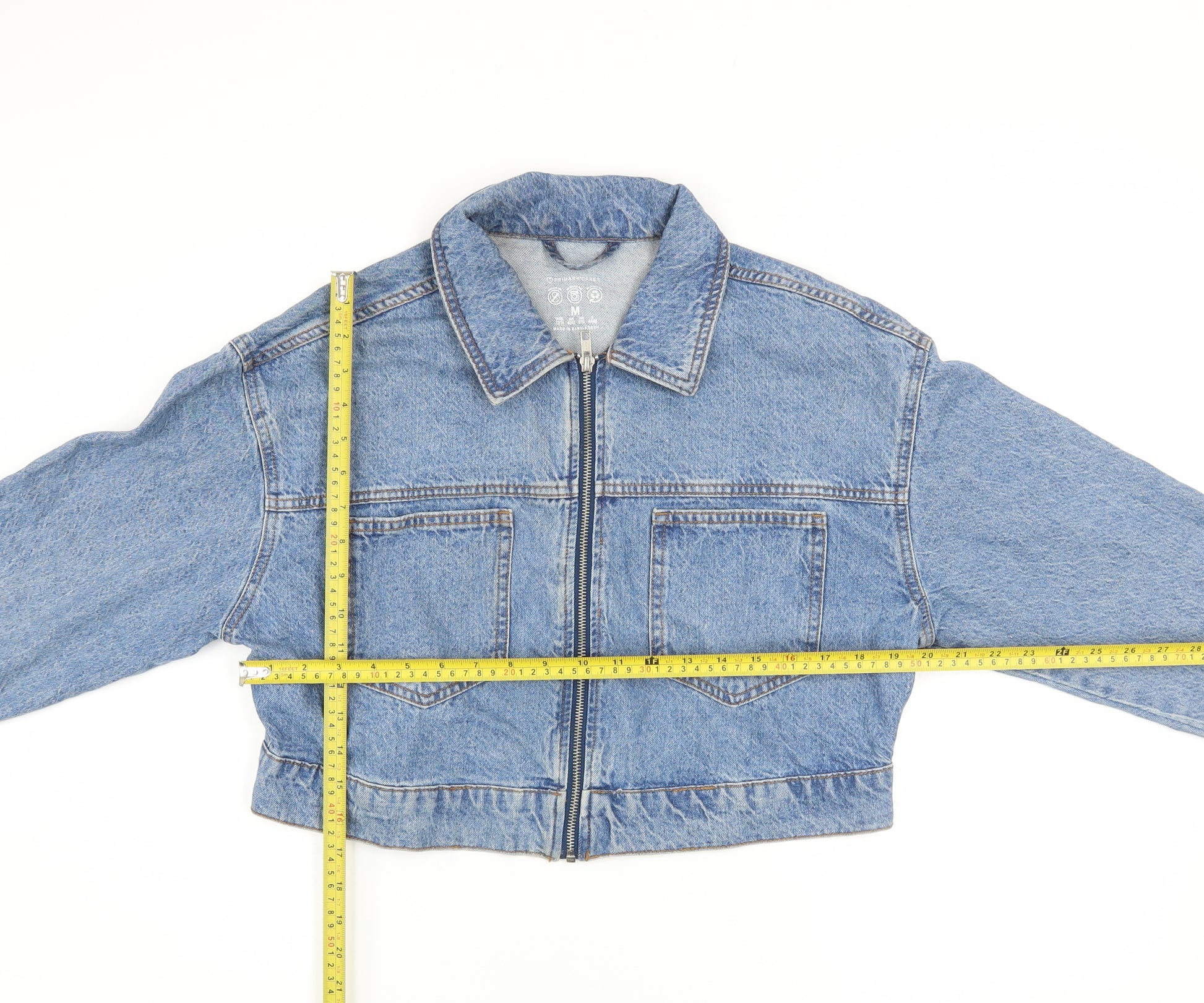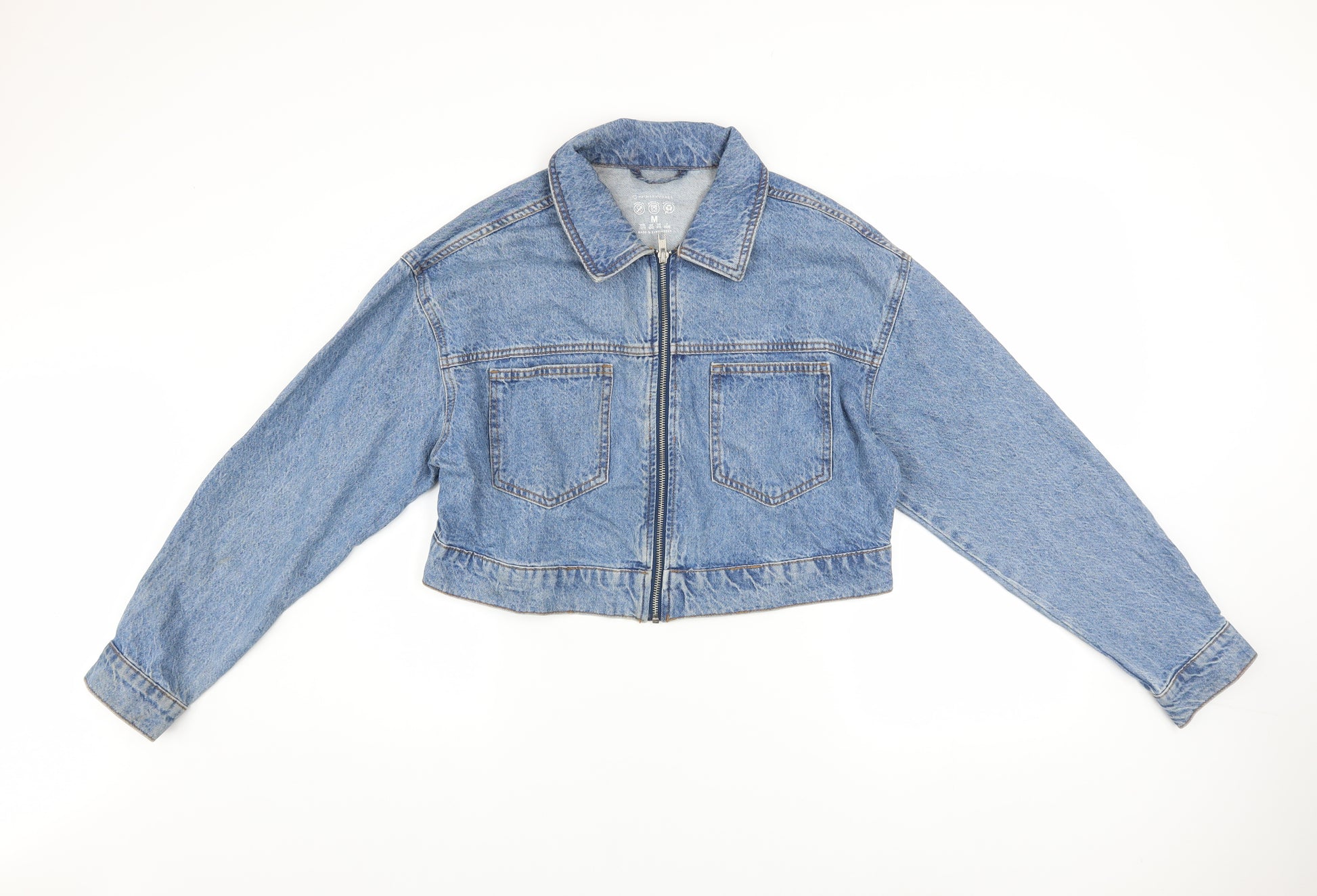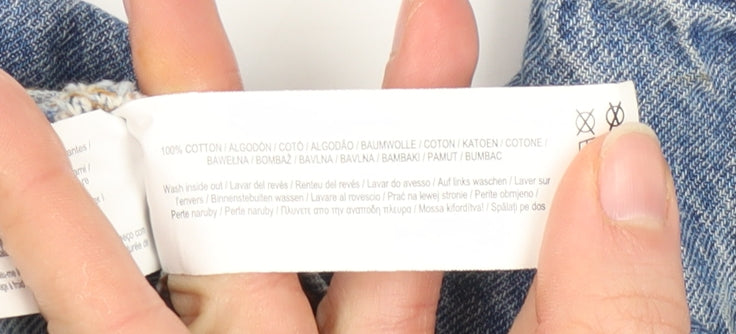 Add a timeless classic to your wardrobe with this Primark Women’s Blue Cropped Denim Jacket, designed for effortless layering and everyday style. Crafted from 100% cotton, this jacket delivers a soft yet durable feel, making it comfortable for casual occasions or as a lightweight outer layer in the spring and autumn seasons. The medium blue wash gives it that quintessential denim look that remains a staple year after year. Featuring a full zip front, two front chest pockets, and subtle button cuff details, this cropped jacket combines function and fashion. Its regular fit flatters the figure while the cropped length adds a modern, trendy twist to a traditional shape. Whether worn open over a t-shirt or zipped up with high-waisted jeans, this piece offers versatile styling options that can easily transition from day to night. Practical and comfortable, it’s perfect for pairing with skirts, dresses, or casual trousers for that effortlessly chic look. The Primark Cares label ensures that this jacket was made with environmental awareness in mind. With no visible flaws or major wear, the jacket is in excellent pre-owned condition and ready for immediate wear. This timeless denim jacket is ideal for those who love a relaxed, vintage-inspired charm without compromising on modern appeal. A must-have wardrobe essential suitable for casual outings, travel, or daily wear; this piece captures the perfect blend of simplicity, quality, and everyday ease. Refresh your outerwear collection with this versatile cropped denim jacket and enjoy effortless styling that complements every outfit. Be ready to showcase your casual confidence with this stylish denim piece that will quickly become your go-to favourite for layering.