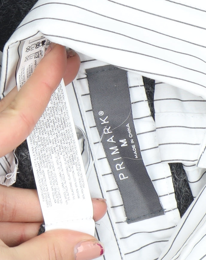 Elevate your everyday wardrobe with this stylish Primark women’s grey collared knit jumper, designed to bring a layered and polished finish to your outfit with ease. This medium-sized pullover combines the cosy comfort of a soft knit body with the smart sophistication of a crisp white pinstripe collar and hem insert, giving the appearance of a shirt layered perfectly underneath. Crafted from a comfortable and stretchy blend of polyester, acrylic, nylon, and elastane, the jumper feels soft against the skin while offering durability and shape retention. Ideal for cooler autumn and winter days, this lightweight yet warm knit makes a great choice for casual wear, workwear, or even smart-casual occasions. The long sleeves and timeless grey shade make it a versatile wardrobe piece that pairs beautifully with everything from jeans to tailored trousers. Its collared design offers a refined touch, while the classic fit ensures everyday comfort and a flattering silhouette. The jumper is machine washable, designed for easy care and low maintenance. Although this garment does not have original tags, it remains in excellent pre-loved condition with minimal signs of wear. No marks, pulls, or stains are visible, making it ready to wear straight away. Simple yet chic, this piece reflects understated Primark styling at its best, ideal for anyone looking to achieve a polished layered look without the bulk. Whether you’re heading to the office, meeting friends for a coffee, or putting together a smart-casual evening outfit, this grey collared jumper is a reliable and stylish choice. With its blend of comfort, practicality, and modern design, it’s a wardrobe staple you’ll reach for again and again. Don’t miss your chance to add this versatile piece to your collection — perfect for effortless, everyday elegance.