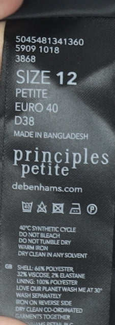 Step into classic sophistication with this Principles Petite black pencil skirt, impeccably designed for the modern woman who values both elegance and comfort. Tailored from a refined blend of 65% polyester, 33% viscose, and 2% elastane, this skirt delivers a smooth, structured drape with just the right amount of stretch for all-day ease. The quality fabric ensures durability, while the viscose content adds a soft hand feel, making it perfect for both professional and semi-formal occasions. The skirt is styled in a timeless straight and pencil silhouette, offering a flattering, figure-enhancing fit that gracefully skims the body. Falling to knee length, it’s ideal for workwear, business meetings, or smart casual outings. Subtle button detailing along the front panel adds a refined and tailored accent, while the concealed zip fastening at the back maintains a sleek, minimalist appearance. Inside, the skirt is fully lined for enhanced comfort and a smooth finish against the skin. This versatile piece pairs effortlessly with crisp blouses, fine knits, or tailored blazers, making it an essential addition to any wardrobe. Whether worn with heels for a formal look or flats for a more relaxed office-day style, this skirt transitions seamlessly from desk to dinner. Perfect for spring through winter wear, it’s an investment piece designed to complement your everyday wardrobe while maintaining timeless appeal.In excellent pre-owned condition with no noticeable flaws, this Principles Petite skirt represents refined quality and enduring style — a must-have for those seeking understated elegance at great value.