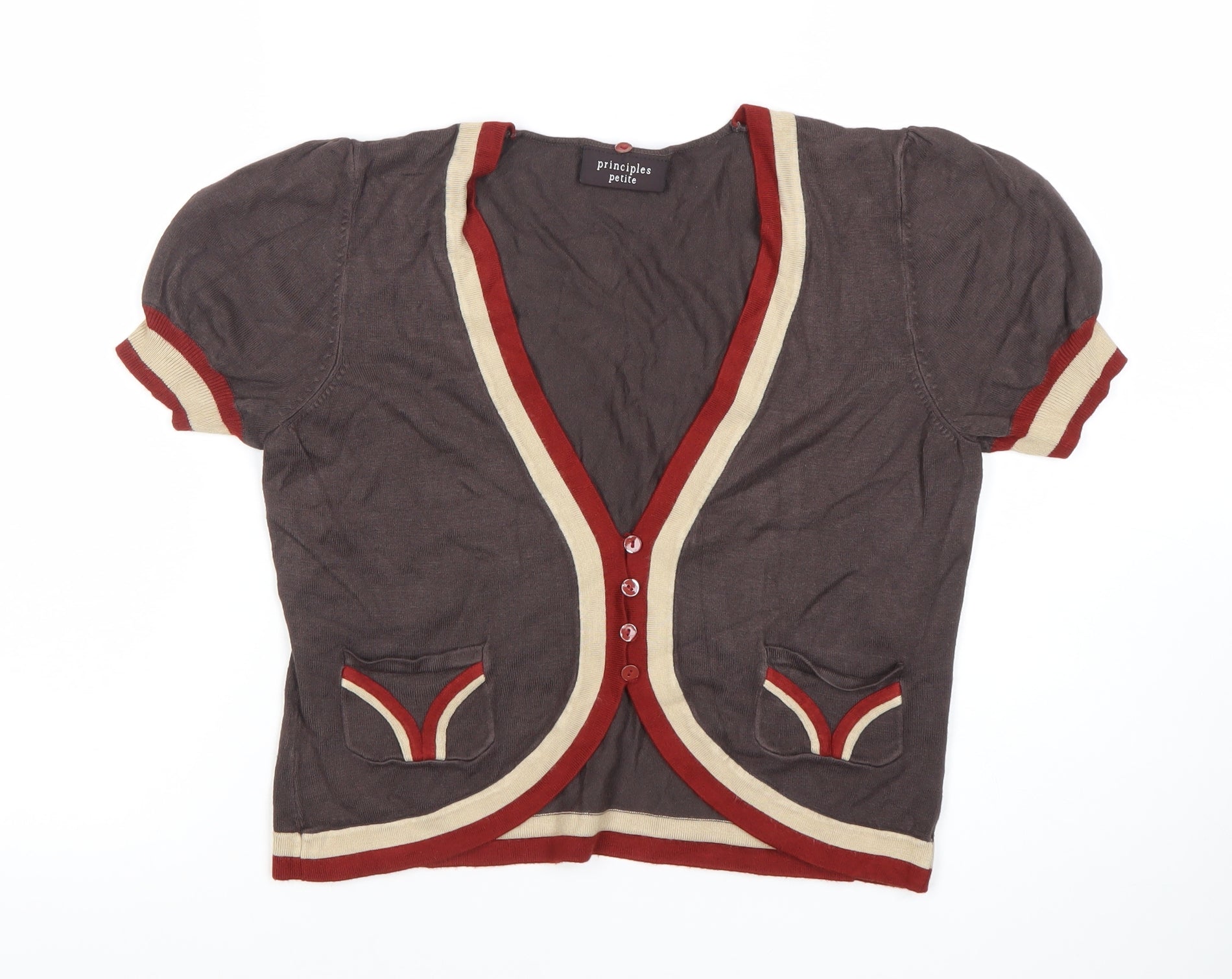 Discover a blend of elegance and comfort with this Principles Women’s Brown V-Neck Cardigan, perfect for enhancing your casual wardrobe. Crafted with a blend of 86% Viscose and 14% Polyamide, this lightweight knit cardigan is designed to offer both style and durability. The short puff sleeves add a touch of charm, making it ideal for warm summer days. Its versatile brown hue complemented with contrasting trims and button accents makes it easy to pair with any outfit. Featuring functional pockets, this cardigan not only looks chic but also provides the practicality you need. Perfect for women who appreciate a comfortable, yet fashion-forward look, this cardi will easily become a staple in your everyday ensemble. Machine washable for easy care, this slim-fit piece ensures you stay stylish effortlessly. Whether you're dressing up for a casual outing or a relaxed event, this Principals cardigan provides the perfect mix of style and comfort. Don’t miss out on this timeless addition to your wardrobe today!
