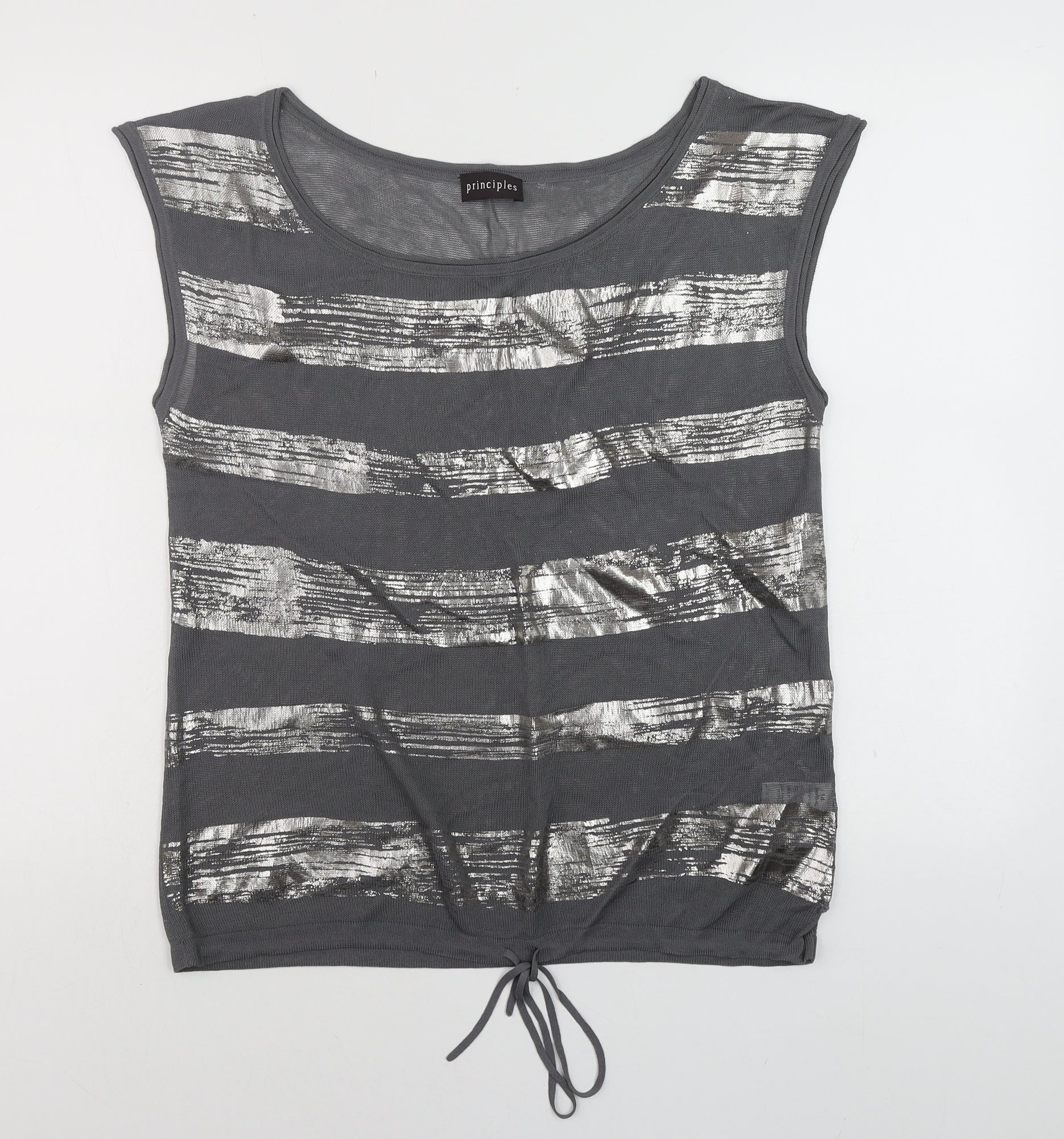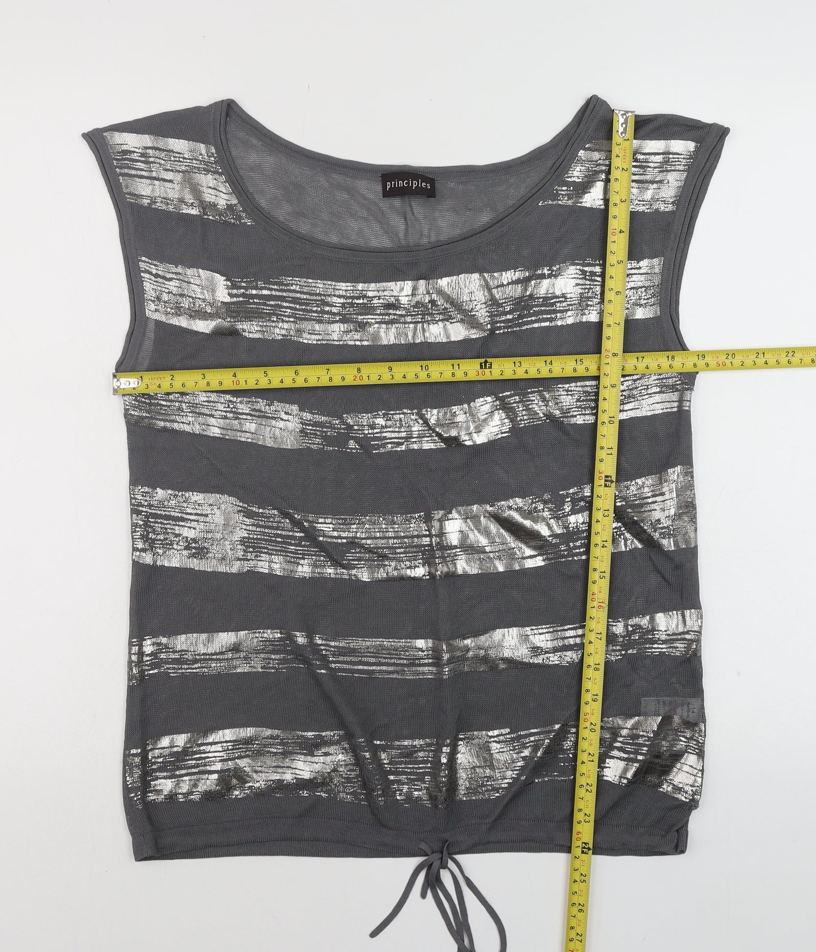 Add a touch of shimmer to your wardrobe with this stylish grey tank top from Principles. Crafted from 100% viscose, the soft and breathable jersey fabric drapes beautifully for a flattering fit. Designed in a regular size 14, it features wide metallic silver brushstroke stripes for a chic, contemporary look. The lightweight construction makes it perfect for warmer months, while the pullover style and drawstring hem offer effortless wear and comfortable movement all day long. Its sleeveless cut and scoop neckline make it a versatile addition that pairs seamlessly with jeans, skirts, or shorts for a relaxed daytime outfit, or dressed up under a blazer for an evening out. Ideal for casual occasions and summer wear, this top combines understated elegance with a playful touch of metallic shine. Whether you're heading out for a lunch date, enjoying a summer outing, or simply looking to elevate your everyday ensembles, this Principles tank ensures you stay stylish and cool. With its comfortable viscose fabric and subtle yet eye-catching design details, this top blends covetable simplicity with modern flair — a perfect staple piece for any woman's smart-casual collection.