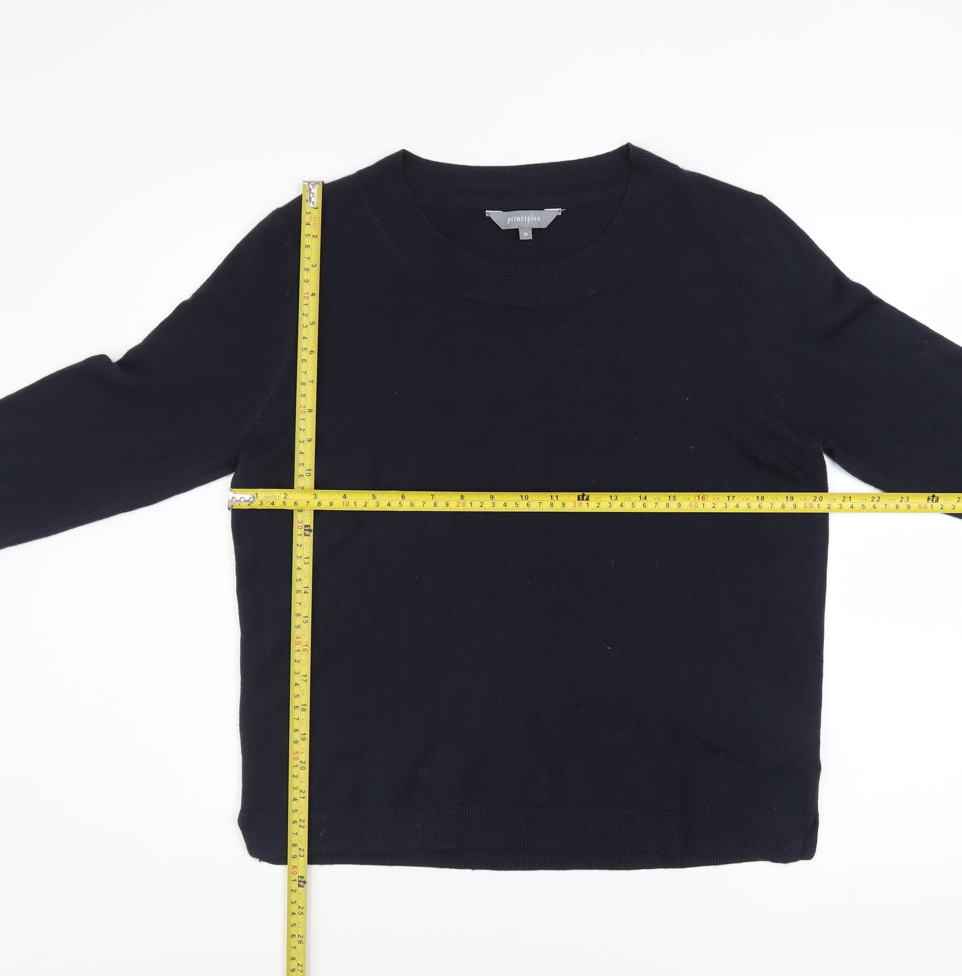 Elevate your everyday wardrobe with this timeless Principles women's black jumper, crafted with comfort and elegance in mind. Designed in a classic crew neck style, this jumper offers a clean, versatile silhouette perfect for layering or wearing on its own. Made from 100% acrylic, it provides the warmth and softness of knitwear while remaining lightweight and easy to care for. The fine tight-knit construction ensures a smooth, flattering drape that complements any figure and keeps you comfortable throughout the day. Finished with long sleeves, this jumper delivers stylish simplicity suitable for both casual weekends and smart workwear styling. Its sleek black shade makes it an essential wardrobe staple, pairing effortlessly with tailored trousers or your favourite jeans. The Principles label, from Debenhams, guarantees dependable quality and design you can trust. Ideal for autumn and winter wear, it’s perfect for layering under jackets or over collared shirts. Wear it to the office with a statement necklace or pair it with a skirt and boots for a cosy yet chic look. Carefully maintained and in excellent condition with no visible flaws, this jumper promises both durability and timeless appeal without sacrificing comfort. The machine-washable fabric means easy upkeep, making it a practical and stylish choice for busy lifestyles. Whether you’re heading out for a workday, weekend brunch, or casual evening, this Principles jumper will be your go-to piece for effortless sophistication. Add a touch of understated polish to your wardrobe with this classic black knit that blends minimalist design with lasting comfort. A must-have for any modern woman seeking everyday style that never goes out of fashion.