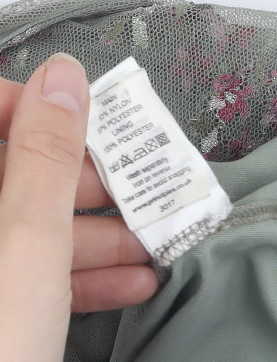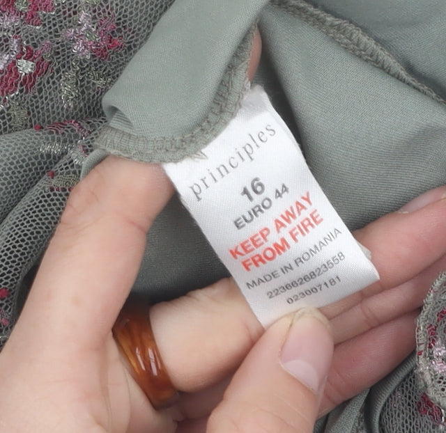 Elevate your wardrobe with this enchanting Principles women's floral wrap top, featuring a captivating blend of delicate embroidery and ruffled accents. Perfect for both spring and summer occasions, this versatile piece effortlessly transitions from casual daywear to a stunning cocktail or party ensemble. Made from a soft mesh fabric in a calming green hue, it showcases a charming floral pattern that adds a touch of nature-inspired elegance to any outfit.Crafted for style and comfort, the top is made primarily of lightweight nylon with a hint of polyester, ensuring breathable wear throughout the warm seasons. Its long sleeves provide an elegant silhouette, while the wrap style with a flattering V-neckline offers a chic and sophisticated look. The pullover closure ensures ease of wear, making it a practical choice for any occasion.Whether you're spending the day at a casual brunch or attending a garden party, this top promises to complement your style effortlessly. Its regular fit and size 16 sizing ensure a comfortable fit. Pair it with your favourite trousers or a skirt for a complete look that’s sure to impress. Hand wash only for best care. Ideal for women who appreciate timeless elegance with a modern twist.
