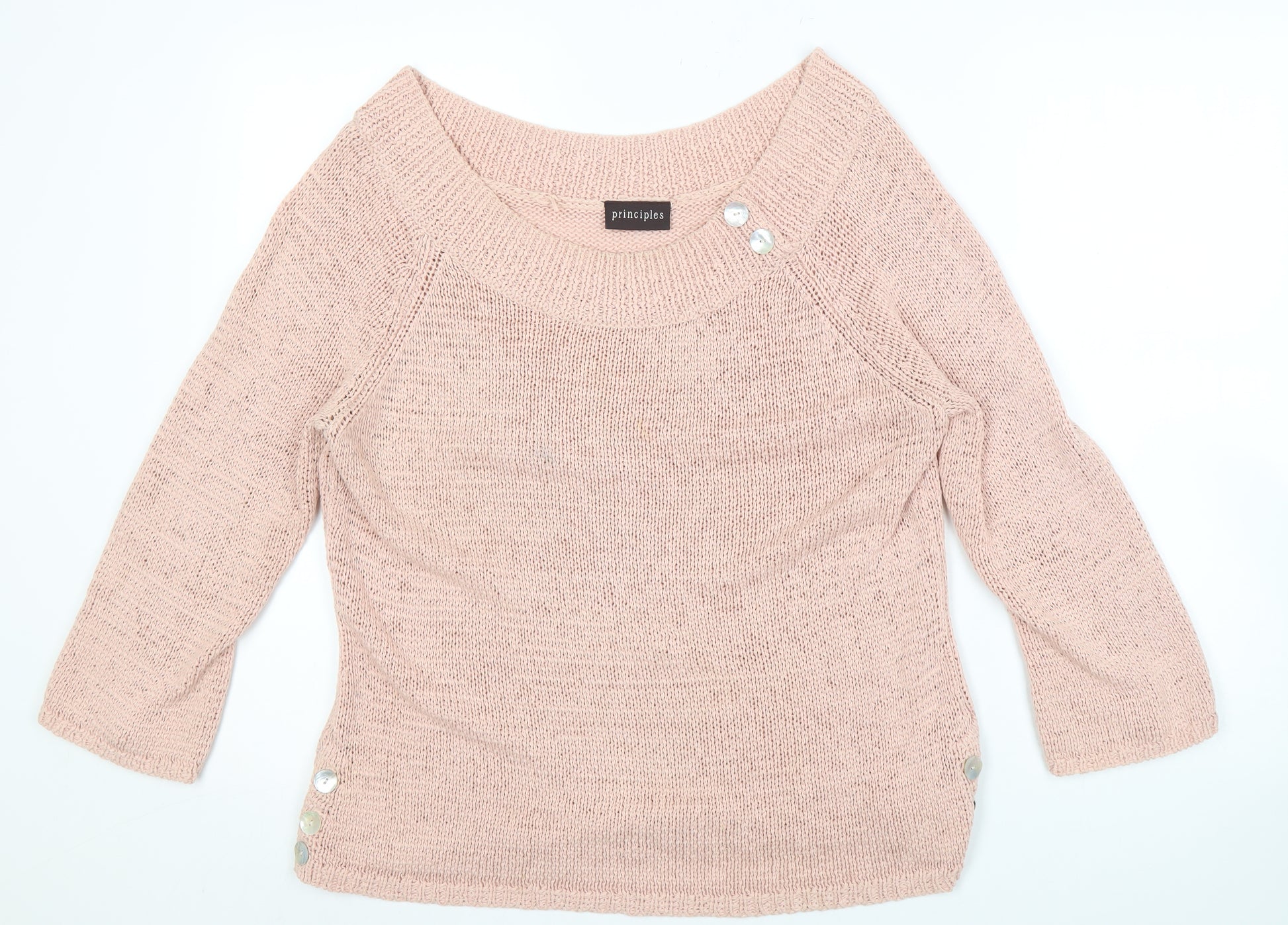 Embrace effortless style with this chic pink jumper from Principles. Crafted in an eye-catching open-knit design, this pullover combines comfort with a contemporary aesthetic. The boat neckline offers a graceful touch, while the 3/4 raglan sleeves provide a relaxed fit without compromising on warmth. Made from a quality blend of 55% acrylic and 45% cotton, this piece ensures a soft feel against the skin, making it perfect for breezy days. Its soft pink hue complements various outfits, making it a versatile addition to your wardrobe. Accented with delicate buttons, this jumper is ideal for casual outings and can easily transition into evening wear. Whether paired with jeans for a laid-back look or layered over a dress for added warmth, this knit is a wardrobe must-have. Machine washable for easy care, this piece remains in excellent condition, ready to offer style and comfort on numerous occasions.