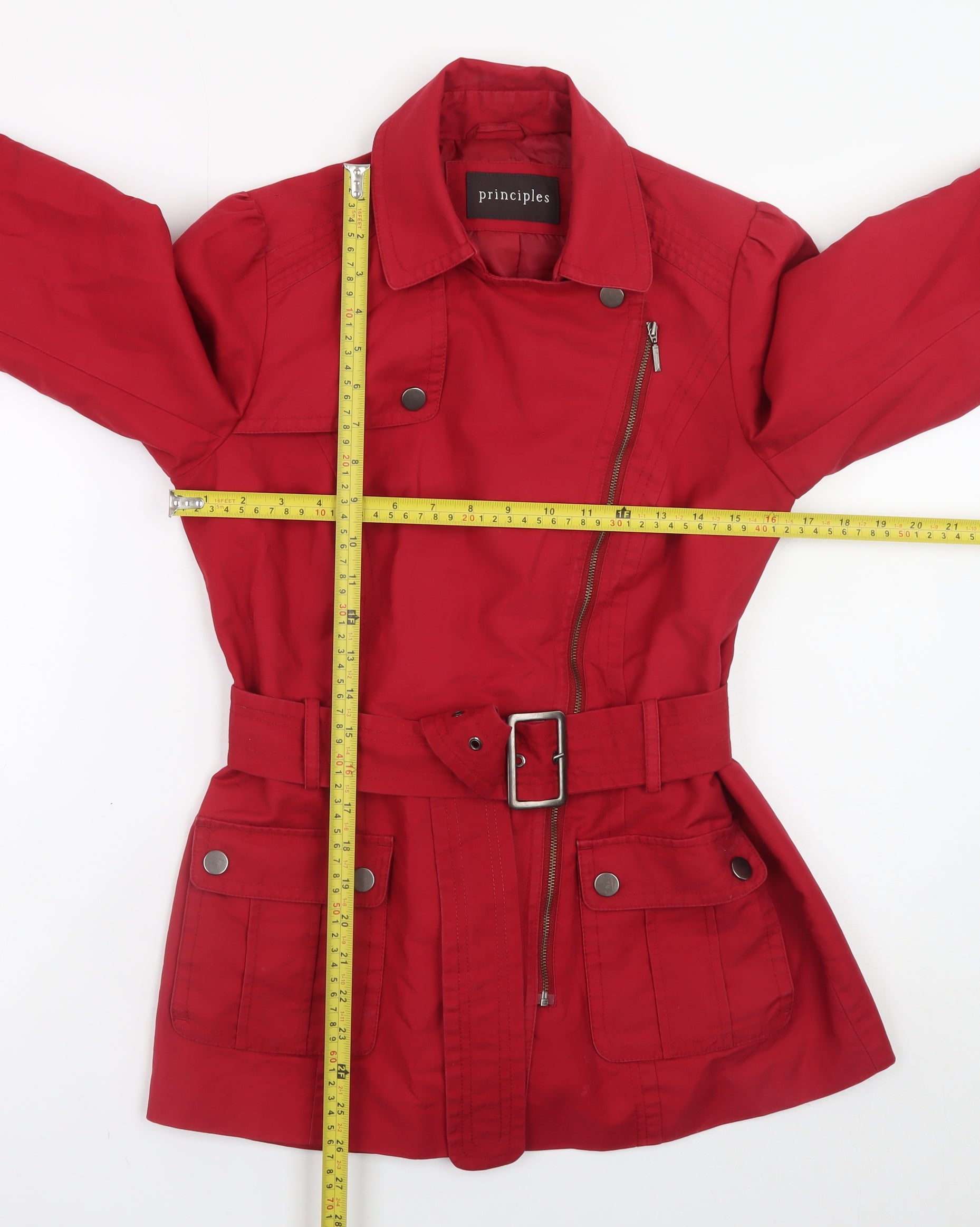 Add a splash of bold colour to your wardrobe with this chic Principles women's red cotton belted military-style jacket. Crafted from 100% cotton, it provides breathability and comfort while maintaining a structured silhouette that flatters your shape. The mid-length cut and fully lined interior ensure practicality and warmth for transitional seasons such as spring and autumn. Designed in a striking red hue, this jacket features eye-catching details like a buckled waist belt that cinches to accentuate your figure, along with decorative buttons, sturdy pockets, and an asymmetric zip closure for a modern touch. The collared design enhances its timeless appeal, giving it a smart and effortlessly stylish look suitable for casual outings, travel days, or even a polished workwear ensemble. The polyester lining adds extra smoothness for easy layering over your favourite tops, while the long sleeves provide full coverage and comfort. The belted waist and tailored fit make this jacket a flattering and versatile addition to your wardrobe, easily pairing with denim jeans, trousers, or dresses. With no visible stains or damage and only slight creasing consistent with light previous use, this Principles jacket remains in excellent condition. Easy to care for and machine washable, it’s a practical piece that perfectly balances functionality and fashion. Ideal for anyone seeking a statement outerwear option that can take them effortlessly from day to evening, this red military-inspired jacket offers timeless style and everyday wearability at a very appealing price.