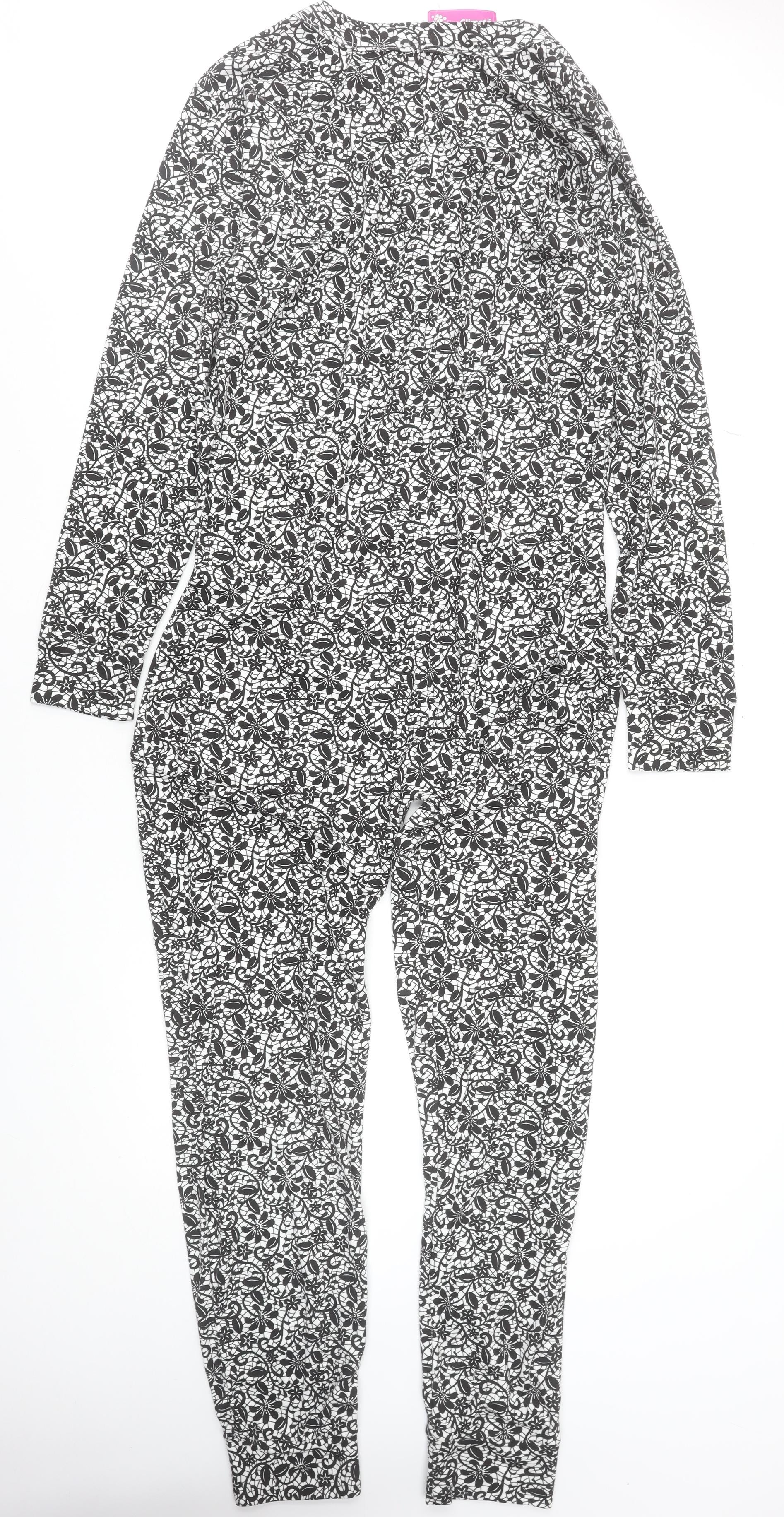 Relax in comfort and effortless style with this ProClimate women’s one-piece pyjama. Designed in a chic black and white floral print, it combines warmth, softness, and practicality—all ideal for cosy evenings or lazy mornings. Crafted from a balanced blend of 50% polyester and 50% cotton, the jersey fabric feels gentle against the skin while still being breathable, making it perfectly suited for year-round lounging. The full-length design provides total coverage, while the easy front button closure allows for quick dressing and removal. Long sleeves and cuffed legs contribute to a cosy fit that traps warmth without compromising on comfort. Cut in a flattering women's plus size 18-20 fit, this all-in-one nightwear offers an accommodating yet stylish silhouette that's ideal for relaxing in style. The round neckline gives a soft, feminine touch, keeping it practical and versatile for layering with a robe during cooler months. With its lightweight composition, it’s equally breathable through spring nights and comforting through winter. ProClimate’s thoughtful design makes this piece not only a sleep essential but a functional addition to any nightwear wardrobe. It’s machine washable for fuss-free garment care and remains durable even after multiple washes. This pyjama expresses understated elegance with its floral flowing pattern and monochrome palette, blending classic detail with a contemporary twist. Pair it with fluffy socks or slippers to elevate your bedtime look and stay comfortable while watching a film, reading in bed, or lounging on a Sunday morning. An excellent-quality garment with minimal signs of wear, this pre-loved piece continues to provide incredible comfort and value. Ideal for women who appreciate a touch of floral charm in their nightwear, this ProClimate one-piece makes a wonderful gift or a well-deserved treat for yourself. Pamper your evenings with this beautiful and practical sleepwear essential.