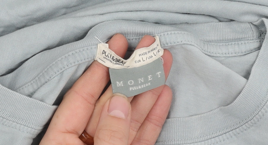 Step into the realm of classic art with this Pull & Bear men's T-shirt, featuring Claude Monet's enchanting Water Lilies print. In a serene shade of blue, this T-shirt celebrates the fusion of art and fashion, perfect for art enthusiasts and style aficionados alike. Crafted from 100% pure cotton, it delivers comfort and breathability, making it ideal for any casual occasion or outing. The regular fit silhouette ensures a relaxed feel, while the short sleeves add a touch of laid-back style. The crew neck design further enhances its casual appeal, making it an effortless choice for everyday wear. This jersey fabric T-shirt is machine washable, ensuring maintenance is as simple and straightforward as it is stylish.Although pre-owned, the T-shirt is in excellent condition, with only slight creasing and no visible tags, retaining its vibrant graphics and structural integrity. A versatile piece suitable for all seasons, pair it with jeans or shorts and let the famed Monet artwork speak for itself. This item is not vintage, yet it encapsulates the timeless appeal of fine art combined with modern fashion sensibilities.Elevate your wardrobe effortlessly with this Pull & Bear T-shirt, the ultimate selection for lovers of art-inspired fashion.