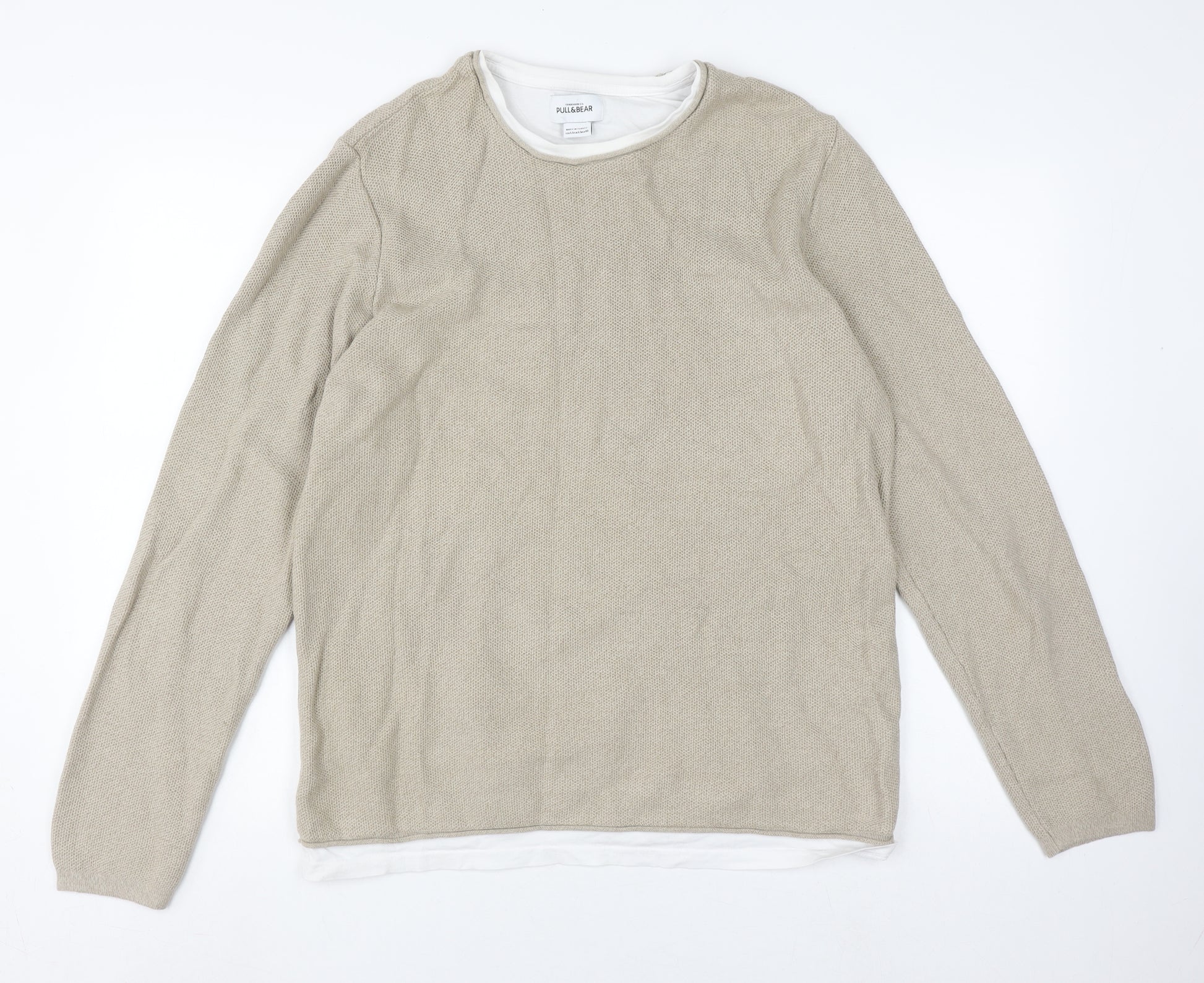 Upgrade your wardrobe with this stylish Pull&Bear Men's Beige Knit Pullover. Expertly crafted from 100% cotton, this pullover offers a tight-knit construction that ensures both warmth and style. The classic crew neck design makes it versatile for various occasions, whether you're heading to work or enjoying a casual day out. With its long sleeves and beige colour, this jumper effortlessly complements any outfit. Its regular fit provides a comfortable wear for all-day use. Though pre-loved, it's in excellent condition showing only slight signs of wear, ensuring longevity and continued style. Perfect for those looking to add a reliable and fashionable piece to their winter collection. Ideal for layering over shirts or under jackets, this pullover is sure to become a wardrobe staple.