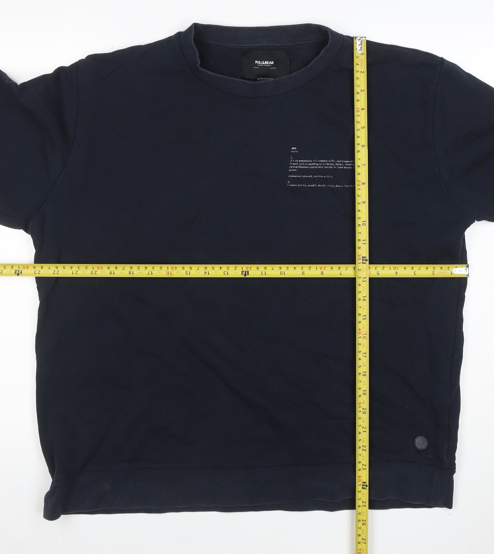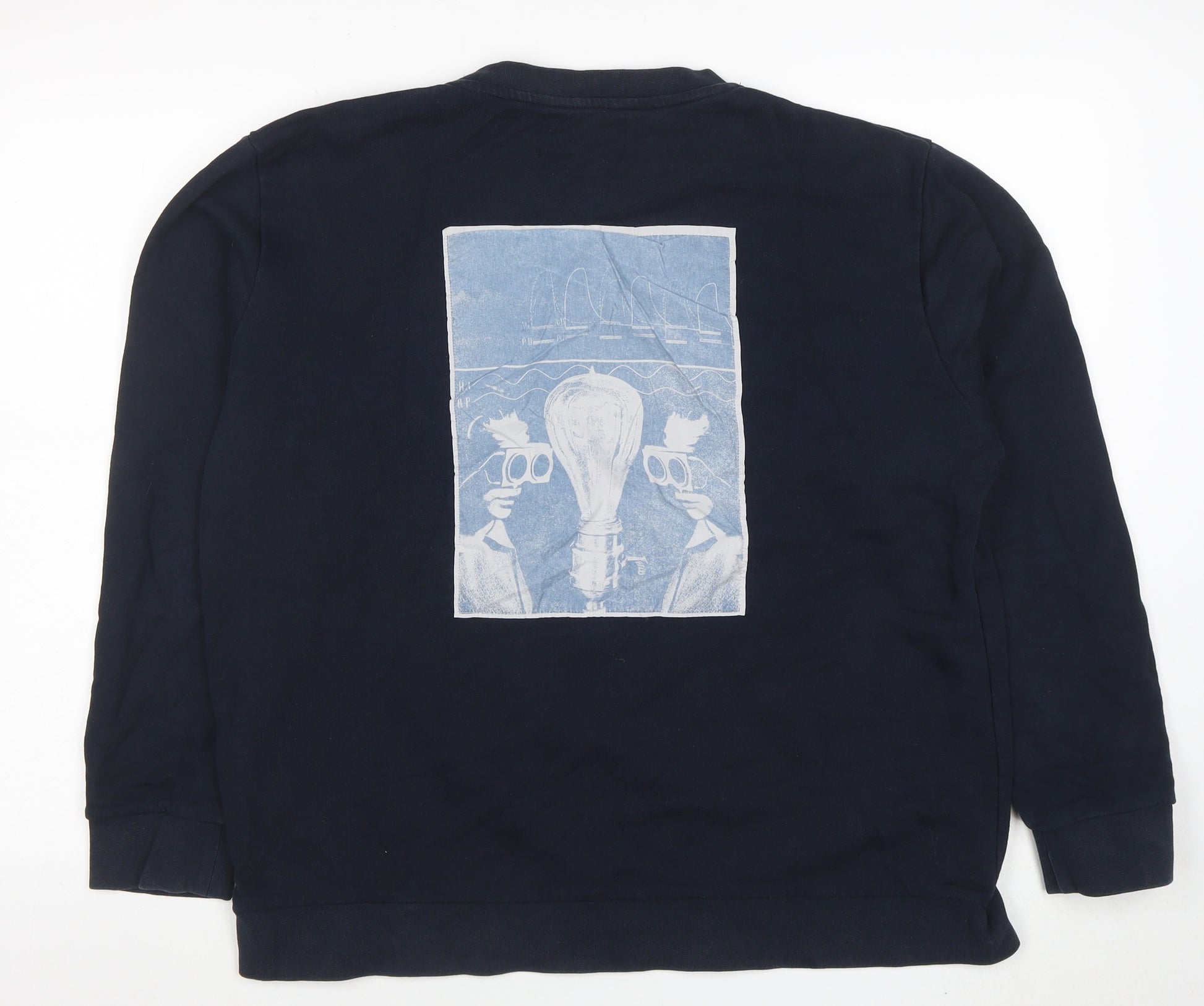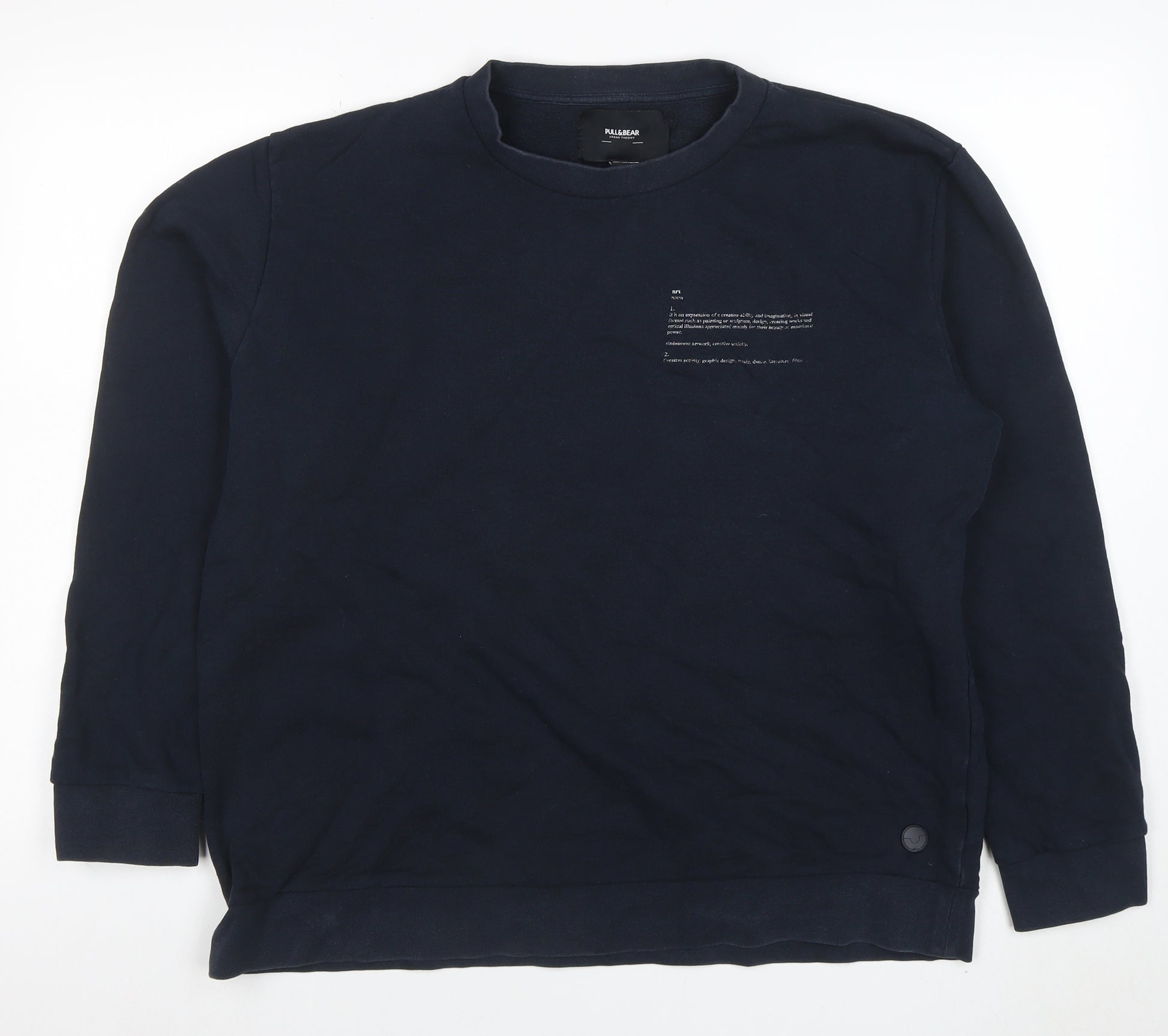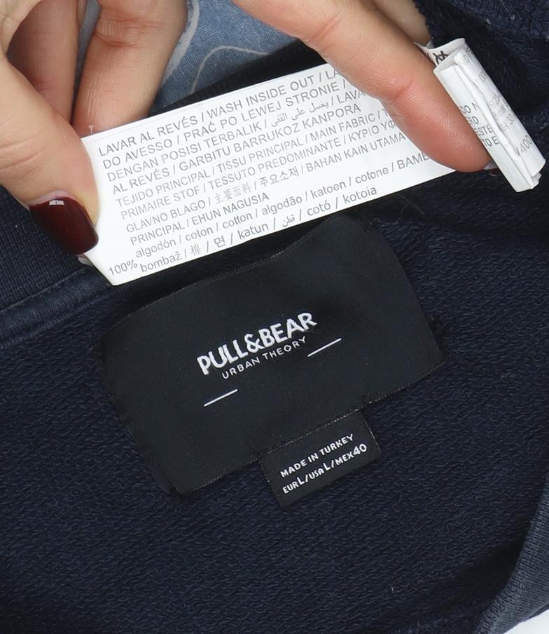 Elevate your casual wardrobe with this Pull&Bear men's navy blue pullover sweatshirt, combining comfort and creativity. Crafted from 100% soft cotton jersey, this sweatshirt offers a relaxed, breathable fit ideal for layering in the autumn, spring, or winter months. The piece features a crew neckline and long sleeves with ribbed cuffs and hem for a classic silhouette that flatters all body types while providing everyday comfort. The standout feature of this sweatshirt is its striking artistic graphic print on the back, lending it an urban, contemporary edge that’s signature to Pull&Bear’s streetwear-inspired aesthetic. A small logo-tag accent near the hem and subtle printed front detail complete the look, making it versatile for styling with jeans, chinos, or joggers. Its lightweight material ensures year-round wearability, suitable for everything from laid-back weekends to casual outings with friends.Although pre-owned, this sweatshirt remains in good condition with minor signs of wear including small holes near the seam – discreet and non-distracting from its overall stylish appearance. Designed for modern men who appreciate understated fashion with an artistic twist, this garment balances practicality and personality. Machine washable for easy maintenance and made in Turkey with quality craftsmanship, it retains its shape and comfort even after multiple wears.Perfect for those seeking an effortlessly cool aesthetic, this Pull&Bear crew neck sweatshirt embodies urban sophistication and wearable comfort. Whether you’re adding it to your collection of graphic streetwear or shopping for a reliable layering piece, this versatile navy sweatshirt makes a great choice. A staple for cooler days that doesn’t compromise on style or comfort, it’s ideal for completing your casual-day look with confidence and individuality.