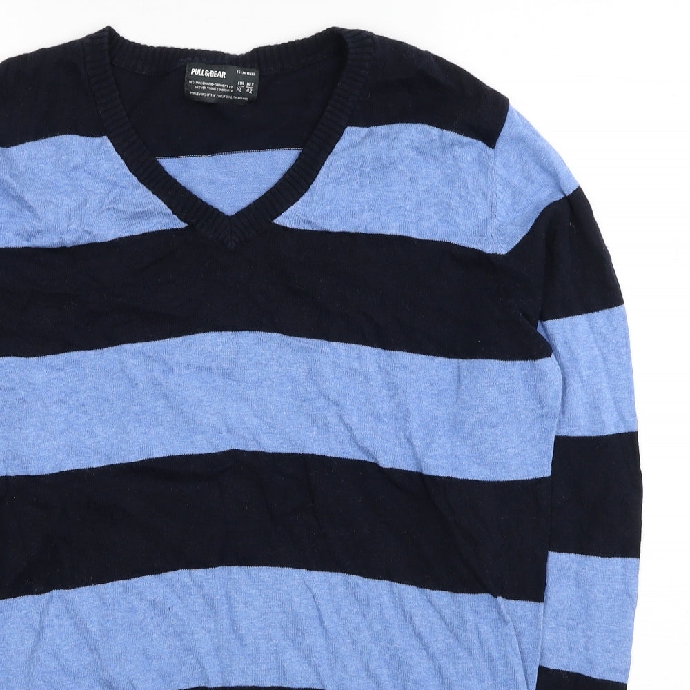 Mens Blue V-Neck Striped Acrylic Pullover Jumper Size XL