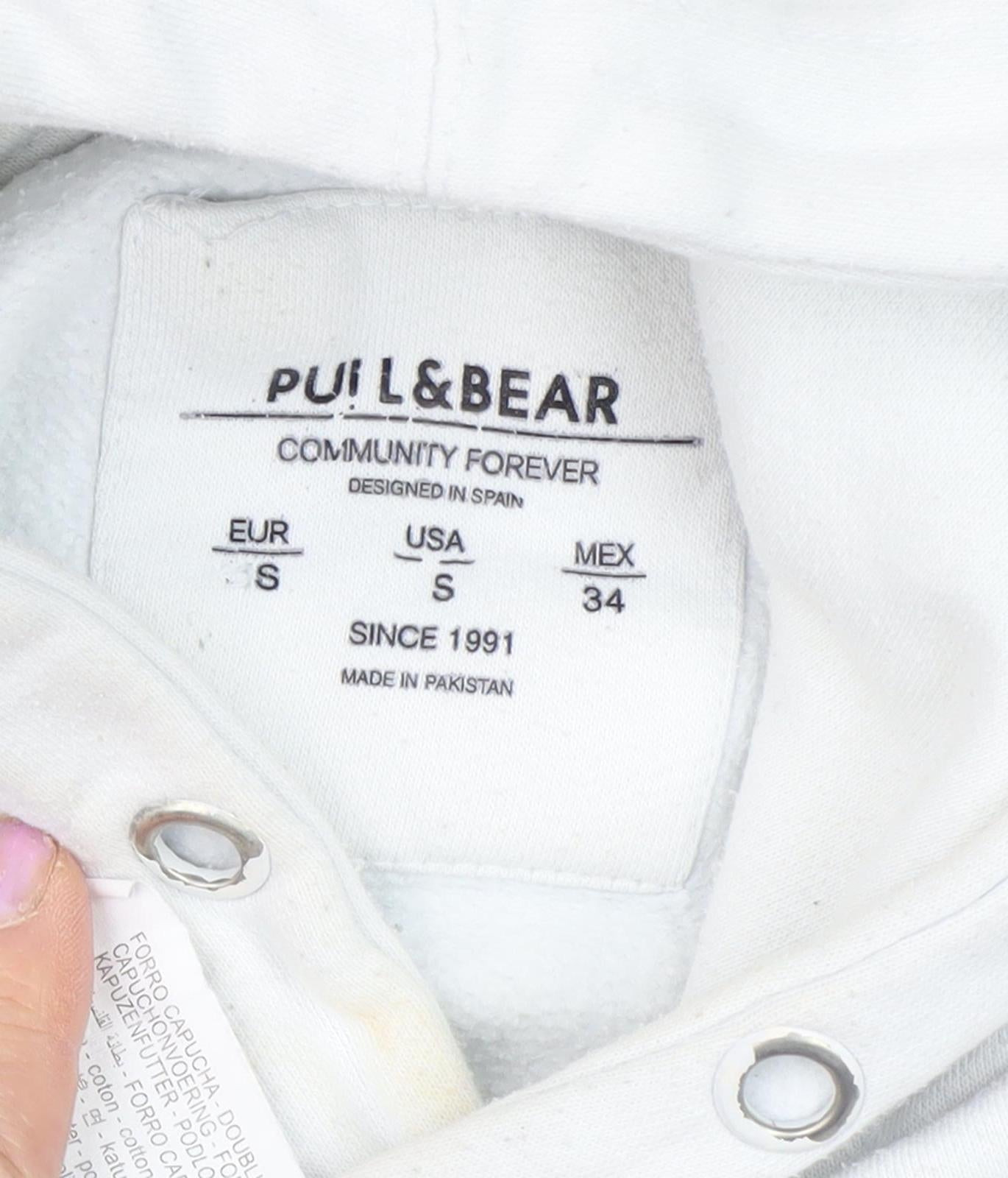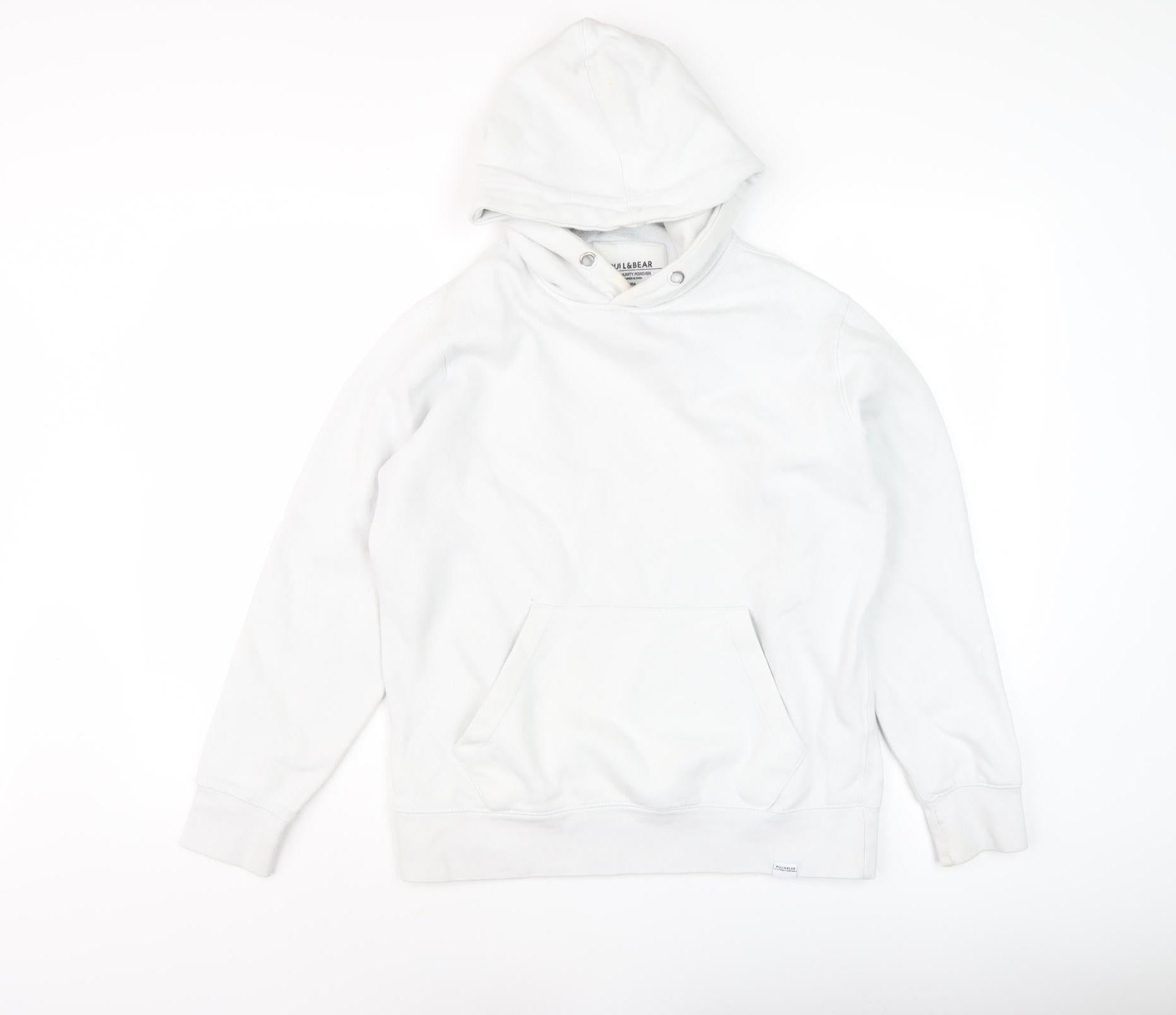 Embrace casual sophistication with this versatile Pull & Bear hoodie in crisp white, perfect for upgrading your everyday look. Designed for men, this pullover style hoodie is crafted from 100% cotton, ensuring a soft and comfortable feel against your skin. The fleece fabric provides warmth, making it an ideal choice for both autumn and winter seasons. Featuring a classic crew neck and long sleeves, this piece also comes complete with a drawstring closure to adjust the fit and secure the hood, ensuring you stay cosy in varying weather conditions. Practical front pockets offer added functionality, letting you keep essentials close at hand or simply warm your hands. Though there are visible stains on the sleeve, this piece remains in good condition, offering a stylish and relaxed fit for regular wear. Machine washable, this hoodie is easy to care for, making it a practical addition to your wardrobe. Whether you are lounging at home or stepping out, this Pull & Bear hoodie offers effortless style and comfort.