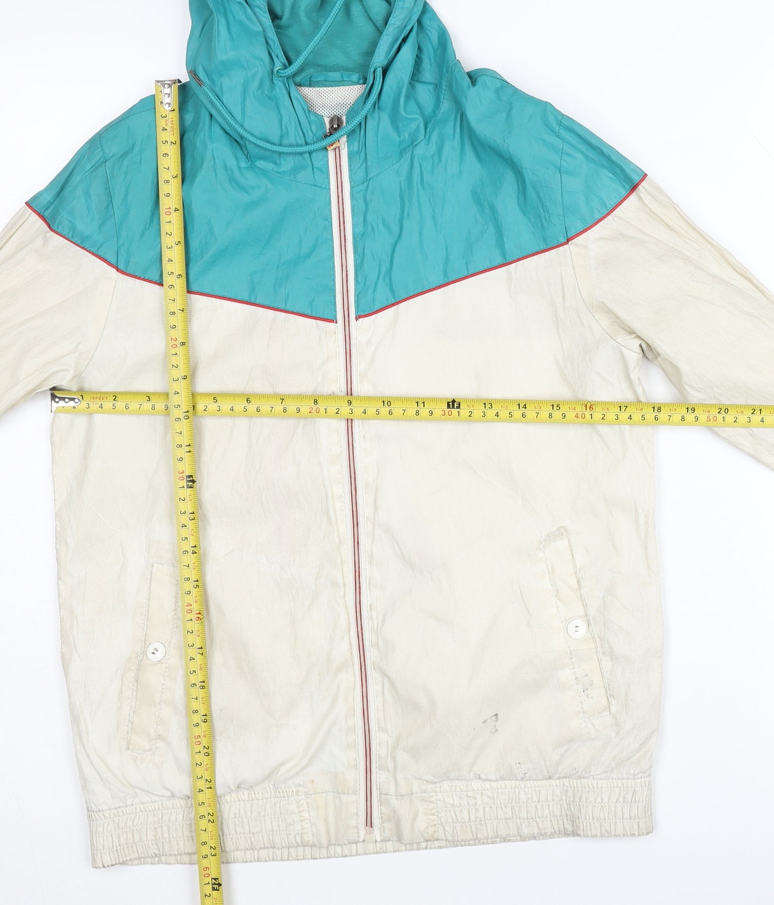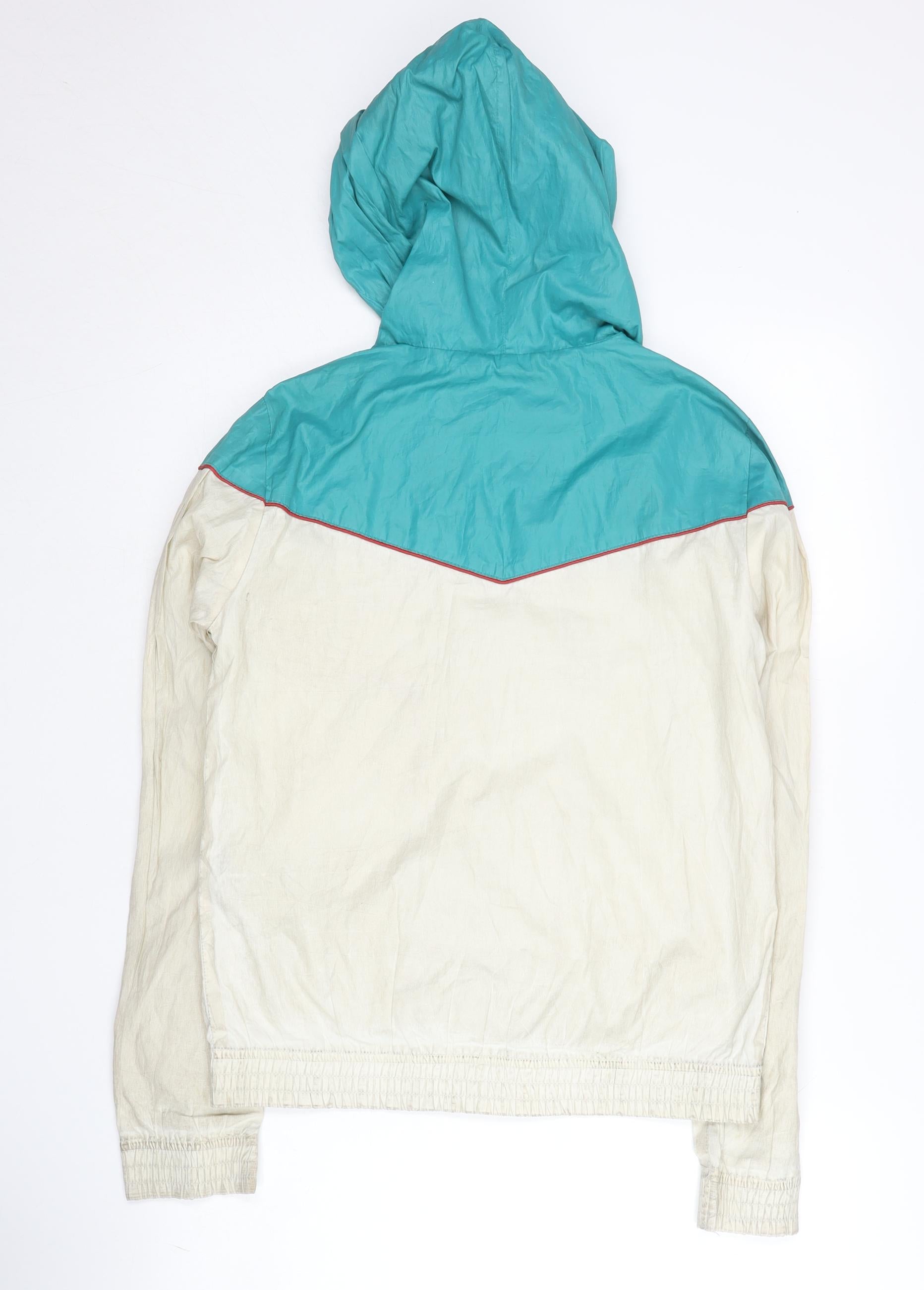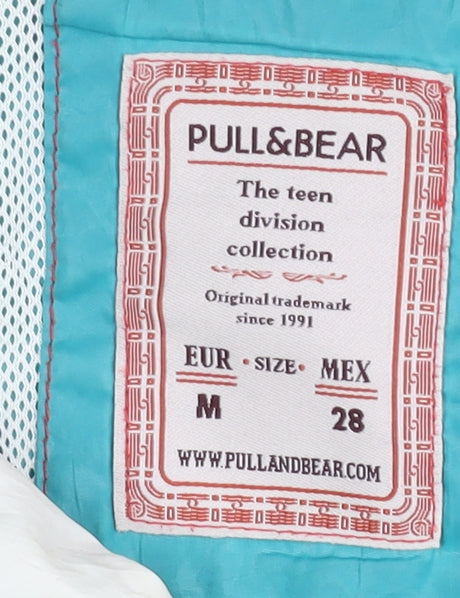 Embrace a fresh and sporty aesthetic with this Pull&Bear windbreaker, perfect for teens who love an active lifestyle. Crafted from durable polyester, this colourblock jacket features a vibrant blue and beige palette that's both trendy and versatile. The medium-sized design offers a comfortable regular fit, enhanced by practical features like a hood and full zip closure to keep you protected from the elements. Two spacious pockets add functionality, making this an ideal choice for everyday wear, whether you're heading to school, engaging in outdoor activities, or just hanging out with friends. Although pre-owned with minor marks, its good condition ensures plenty of wear left. Add this stylish and functional piece to your wardrobe for a touch of casual flair that's perfect for all seasons.