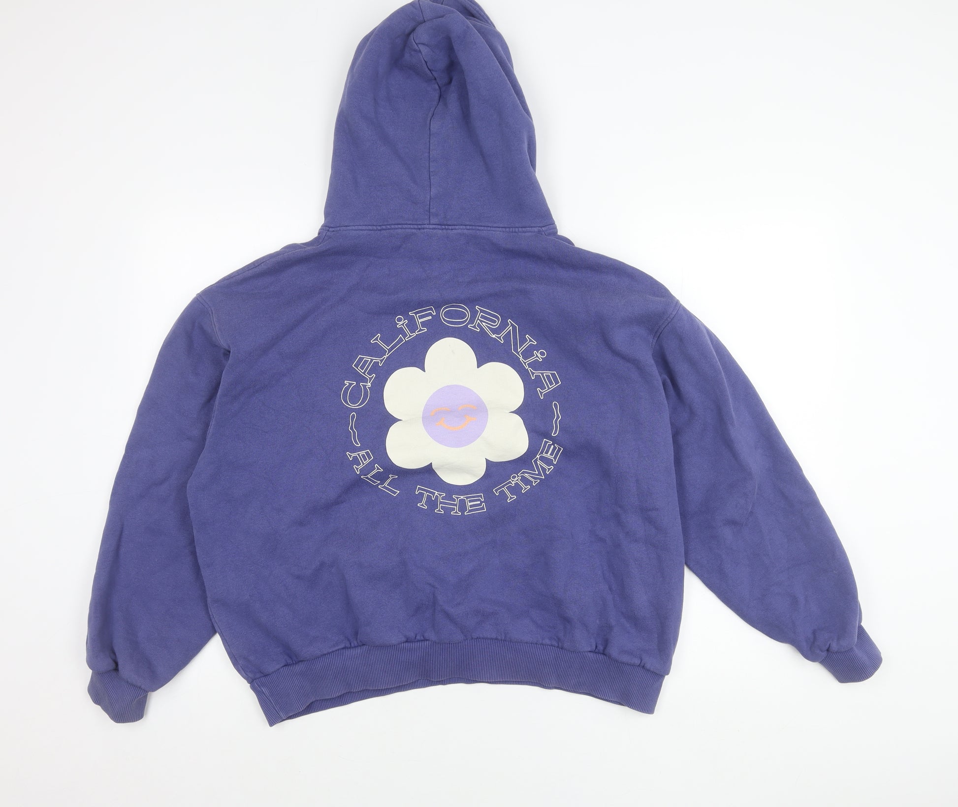 This Pull&Bear pullover hoodie from the Pacific Republic Teen Department is a stylish and comfortable everyday essential. Crafted in Portugal, this piece blends quality cotton and polyester for a soft yet durable finish. With its regular fit, long sleeves, and practical hood, it offers both comfort and versatility, making it ideal for casual wear throughout spring, autumn, and winter. Featuring a striking graphic print design that showcases a bold California-themed flower logo on both the front and back, it brings a fresh, youthful vibe to any outfit. The kangaroo pocket adds a useful and relaxed touch, perfect for keeping hands warm or securing small essentials. Designed in a blue hue, this hoodie pairs effortlessly with jeans, joggers, or casual skirts, offering wardrobe flexibility whether for school, social outings, or laid-back weekends. The ribbed cuffs and hem enhance fit while the drawstring closure at the hood allows for adjustable comfort. Lightweight yet cosy, it works well layered over a t-shirt or under a jacket depending on the weather. In very good pre-owned condition, this hoodie shows light fading and minor wear consistent with gentle use, which adds to its authentic laid-back style without affecting quality or wearability. Machine washable for easy care, it is practical for everyday use. A fashionable and versatile staple for teens, it embodies Pull&Bear’s youthful, California-inspired aesthetic, bringing fun and comfort together in one stylish classic. Whether worn casually at home or as part of an active day out, this hoodie will keep you looking and feeling great.