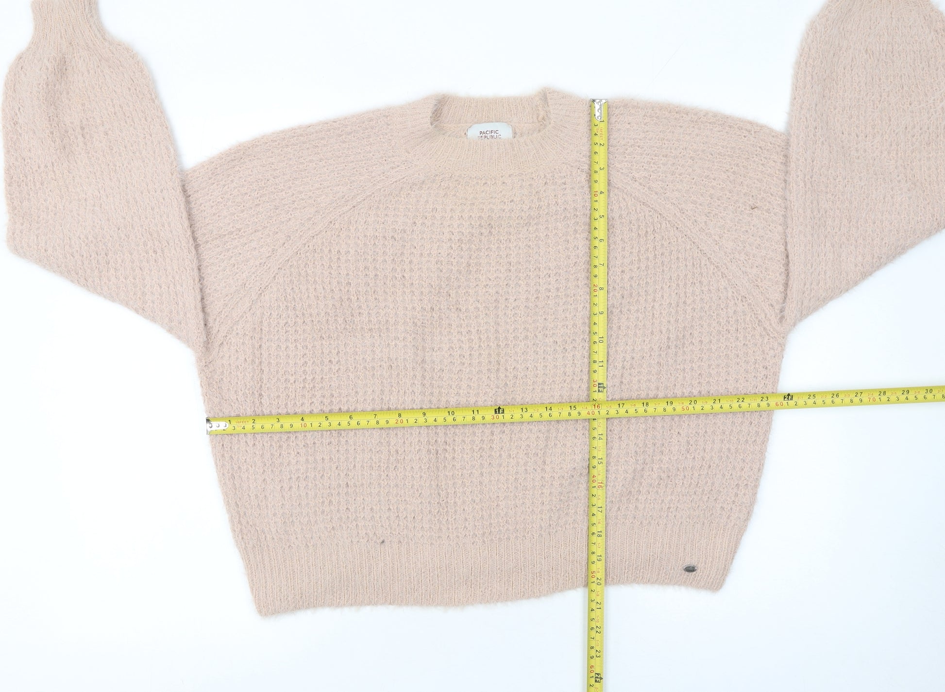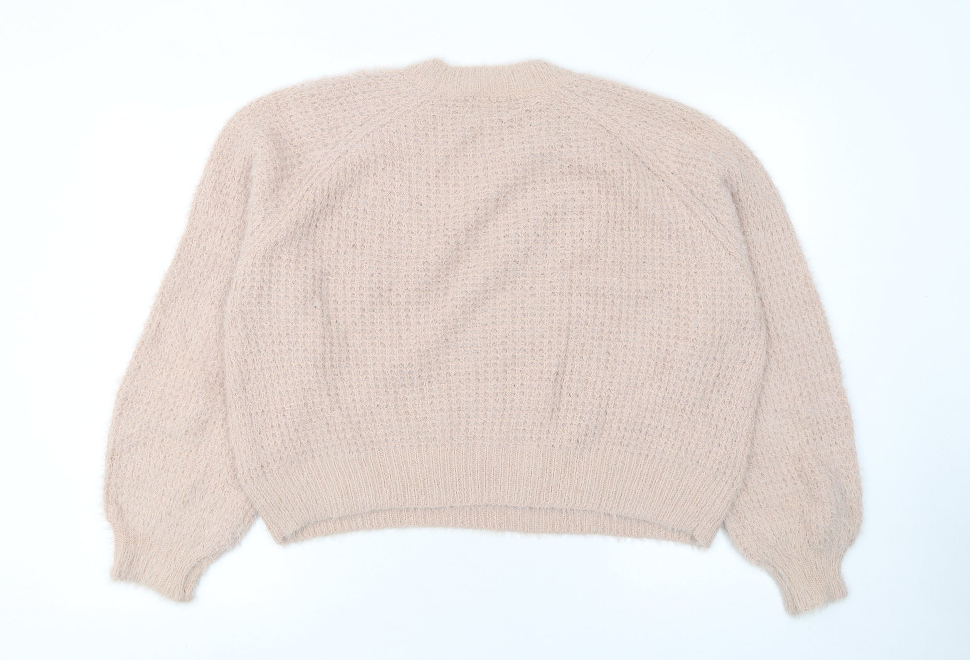 Stay effortlessly cosy and stylish with this Pull & Bear women’s jumper in a soft beige tone. Crafted from a comfortable blend of acrylic, wool, and nylon, this pullover brings the perfect balance of warmth and lightweight wear, making it ideal for layering through those chillier autumn and winter months. The waffle-knit texture gives the fabric extra dimension and a distinctly modern, tactile finish, elevating a classic look into a statement of relaxed elegance. The crew neckline and ribbed cuffs maintain a timeless silhouette, making it easy to pair with everything from jeans and boots to skirts and tights.Designed in a regular size 8 fit, its raglan sleeve construction ensures freedom of movement and an easy drape across the shoulders, while the relaxed shape flatters without feeling restrictive. The knit has a soft, slightly fuzzy handfeel for that gently brushed texture often sought in quality wool-blend styles. Perfect for everyday comfort, this jumper strikes that sweet spot between casual chic and laid-back luxury.This Pull & Bear jumper is perfect for versatile dressing—snuggle up on a lazy day indoors or layer it neatly under a structured coat for a modern streetwear-inspired look. Whether teamed with your favourite high-waisted denim or tailored trousers, its neutral beige hue makes it endlessly matchable. The hand wash only care ensures the knit retains its softness and shape over time. Excellent condition with minimal signs of previous wear. A cosy wardrobe essential that encapsulates Pull & Bear’s effortlessly cool and youthful aesthetic, ready to keep you comfortable and stylish at every turn.