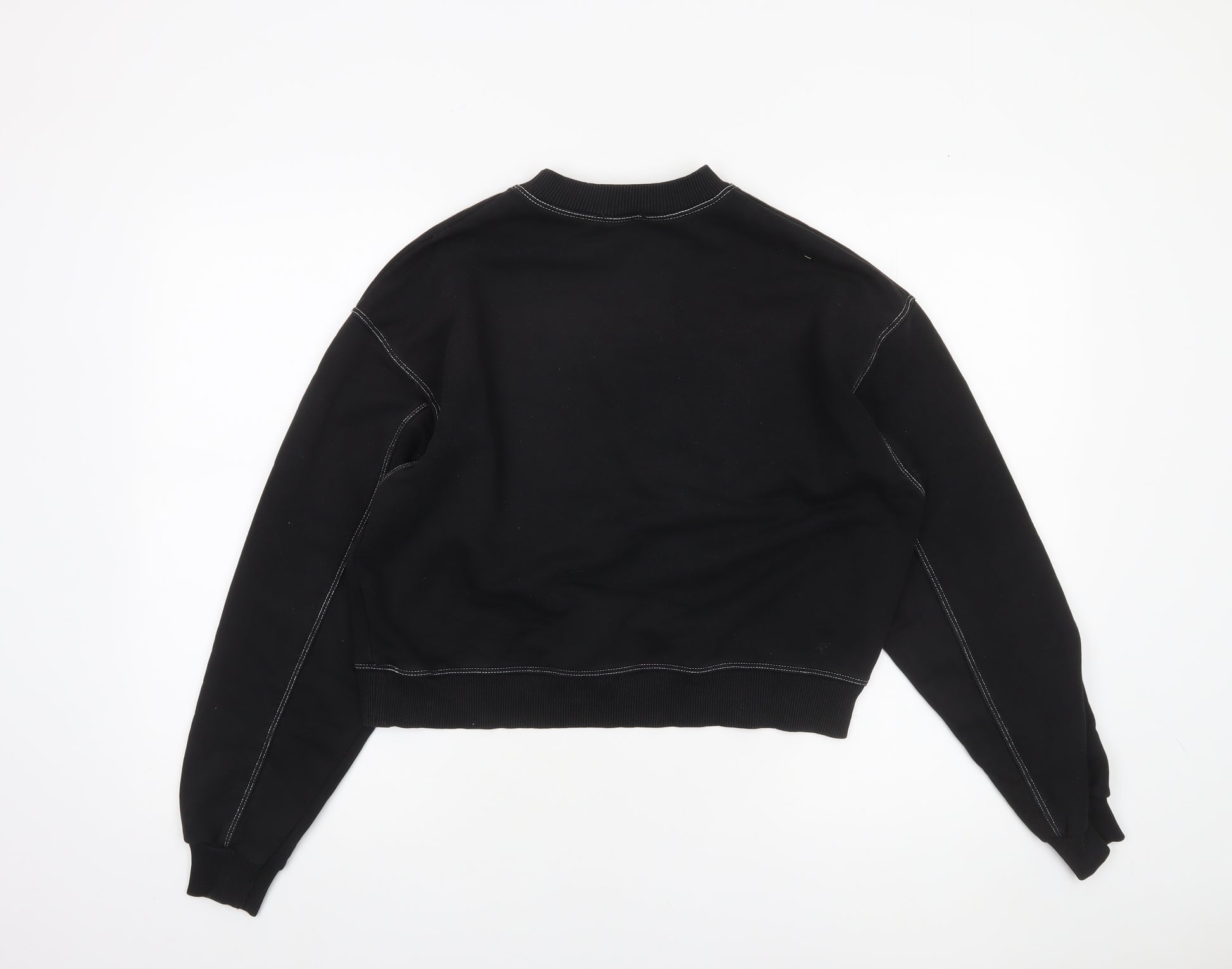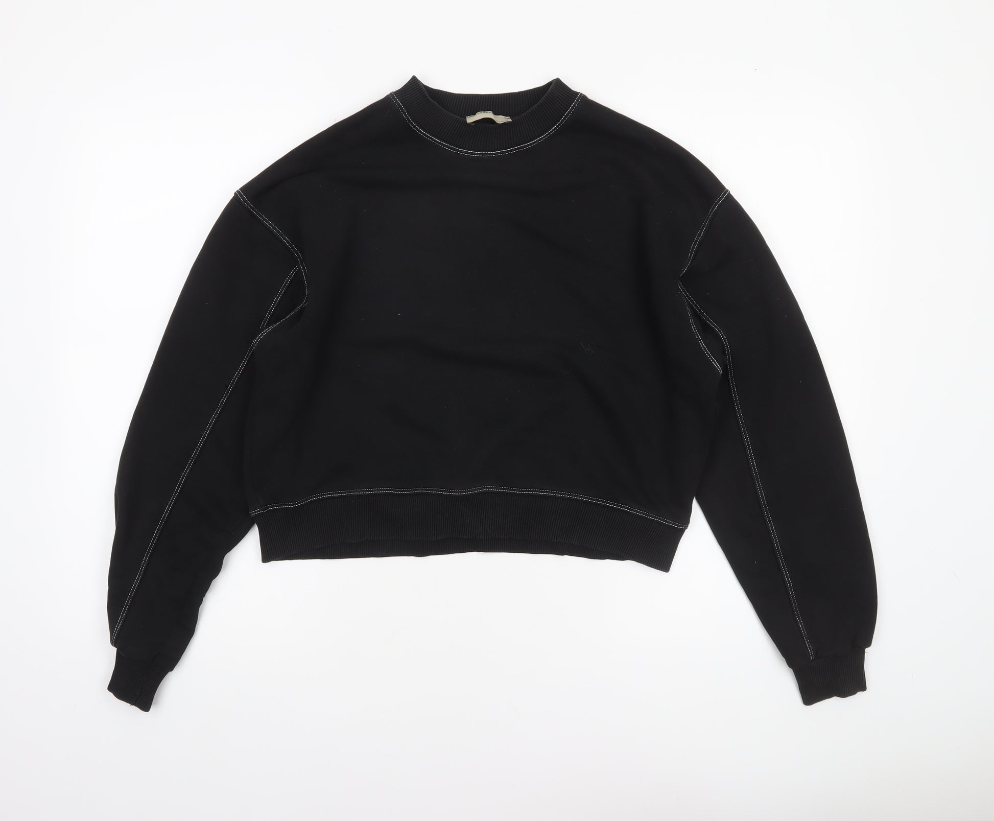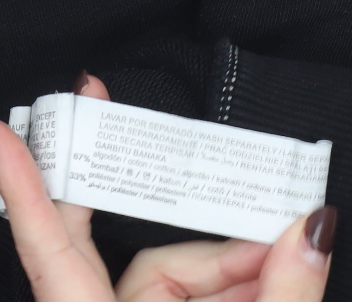 This Pull & Bear women’s black crew neck sweatshirt offers a perfect combination of modern street style and timeless comfort. Crafted from a soft, breathable blended fabric of cotton and polyester, the sweatshirt provides a medium-weight feel that’s ideal for all seasons. Featuring a relaxed fit and casual silhouette, it’s designed to sit comfortably on the body while offering an effortlessly stylish look suitable for both everyday wear and leisure activities. The contrast stitching adds an understated detail, giving the piece a slightly edgy and urban aesthetic. The hem and cuffs are ribbed, ensuring durability and maintaining shape after each wash. Designed with practicality in mind, this pullover sweatshirt is an easy-care option, machine washable for everyday convenience. The black shade makes it extremely versatile — pair it with jeans, joggers or even over a dress for a more laid-back chic style. Perfect for cool-weather layering or transitional seasonal wear, it’s a wardrobe essential that can easily transition from casual outings to travel days or relaxed workwear. Pull & Bear’s quality craftsmanship and attention to detail are displayed in the precise stitching and fabric comfort, giving a piece that feels soft to the touch and retains structure wash after wash. Whether you’re relaxing at home, going out with friends, or heading to the gym, this sweatshirt adapts seamlessly to your lifestyle. Condition is excellent with no visible flaws, making it a great-value, gently worn piece ready to wear. Grab this effortlessly chic, versatile pullover today to refresh your casual collection with a look that balances comfort, simplicity and urban edge.
