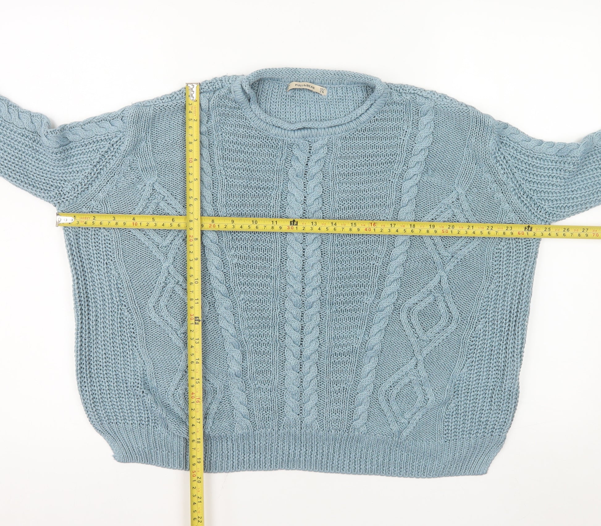 Stay cosy and stylish this season with this charming women's cable-knit jumper from Pull & Bear. In a soft and delicate blue shade, this pullover offers a timeless knitted pattern that blends both warmth and fashion effortlessly. Crafted from 100% acrylic, it provides the comfort of a classic winter jumper while remaining lightweight and easy to care for. The soft knit material feels gentle against the skin, making it ideal for layering during chilly autumn and winter days. Featuring a crew neckline and long sleeves, this jumper embraces a regular fit that flatters all body shapes, combining comfort and versatility with an effortlessly relaxed look.Designed with a traditional cable-knit texture, this jumper exudes casual charm while maintaining a polished and wearable appearance suitable for everyday outings, weekends, or even cosy evenings at home. Whether paired with denim jeans, skirts, or layered over a collared shirt, it’s the perfect staple piece for those wanting an easy-to-style knitwear essential. The ribbed hem and cuffs ensure a snug fit that helps retain warmth, making it your go-to garment when the temperature drops. The simplicity of its design enhances its adaptability and allows it to transition seamlessly between casual and slightly dressier occasions.This Pull & Bear jumper is ideal for women who appreciate comfort without compromising on style. With its regular fit, durable knit, and soft finish, you’ll find it an ideal piece to complete your winter wardrobe. Although gently worn, it remains in excellent condition with no signs of visible damage, reflecting careful maintenance and reliable quality. Easy to care for, this machine washable pullover will quickly become one of your favourite pieces for seasons to come. Perfect for casual days, layering options, or adding a cosy yet elegant touch to your daily attire.