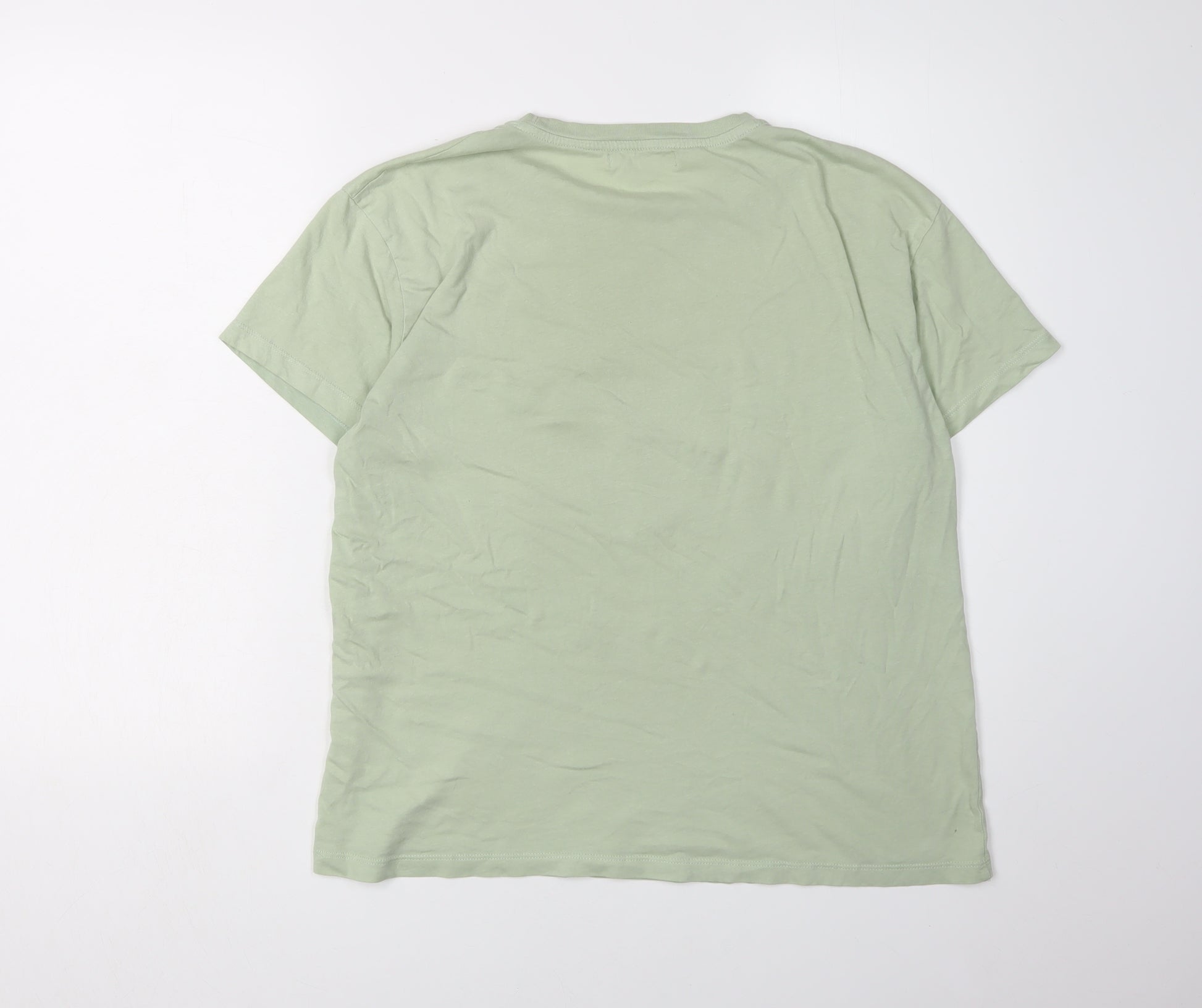 Elevate your casual wardrobe with this Pull & Bear Women's Graphic T-Shirt, ideal for everyday wear. The natural green colour embodies a serene essence, while the prominent graphic on the front injects a vibrant spirit of nature and spirituality, making it perfect for those who love to make a statement. This regular fit, short sleeve T-shirt is crafted entirely from high-quality cotton, offering a soft and breathable experience that's perfect for the warmer months of spring and summer. Designed with a crew neckline, its jersey fabric ensures both comfort and style. Whether you're heading to a casual brunch or just lounging at home, this T-shirt is versatile enough to suit any casual occasion. Easy to care for, simply machine wash to maintain its fresh look. Although previously owned, it remains in excellent condition with only slight wrinkles, ready to add charm to your collection at a modest price. Don’t miss the chance to adorn this unique piece that promotes universal good energy. Embark on your day with ease and style by incorporating this Pull & Bear staple into your collection.