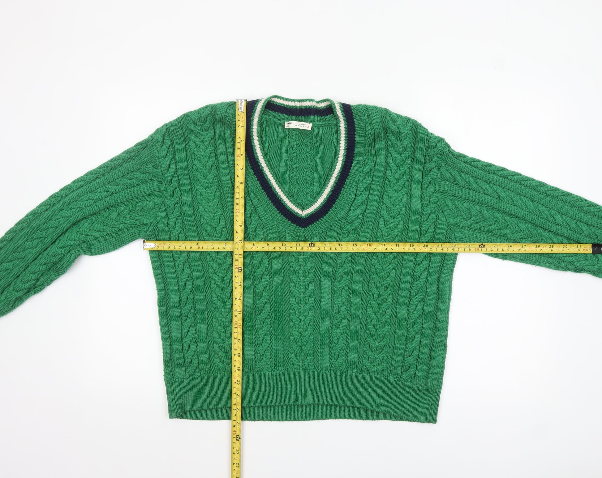 Add a touch of preppy sophistication to your wardrobe with this Pull & Bear women's green cable knit jumper. Crafted from 100% cotton, this lightweight knit offers exceptional comfort and breathability, perfect for layering during the cooler autumn and winter months. The striking V-neckline is accentuated by contrasting navy and white trim, giving the jumper a sporty, collegiate feel that flatters a wide range of casual looks. Finished with long sleeves and ribbed cuffs and hem for an elegant fit, this jumper makes a timeless addition to your knitwear collection. The vibrant green shade adds a refreshing pop of colour to any outfit, while the classic cable-knit pattern enhances its texture and style. Ideal for everyday wear, whether dressed up with a crisp shirt underneath for a business-casual look or paired with jeans and boots for effortless weekend styling. Pull & Bear is known for its youthful, on-trend designs that combine quality fabrics with relaxed modern details, and this jumper perfectly represents that philosophy. In excellent pre-loved condition with no visible flaws, it's ready to become a staple piece you’ll reach for throughout the season. With its regular fit and machine-washable cotton composition, this jumper offers a balance of practicality, comfort, and timeless style that makes it ideal for everyday wear, travel, or casual outings.