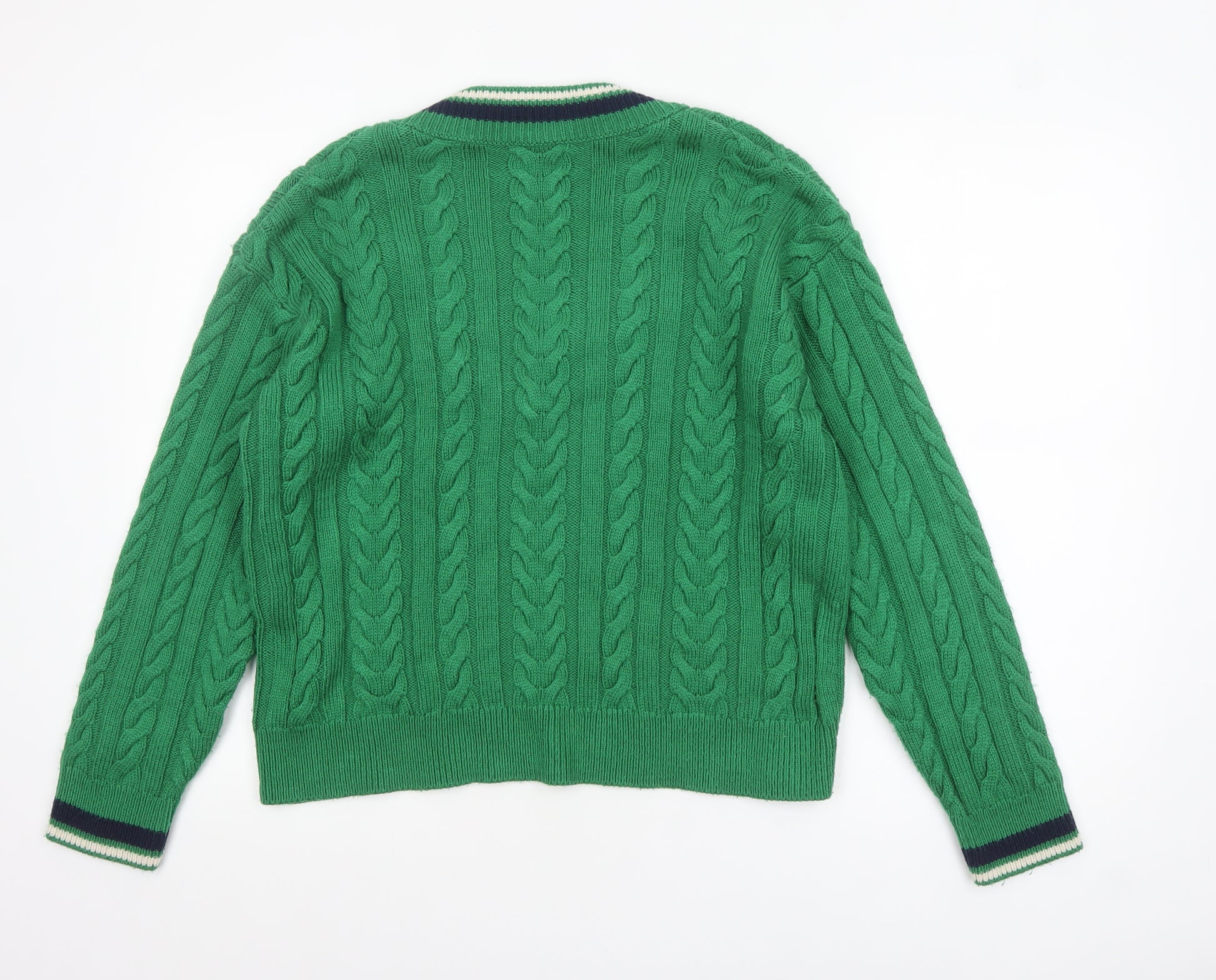 Women's Green V-Neck Cable Knit Cotton Jumper Size 8