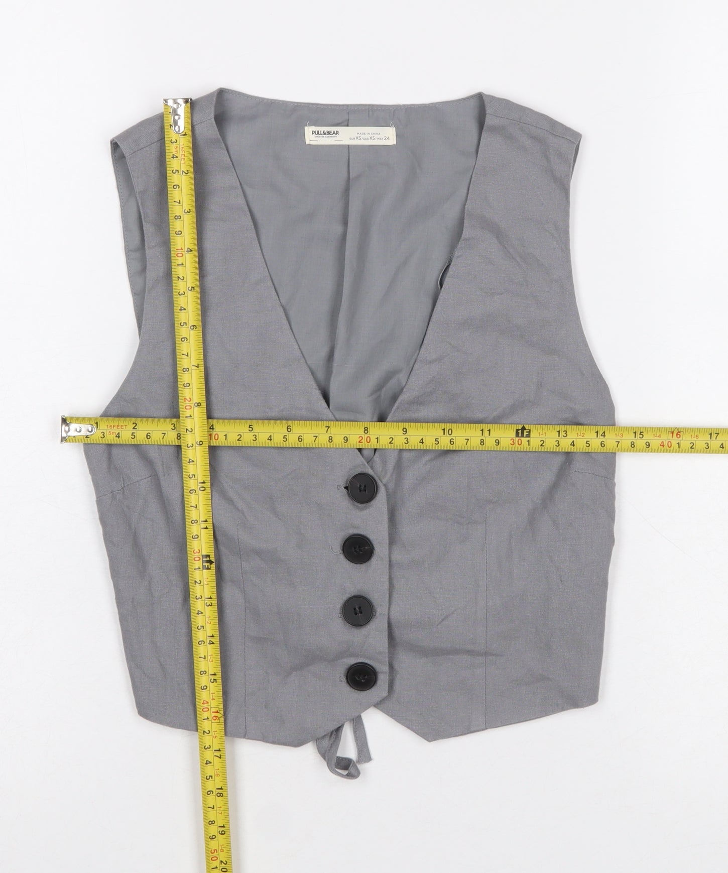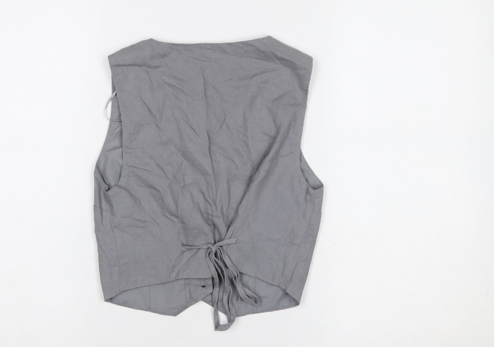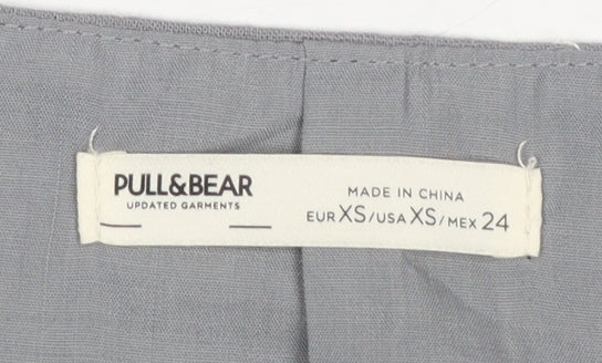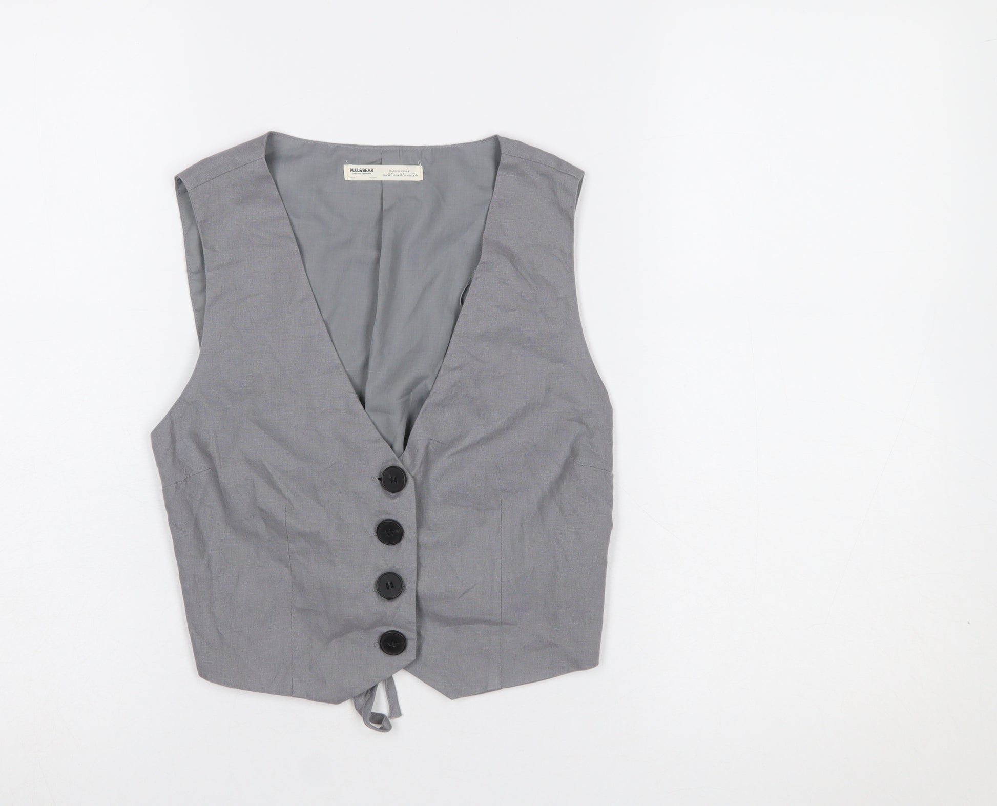 Add a touch of refined simplicity to your wardrobe with this Pull&Bear women's grey waistcoat in size XS. Designed for versatile styling, this sleek sleeveless piece features a tailored silhouette with front button fastening and an adjustable back tie for a flattering fit. The structured design and clean lines make it a perfect layering piece whether worn over a blouse for polished workwear or paired casually over a tee for relaxed weekend looks.Crafted from a durable blend of polyester and cotton, the fabric offers lightweight comfort and a smooth, crisp texture that maintains its shape throughout the day. The waistcoat is fully lined with soft polyester for added comfort, ensuring a smooth fit over other garments. Its neutral grey colour lends itself effortlessly to coordinating with a variety of ensembles, making it an essential addition to any modern wardrobe.Finished with four large front buttons and subtle panel stitching, the design captures Pull&Bear’s signature mix of contemporary and classic influences. Perfect for transitional seasons like spring and autumn, this waistcoat offers easy wearability for a variety of occasions—from casual day wear to smart-casual outfits for meetings or social events.In excellent pre-owned condition with minimal signs of wear, this item has been well cared for and shows only light wrinkling from storage. A stylish and versatile piece at a great price, this Pull&Bear waistcoat combines affordability and trend-led design that can adapt to any outfit with ease. An ideal pick for those who appreciate minimalist style and practicality in everyday fashion.