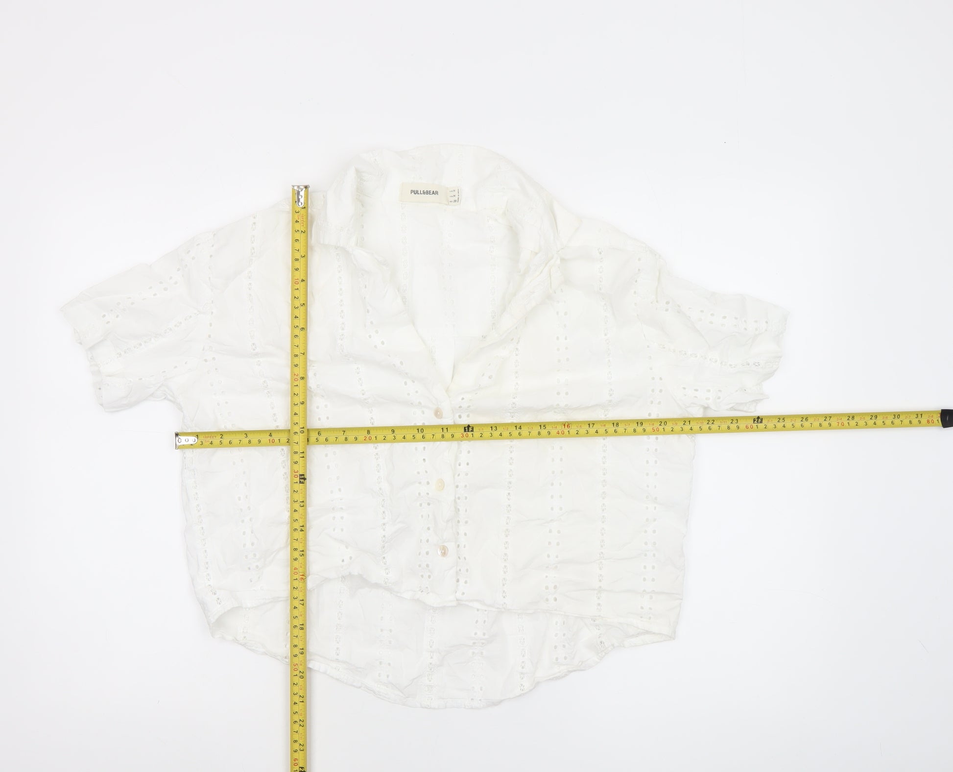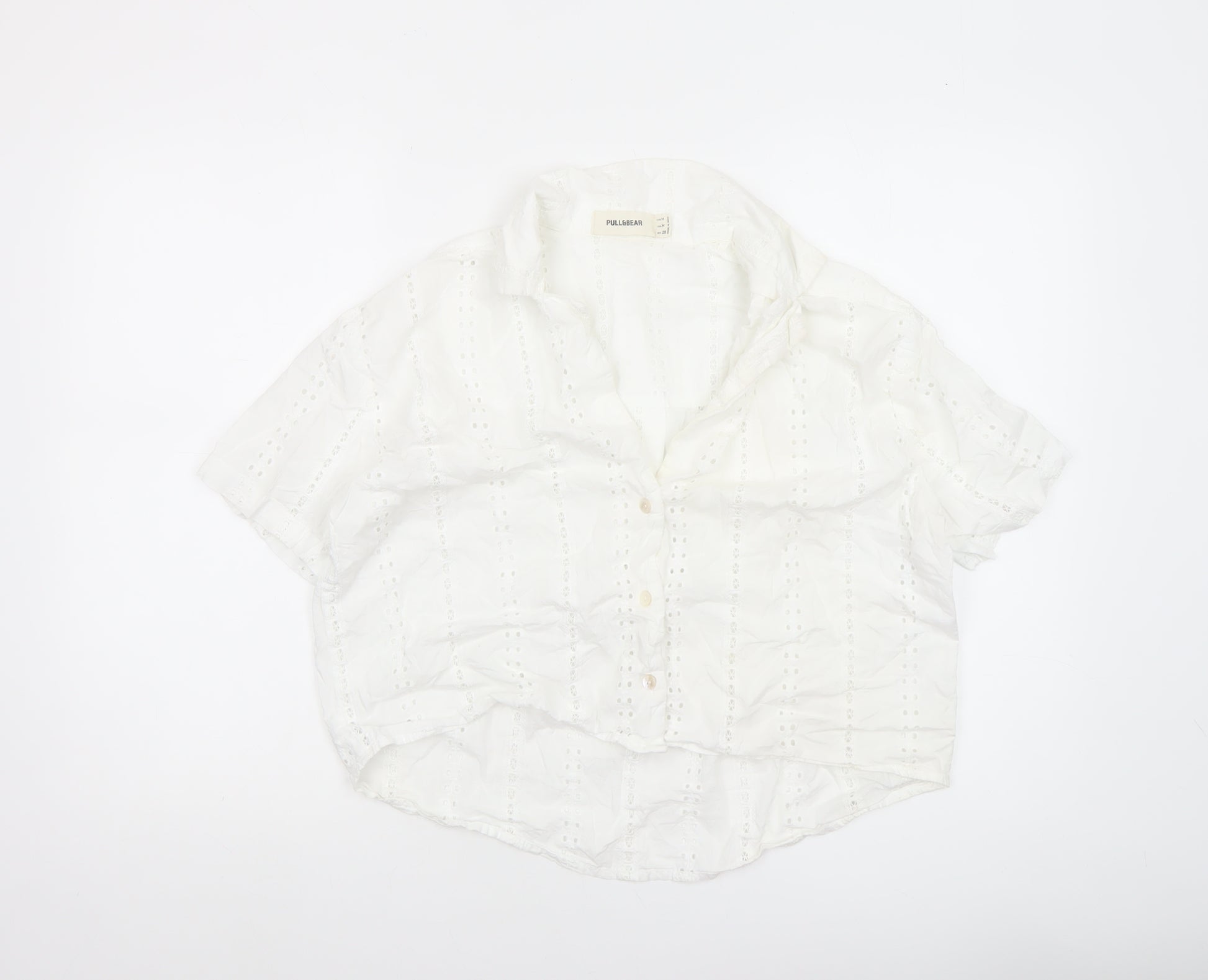 Step into effortless summer elegance with this Pull&Bear women's white cotton cropped blouse. Designed with a fresh, breathable eyelet lace pattern, this stylish blouse is perfect for warm, sunny days. Its lightweight 100% cotton fabric makes it comfortable and airy, while the collared neckline and button front bring a touch of classic sophistication with a modern cropped twist. Featuring a regular fit and short sleeves, this blouse pairs seamlessly with high-waisted jeans, skirts or shorts for a chic feminine look that transitions easily from daytime casual to evening holiday wear. The detailed embroidery accent adds subtle texture and charm, and its crisp white tone evokes an easy-going coastal vibe suitable for both city breaks and seaside getaways. Versatile enough to be styled open over a tank or buttoned up for a polished finish, it’s a wardrobe staple that embodies laid-back style with timeless appeal. Perfect for spring and summer occasions, from brunches and strolls to relaxed gatherings, this Pull&Bear blouse offers both comfort and effortless fashion. In excellent pre-loved condition, showing minimal signs of previous wear, it retains a soft feel and neat structure throughout. This flattering cropped cut accentuates the waist while maintaining a relaxed silhouette, making it ideal for versatile casual styling. Whether worn tucked in or loose, it gives a carefree yet refined look that fashion lovers will appreciate. Make this easy-to-style blouse your go-to choice for everyday wear, travel, or light layering – a true essential for the modern woman who values comfort and understated beauty.
