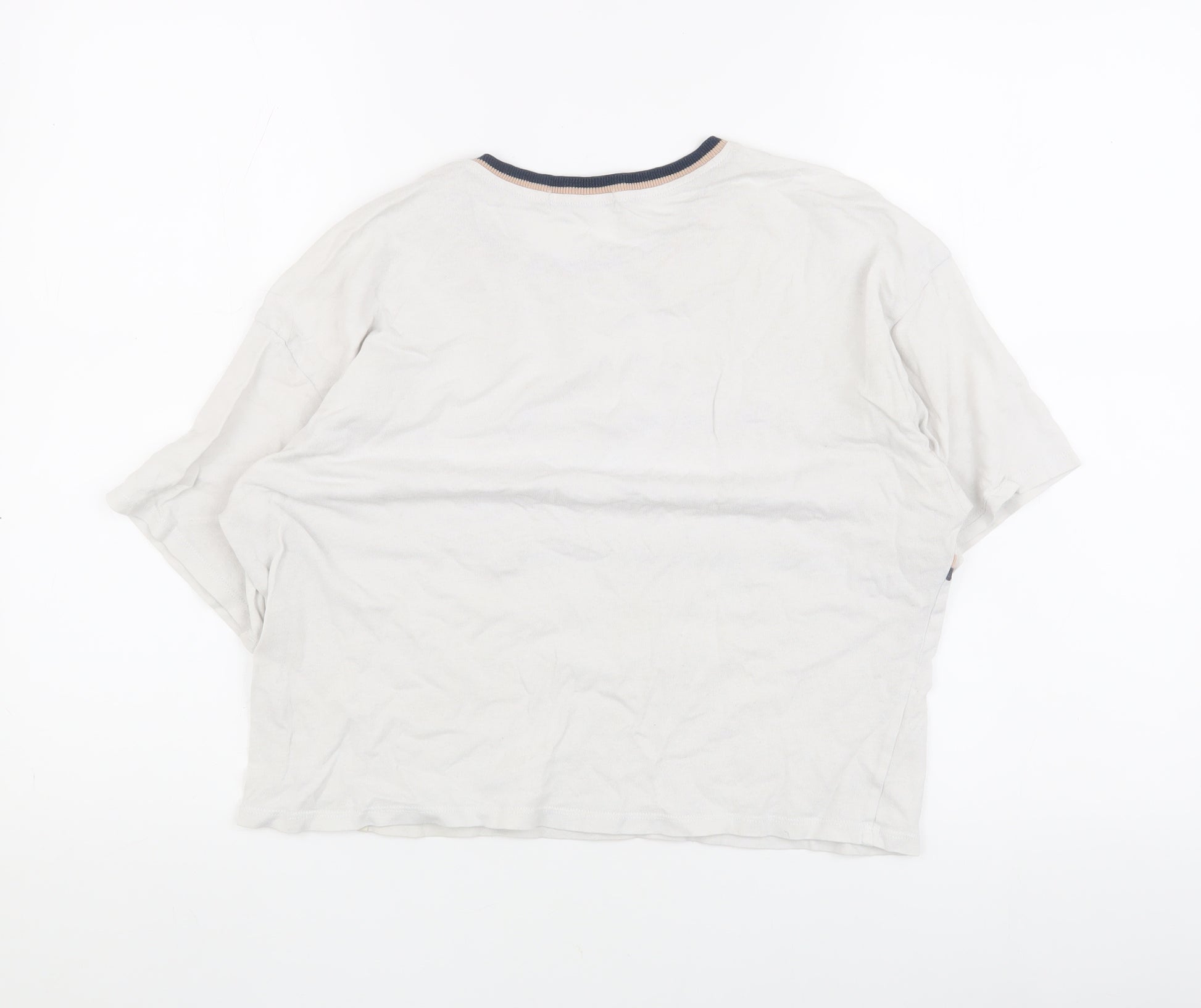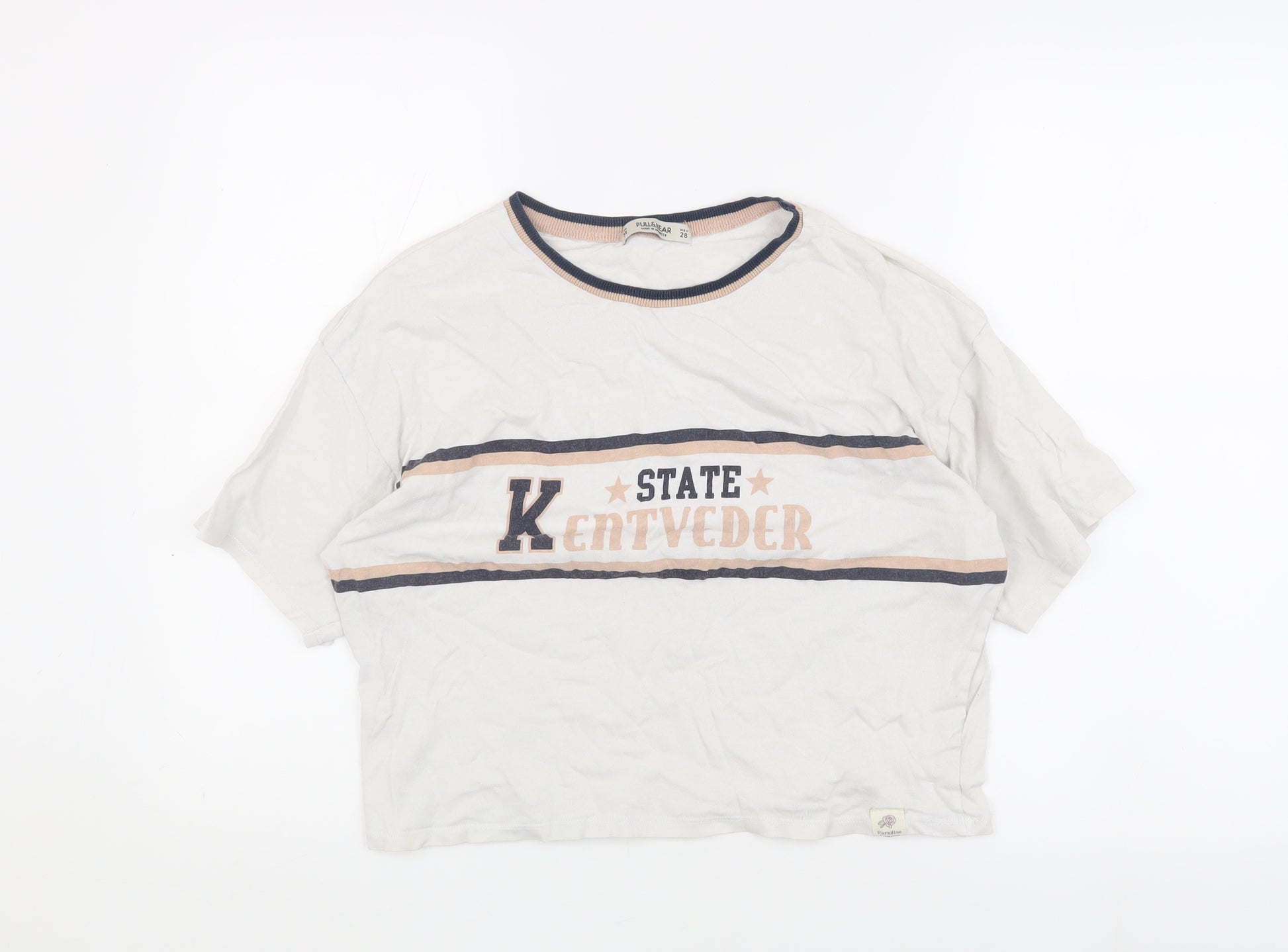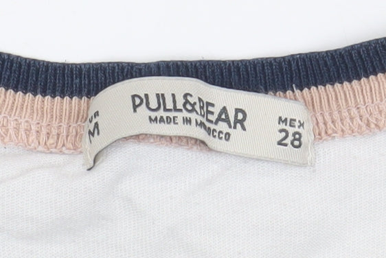Upgrade your casual wardrobe with this chic Pull & Bear Cropped T-Shirt, perfectly blending comfort and trendiness. Crafted for women, this short-sleeve top is a versatile piece for your spring and summer outings. Made from soft cotton jersey, it provides breathable comfort all day long. Featuring a solid white colour, it acts as a blank canvas for your styling creativity. The relaxed fit and crew neckline offer classic appeal, while the embroidered 'Kentveder' text showcases a college theme that adds a playful touch. Whether you're lounging or stepping out for a coffee date, this regular-size top makes a casual yet stylish statement. Pair it with high-waisted jeans or a skirt for an effortlessly chic look. Embrace the casual vibe and express your style with this beautifully crafted Pull & Bear tee.