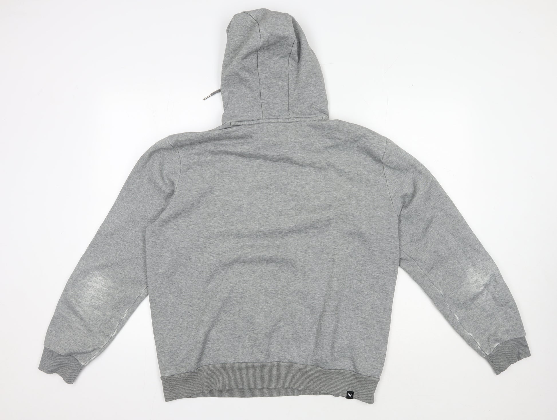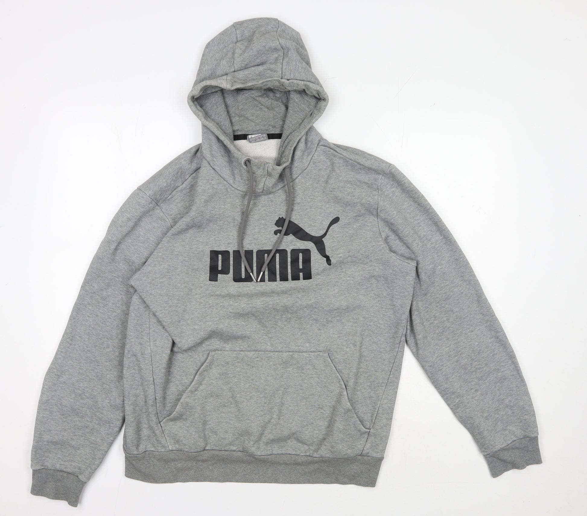 Elevate your casual wardrobe with this sleek grey Puma pullover hoodie, designed for men who appreciate both comfort and style. The hoodie features a classic crew neck style, with a bold Puma logo accenting the front, amplifying your sense of fashion. Made from a high-quality blend of 66% cotton and 34% polyester, it promises excellent durability and comfort, perfect for everyday wear. The regular fit ensures you can layer it over t-shirts effortlessly, making it suitable for all seasons. Featuring long sleeves and a practical hood equipped with a drawstring closure, it’s designed to keep you cosy on breezy days. The casual yet trendy grey hue complements all skin tones and offers versatility to match various bottoms, whether jeans or joggers. A front kangaroo pocket adds functionality, ensuring you can keep your essentials close or simply warm your hands. It's also machine washable, ensuring hassle-free care after each wear. Despite some slight wear on the sleeves, this hoodie is in excellent condition, ready to add a sporty yet chic vibe to your look. Don't miss out on owning this iconic piece from Puma that perfectly fuses fashion with athletics.