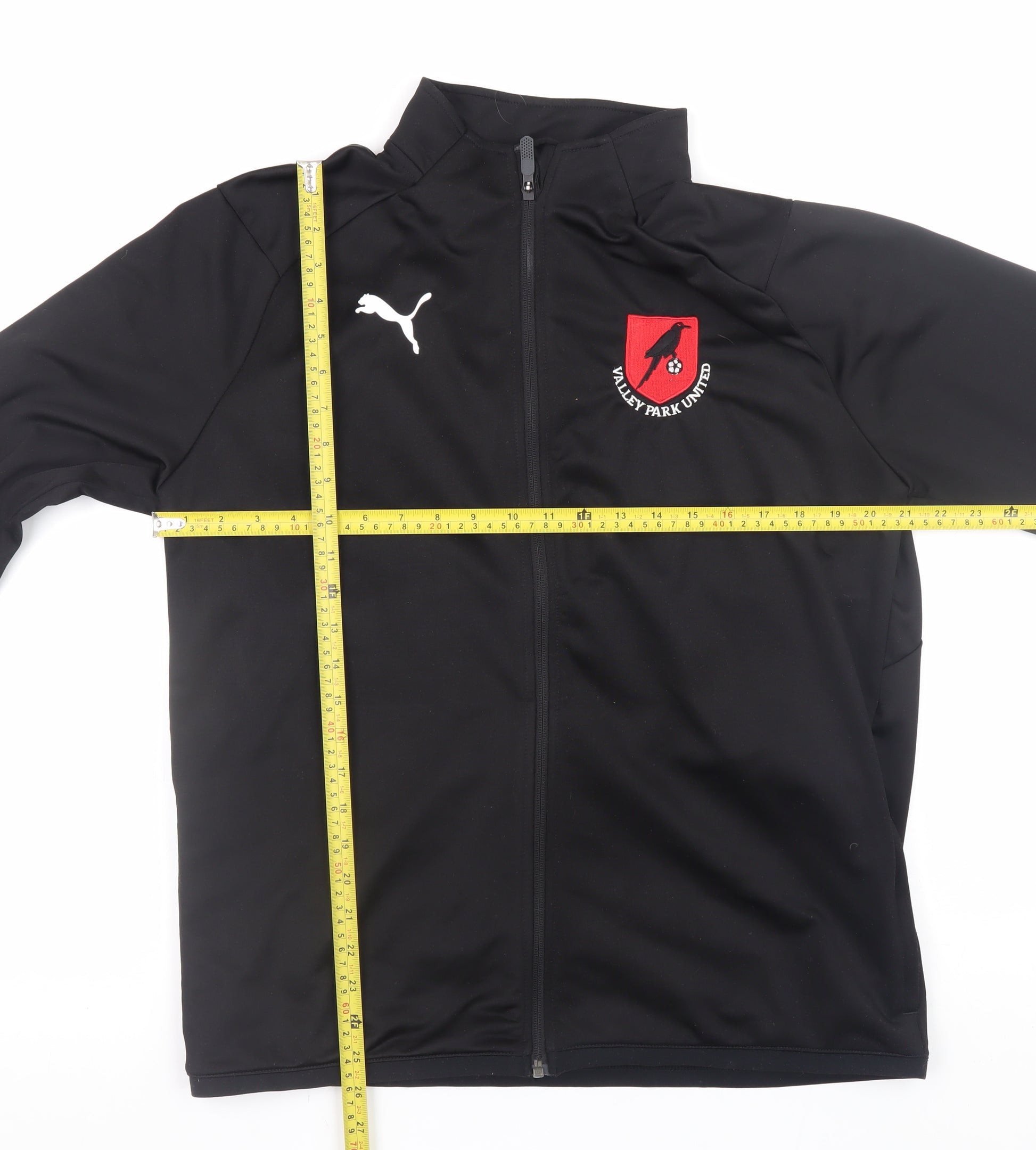 Stay comfortable and stylish during your training sessions with this men’s black football track jacket from Puma. Designed for performance and versatility, this lightweight jacket offers a sleek athletic look along with reliable functionality. Made entirely from durable polyester, the jacket features a smooth jersey fabric that provides both comfort and breathability. The full zip fastening allows for easy wear, while the stand-up collar helps protect against wind and chill. Distinct Puma branding appears on the chest along with an embroidered Valley Park United football crest, adding a sporty touch of authenticity.This men’s size large jacket has a regular fit, ideal for layering over training tops or casual tees. It comes with handy side pockets to keep essentials secure and provide convenience while on the move. Whether you’re heading to the pitch, working out, or enjoying casual downtime, this track jacket ensures you stay at ease without compromising on style.Machine washable for easy care, this jacket is suited for both autumn and spring wear, providing enough coverage for cooler days while still remaining lightweight. The smooth polyester material ensures a comfortable fit that retains its shape and offers resistance to wrinkles. Finished in classic black, this jacket coordinates effortlessly with your existing sportswear collection. A great choice for football training, gym sessions, or everyday casual wear, this Puma track jacket blends quality, practicality, and performance appeal.In excellent used condition with light signs of previous wear but no visible damage, this jacket has been well cared for and remains ready for continued use. Perfect for active men seeking a reliable training layer from a trusted sportswear brand.